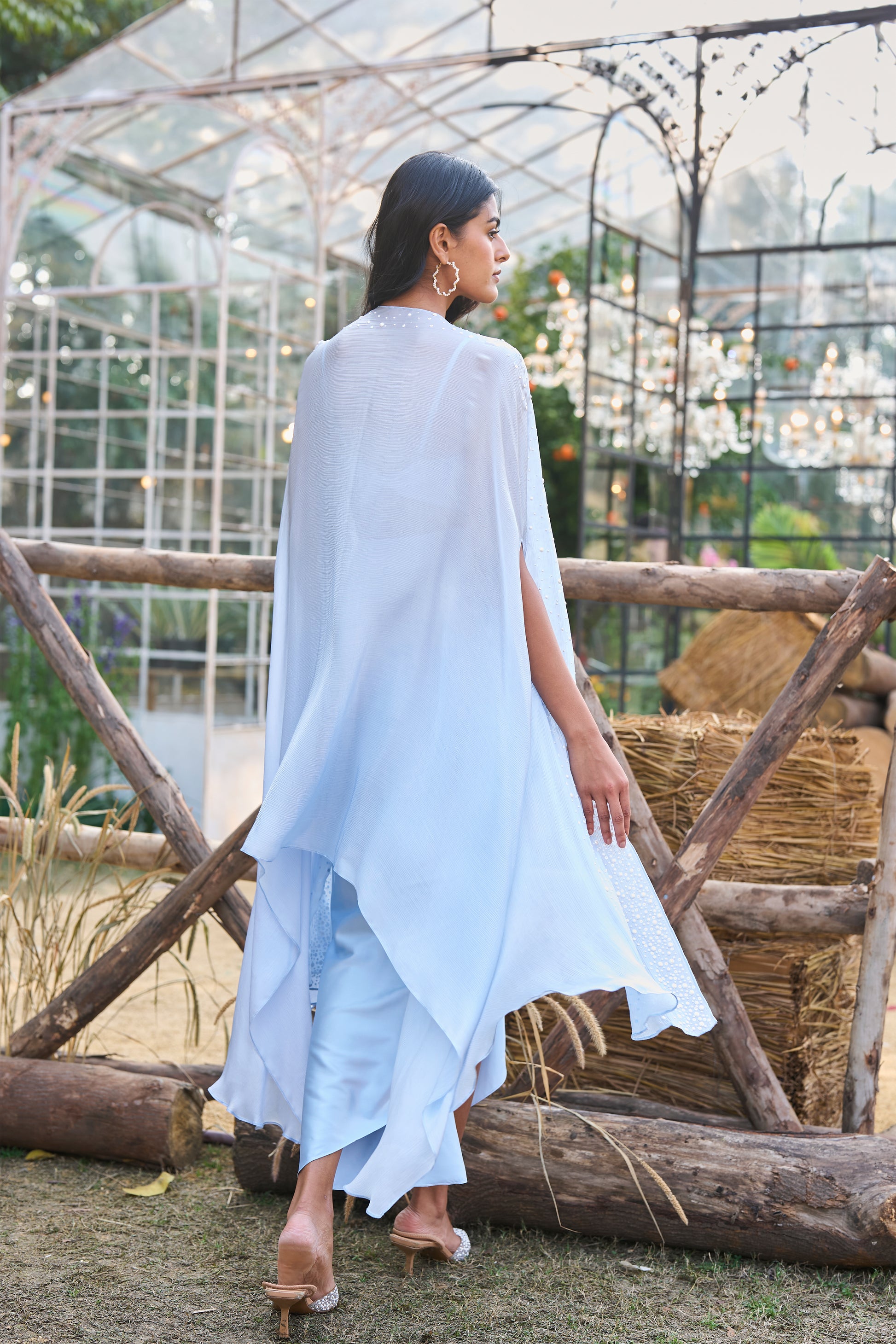Front open powder blue organic viscose cape with pearl and sequin embellishment placed across the front. Variegated-sized pearls create a textured surface. Relaxed, flowy fit. Worn over matching satin bralette with pearl and sequin embellishment placed across the front. Variegated-sized pearls create a textured surface. Soft bandeau neckline with adjustable straps. Concealed zip closure in the side. Paired with matching draped maxi-skirt in fluid satin. Hook/eye and zip closure in the side.