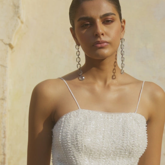 Ivory wide-legged pants with pearl, sequin and bead embroidery placed on a foiled patterned mesh. Semi-elasticated at the waist and has pockets on the side. Hook-eye and zip closure at the front. The garment is fully lined.
