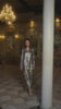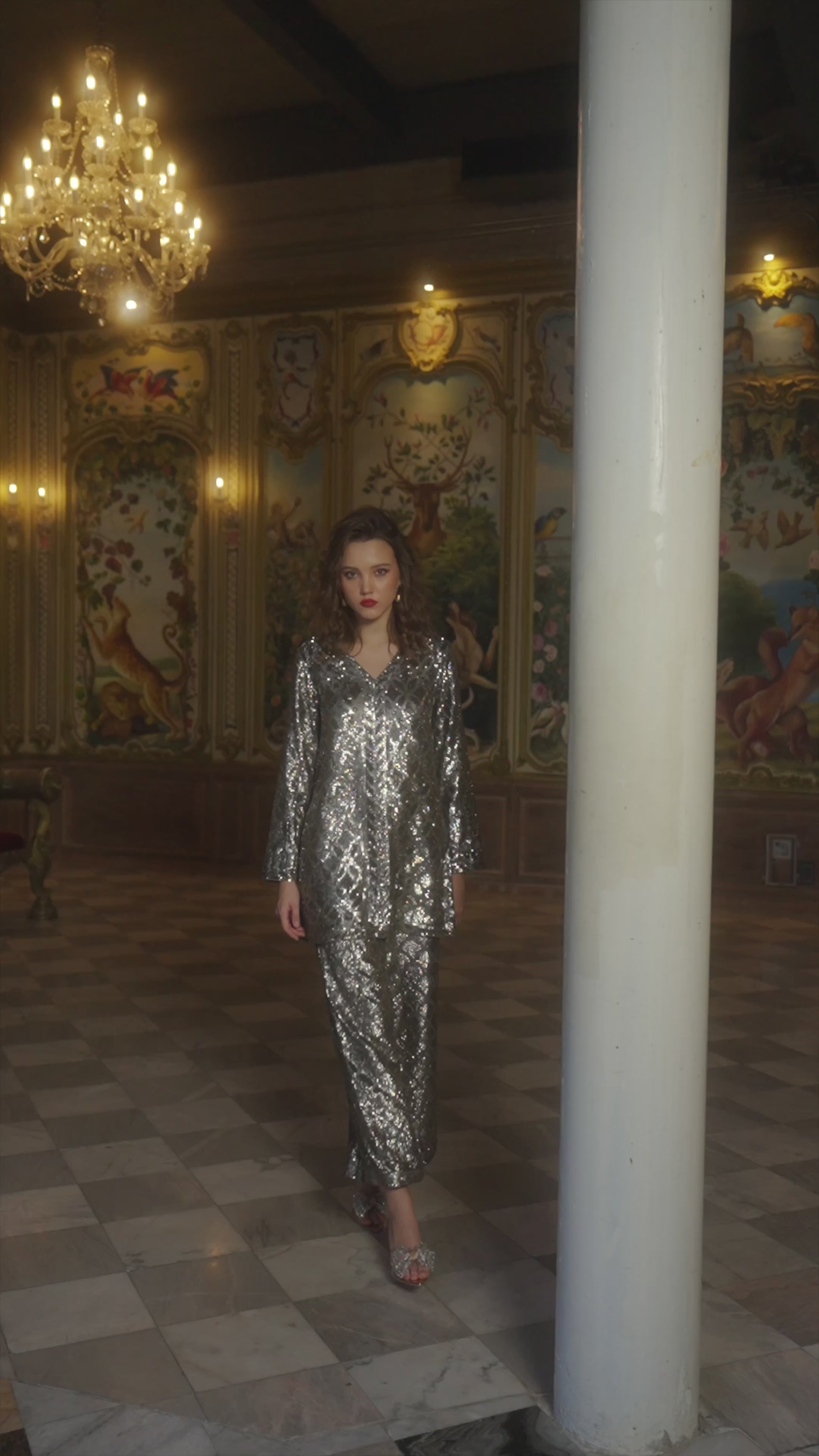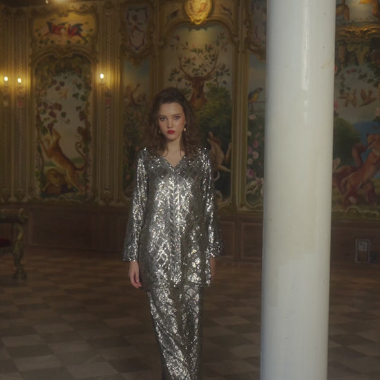 Longline top in pewter sequins in a precise geometric pattern that shimmers in shifting light. Slight A-line shape with slits in the sides. V neck and full length sleeves. Concealed back zip with hook/eye closure. Garment is fully lined. Paired with matching wide-legged pant. Concealed side zip and hook/eye closure. Garment is fully lined.