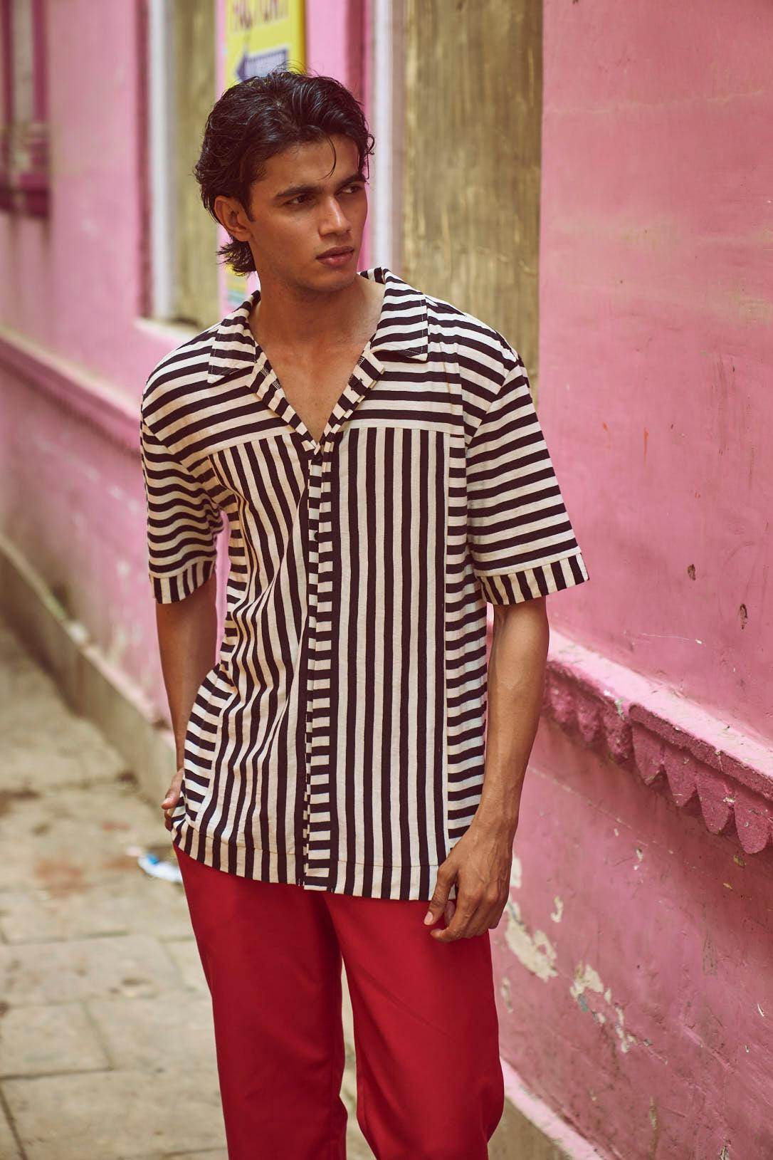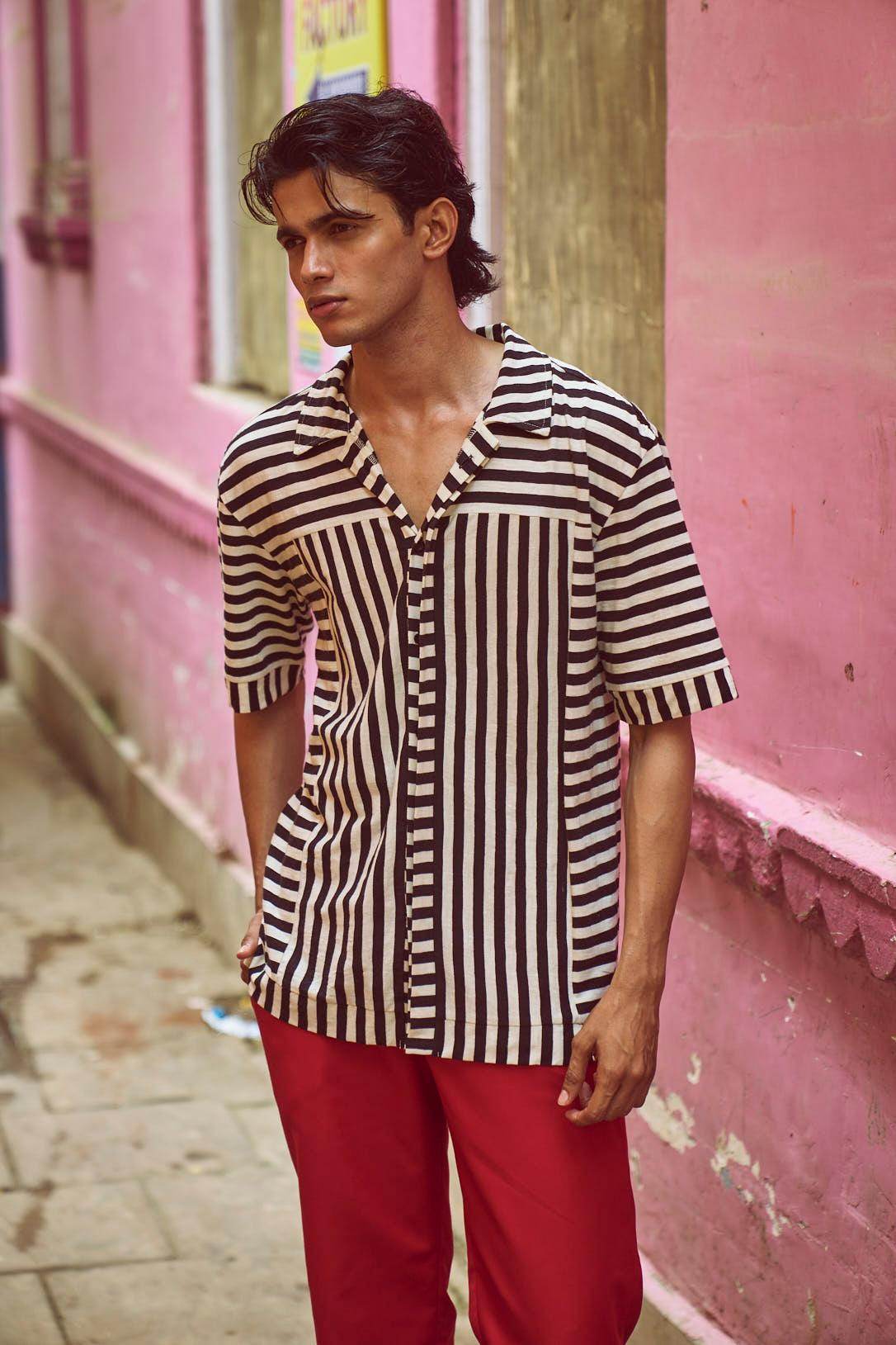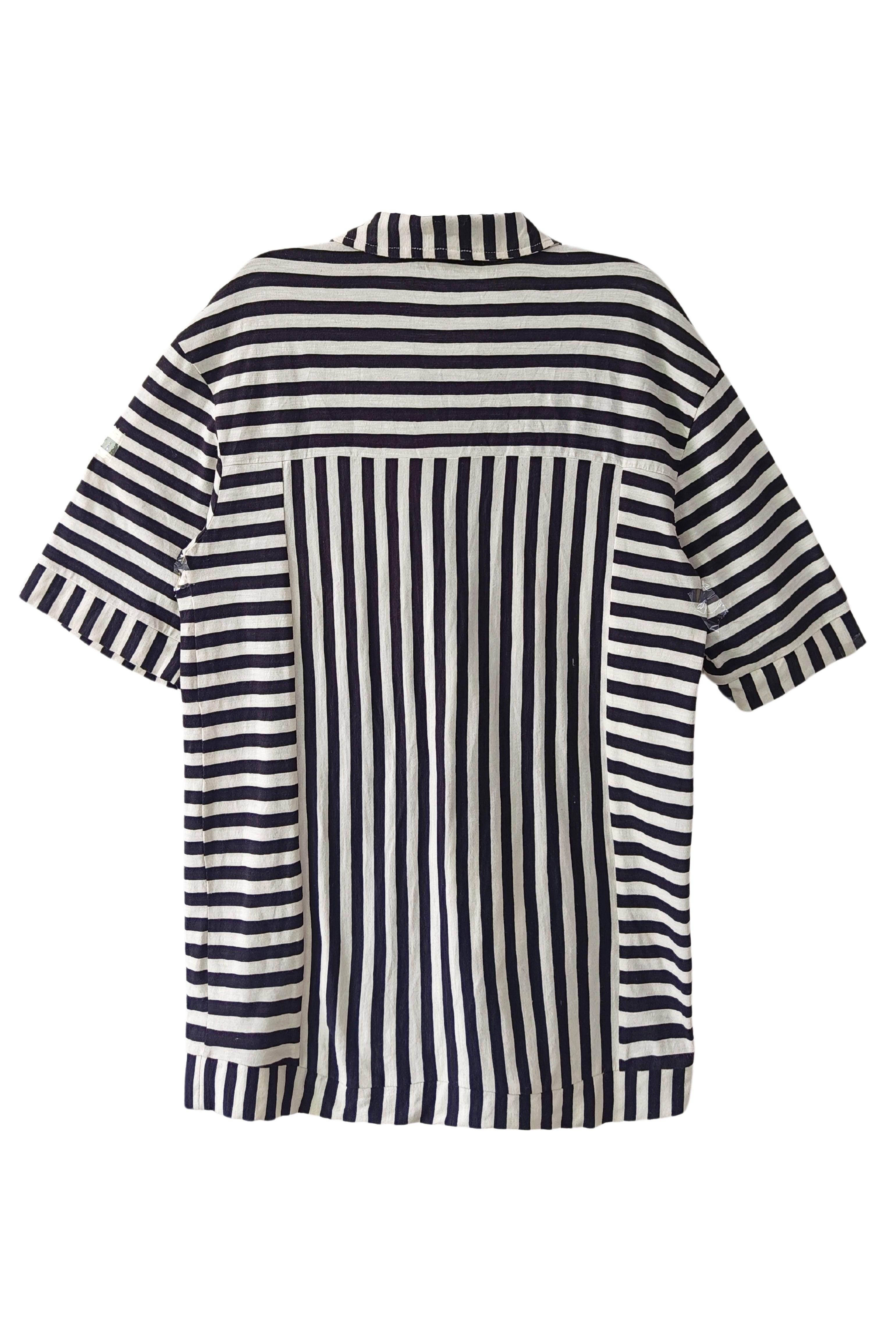 Black and white stripe short-sleeve shirt in knitted fabric. Placement stripes in horizontal and vertical patterns. Concealed placket, half sleeves. Regular fit.