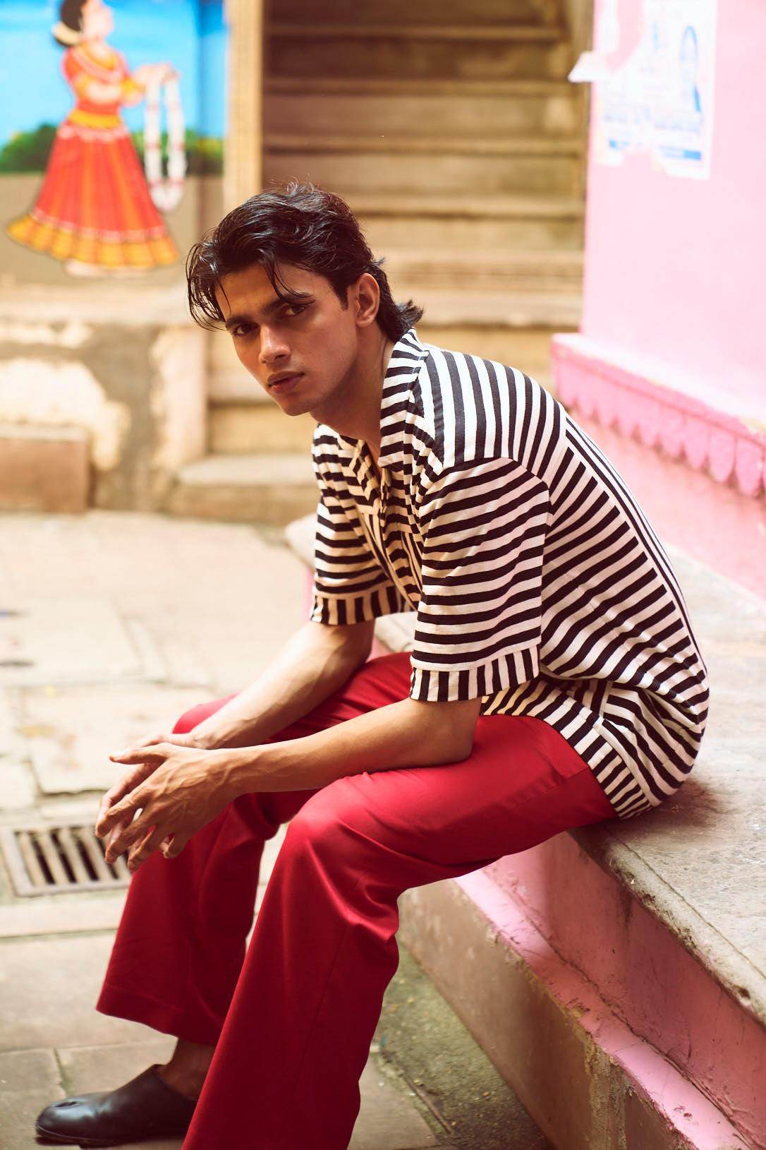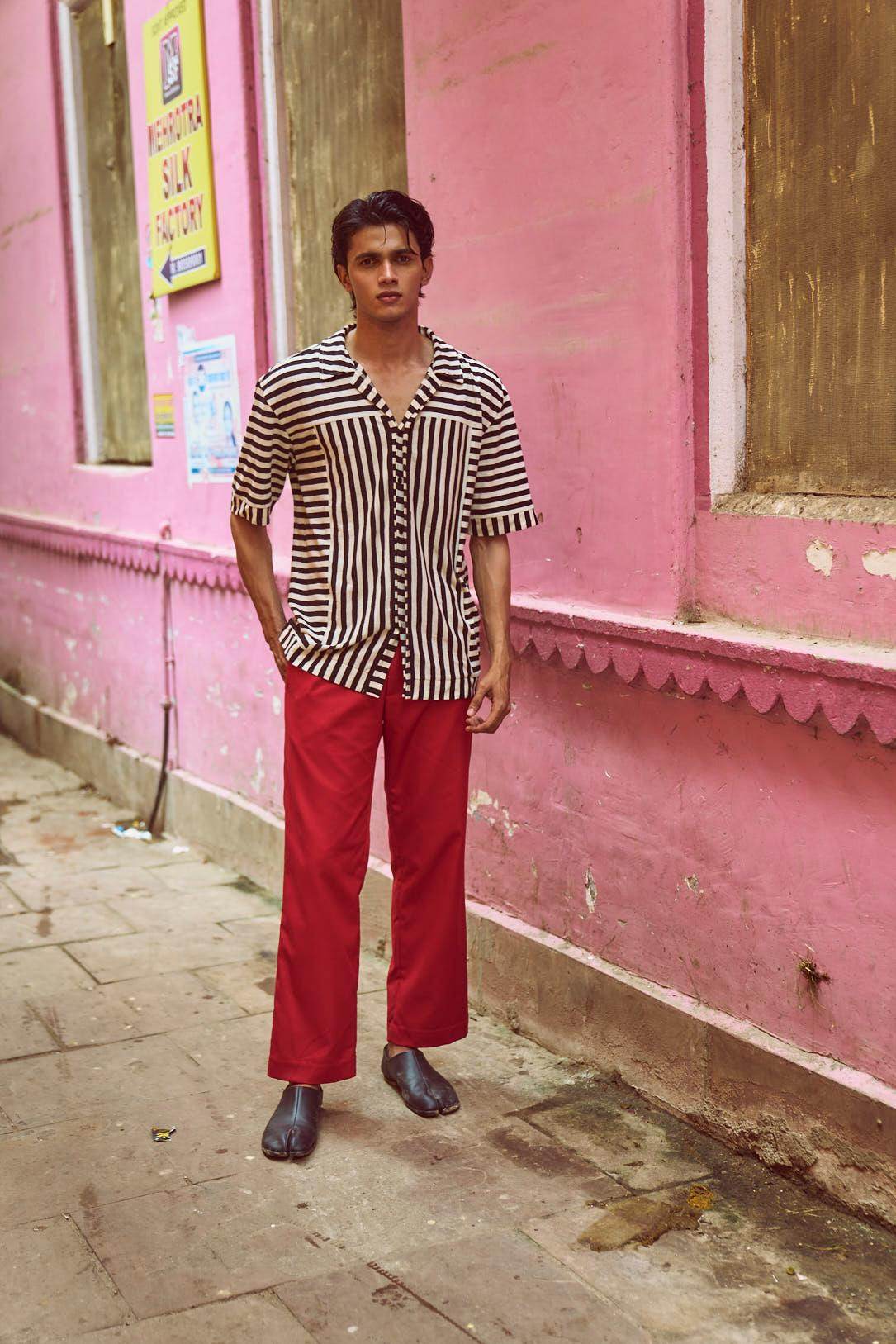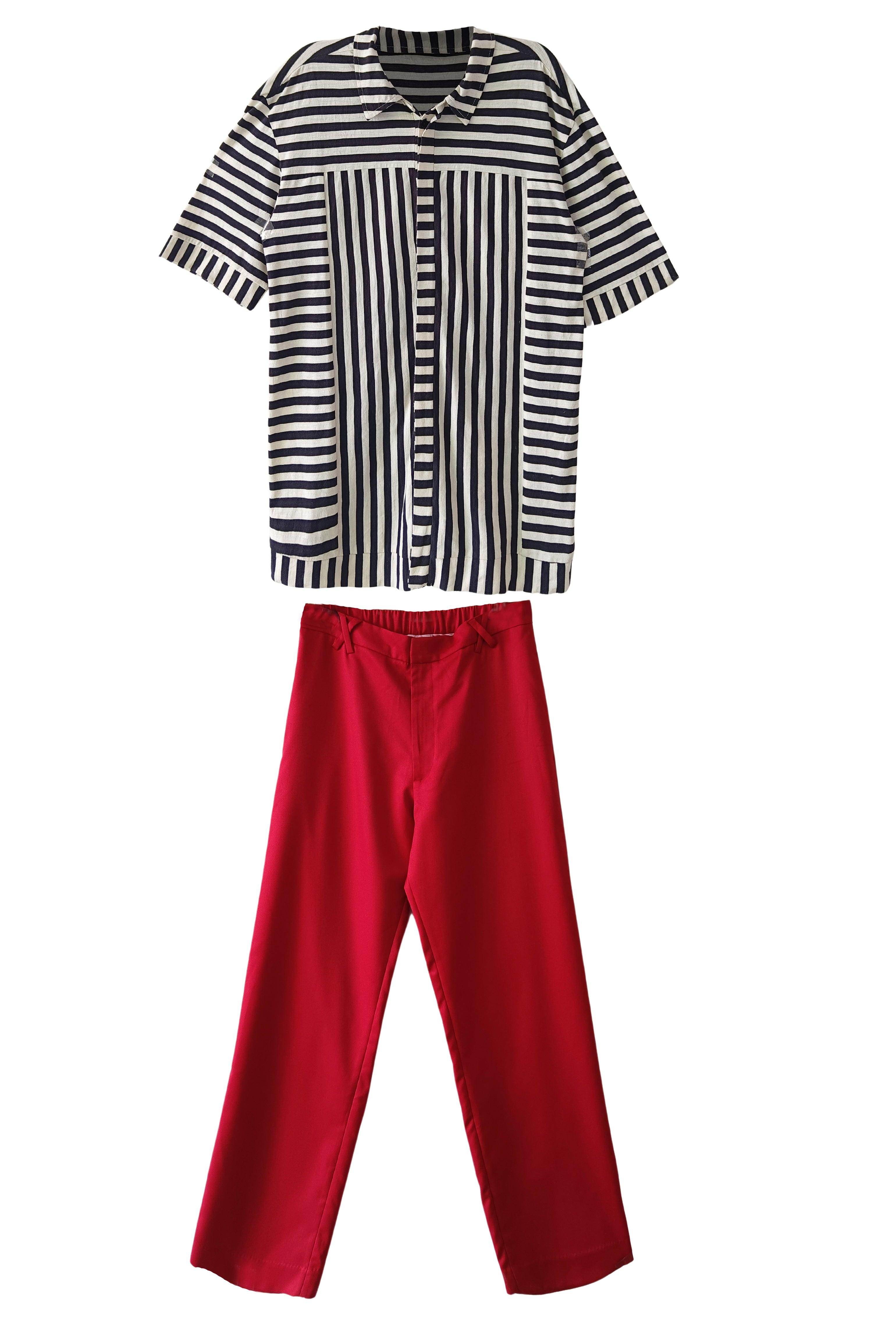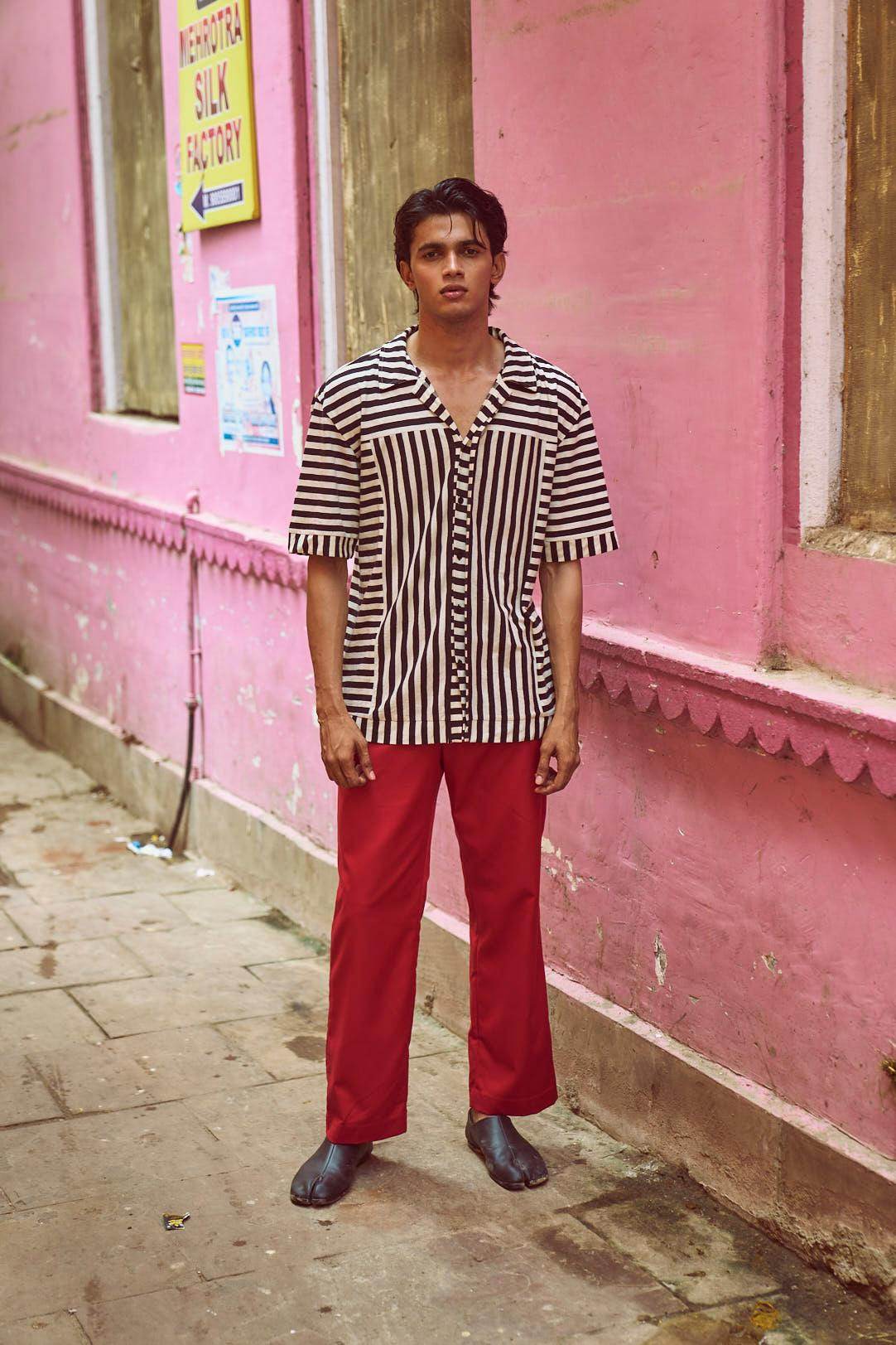 Black and white stripe short-sleeve shirt in knitted fabric. Placement stripes in horizontal and vertical patterns. Concealed placket, half sleeves. Regular fit.