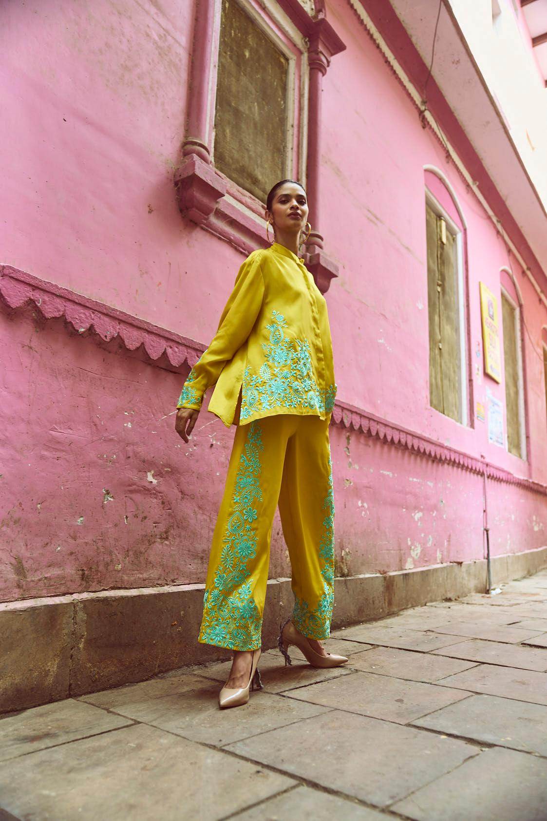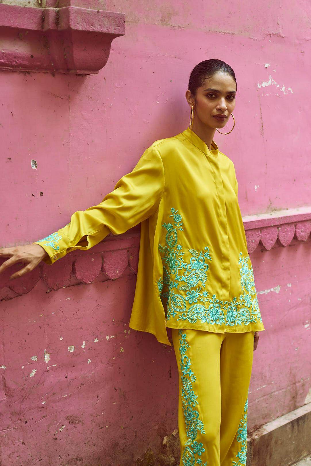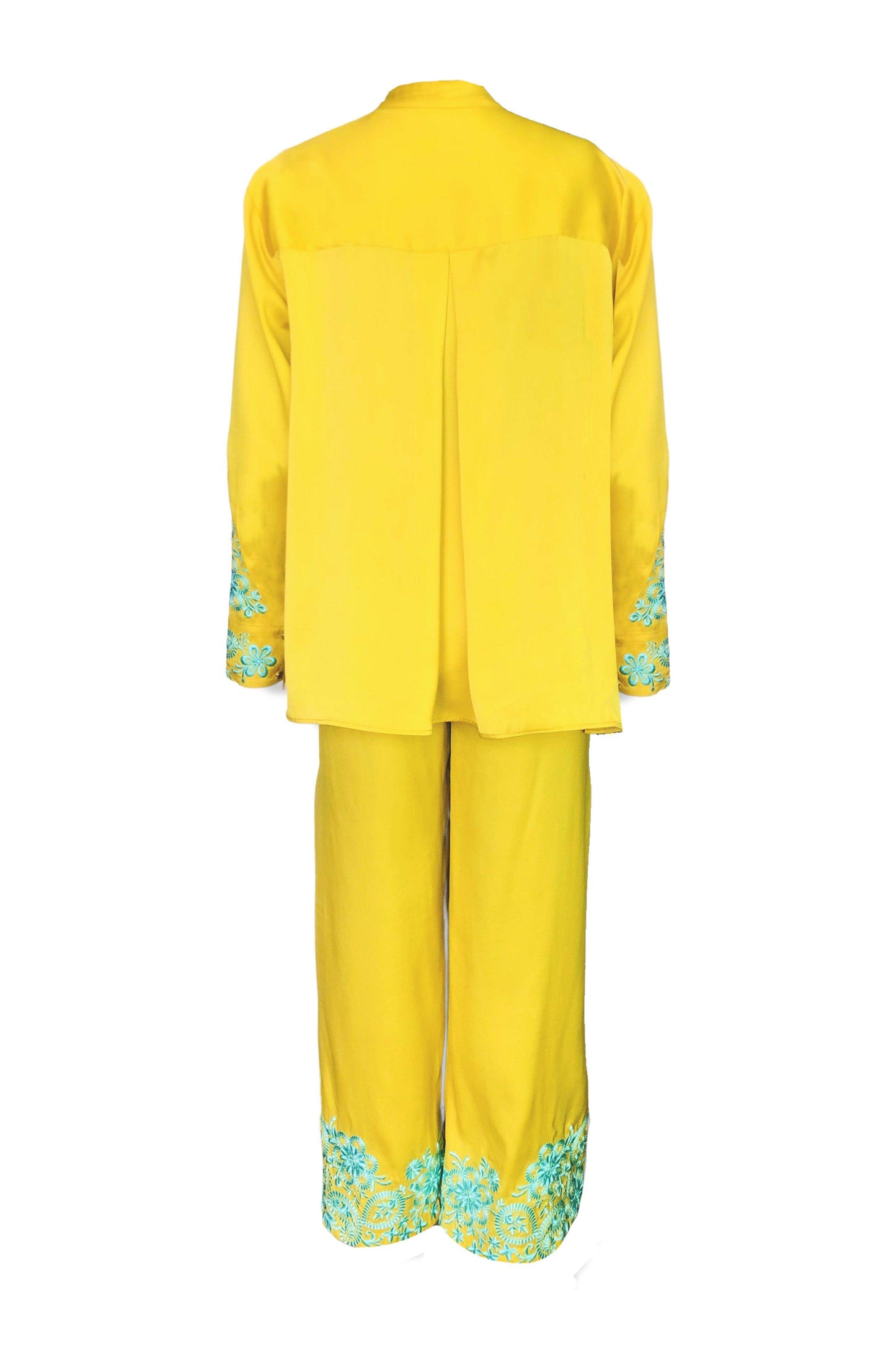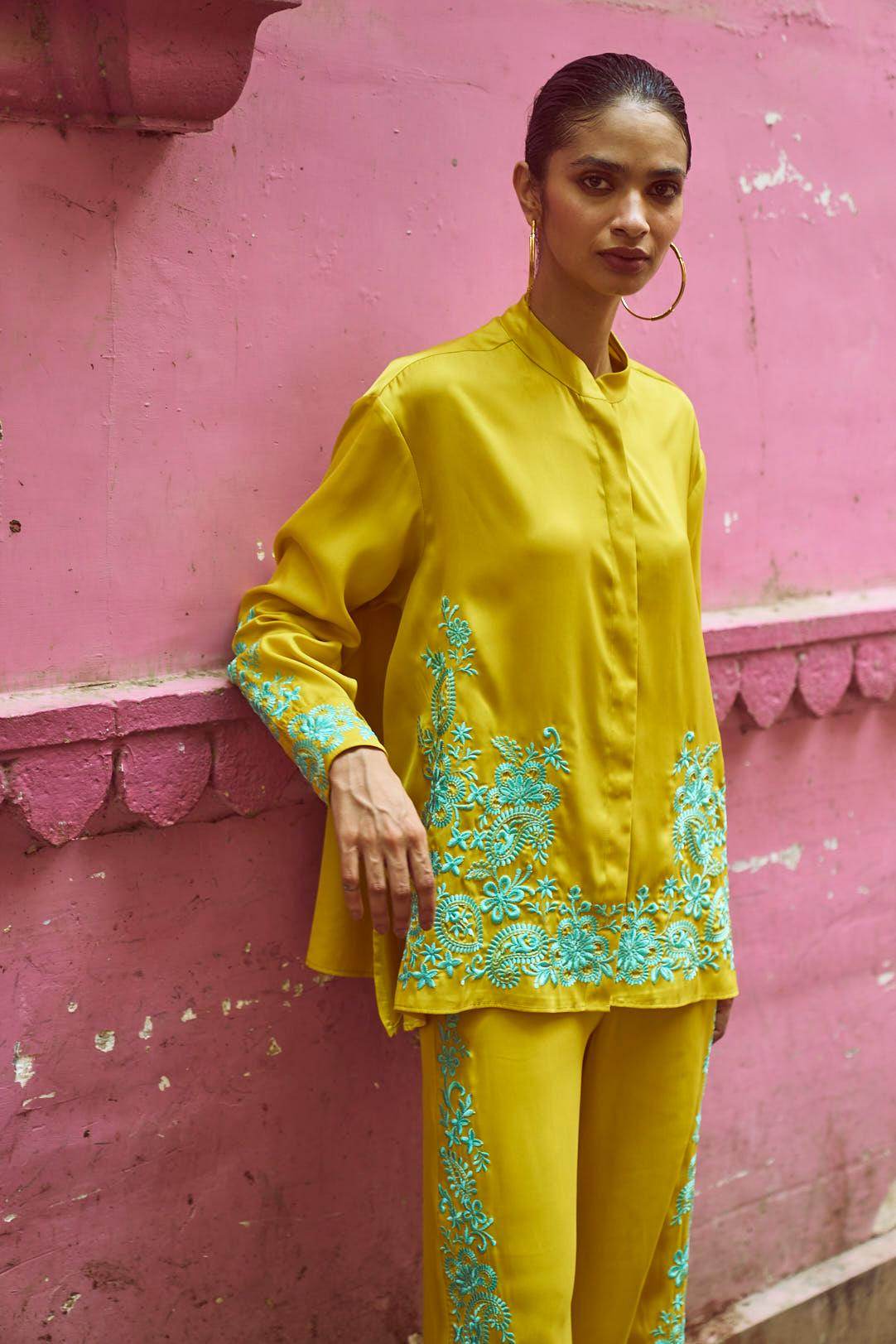 Yellow pant set with placed aqua blue embroidery around the front and side hem and sleeve cuffs of the shirt and at the bottom hem of the pants. Shirt has a band collar and concealed button placket. Slits on the side. Full sleeves. Inverted box pleat at the back for a relaxed fit. Paired with matching pants. Hook and zip closure at the front. Elasticated at the back. Pockets on the side.