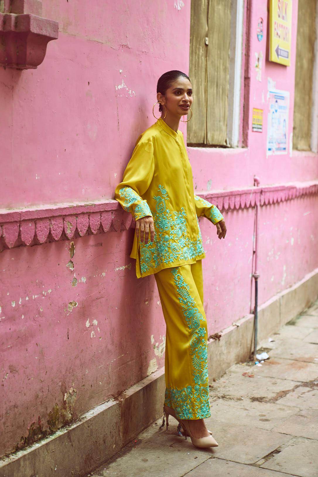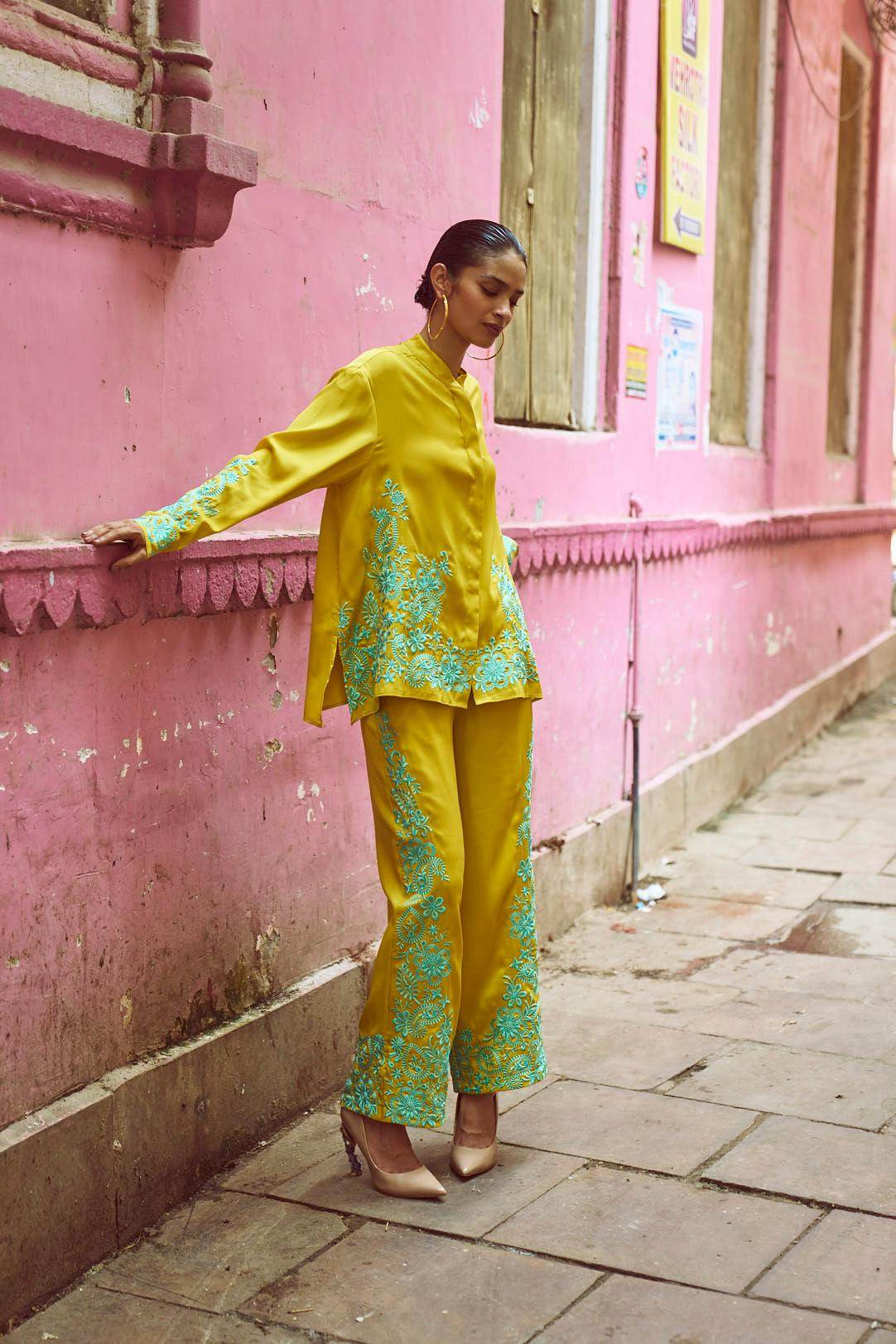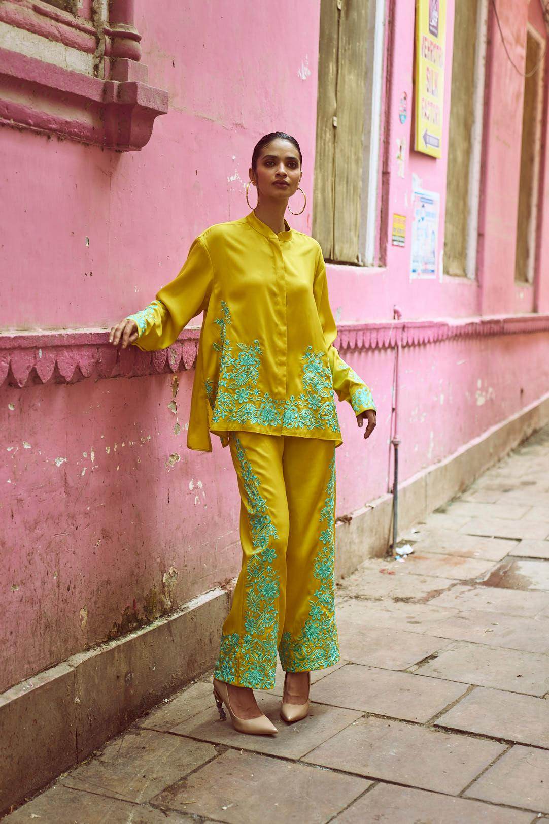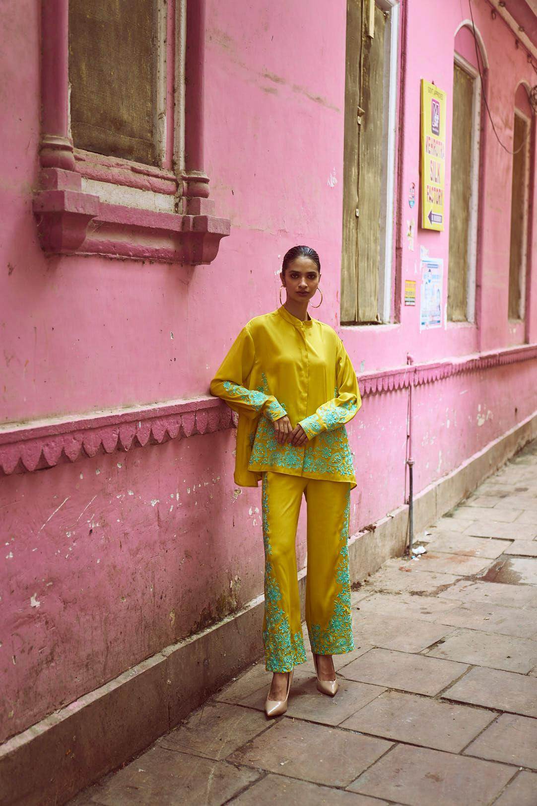 Yellow pant set with placed aqua blue embroidery around the front and side hem and sleeve cuffs of the shirt and at the bottom hem of the pants. Shirt has a band collar and concealed button placket. Slits on the side. Full sleeves. Inverted box pleat at the back for a relaxed fit. Paired with matching pants. Hook and zip closure at the front. Elasticated at the back. Pockets on the side.