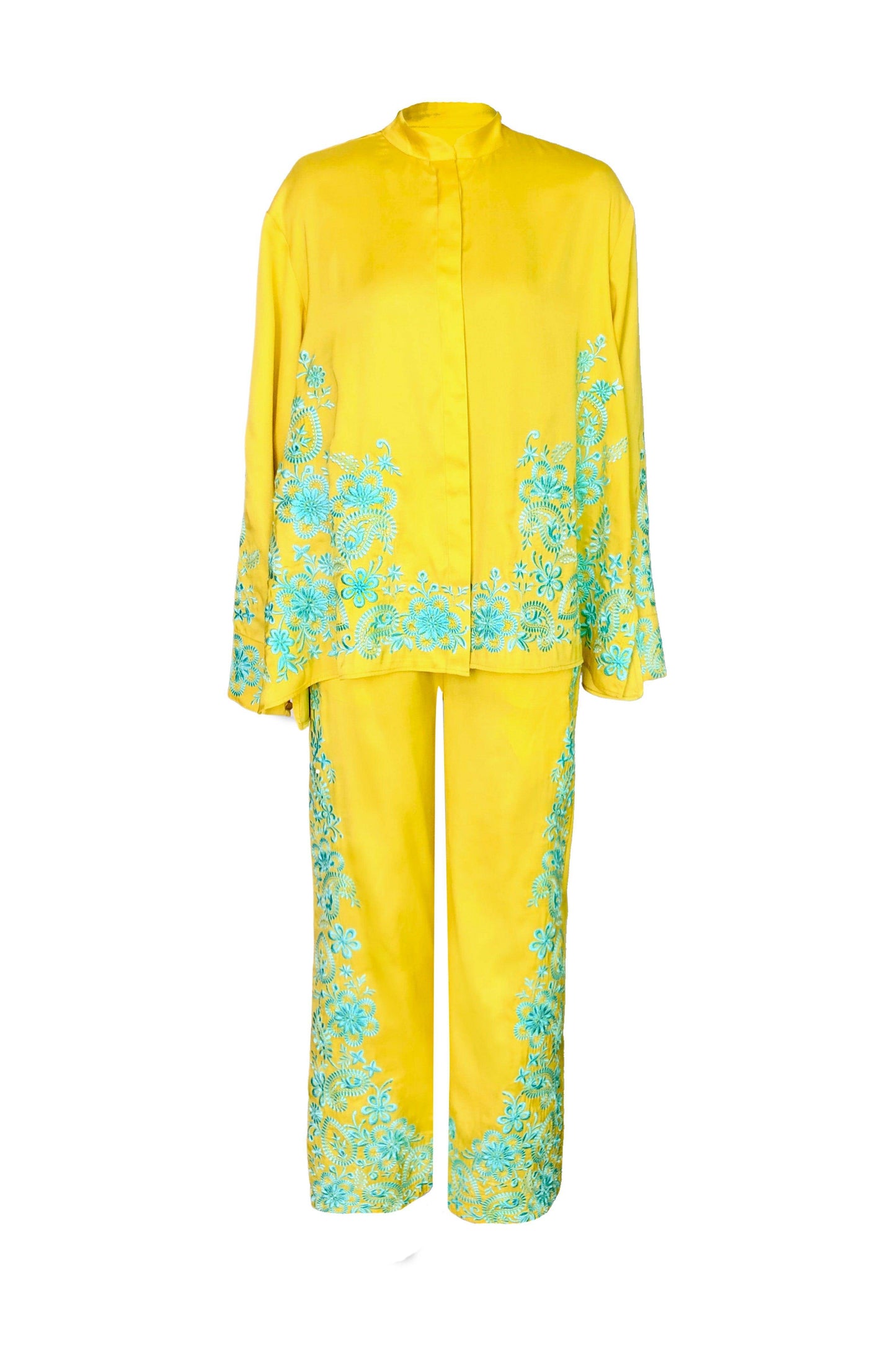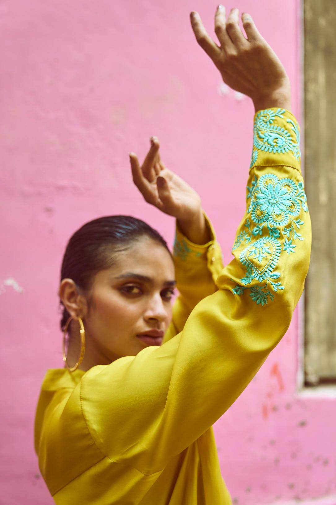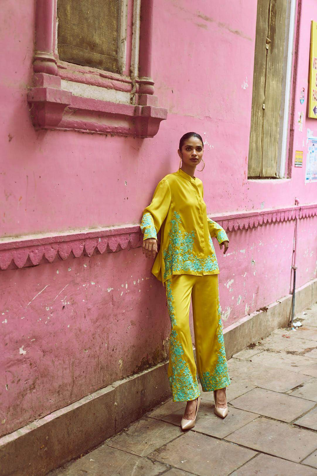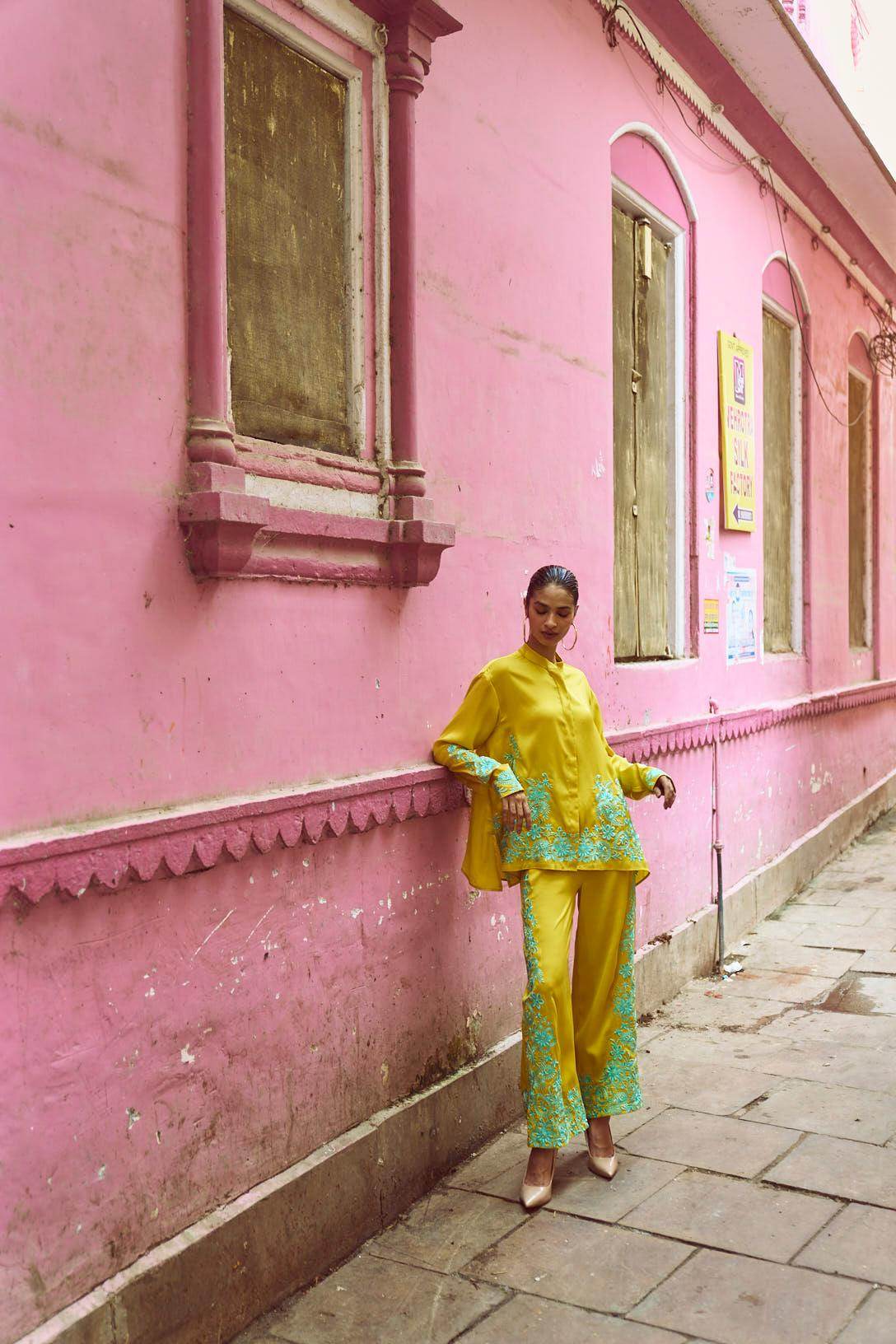 Yellow pant set with placed aqua blue embroidery around the front and side hem and sleeve cuffs of the shirt and at the bottom hem of the pants. Shirt has a band collar and concealed button placket. Slits on the side. Full sleeves. Inverted box pleat at the back for a relaxed fit. Paired with matching pants. Hook and zip closure at the front. Elasticated at the back. Pockets on the side.