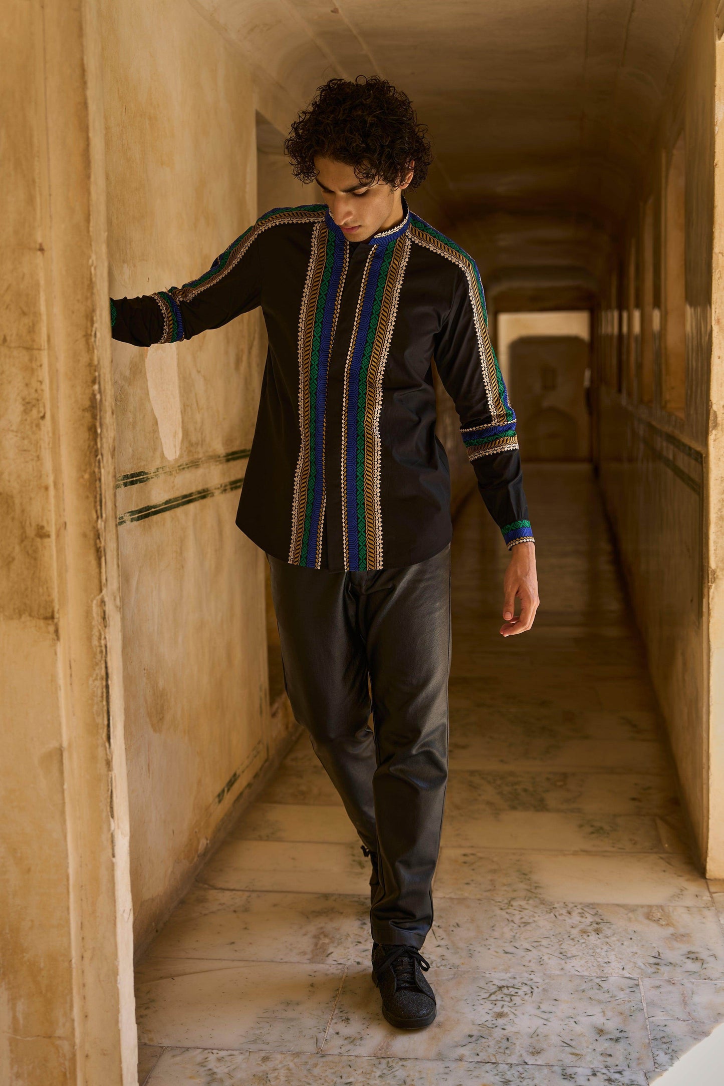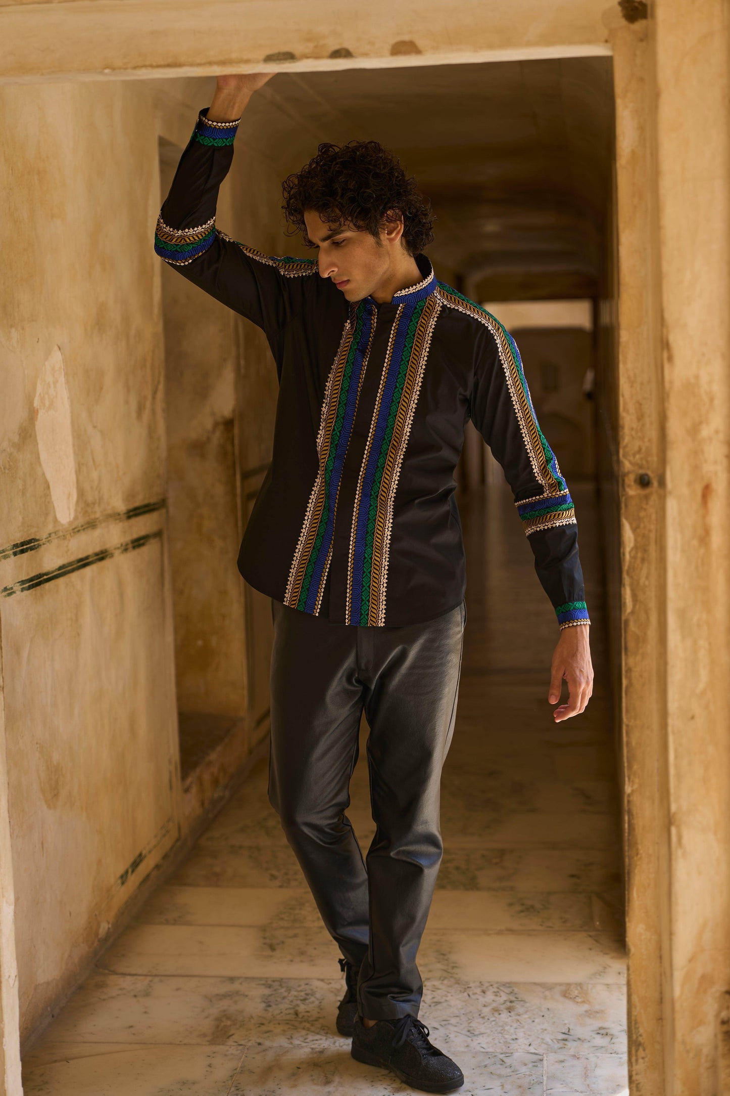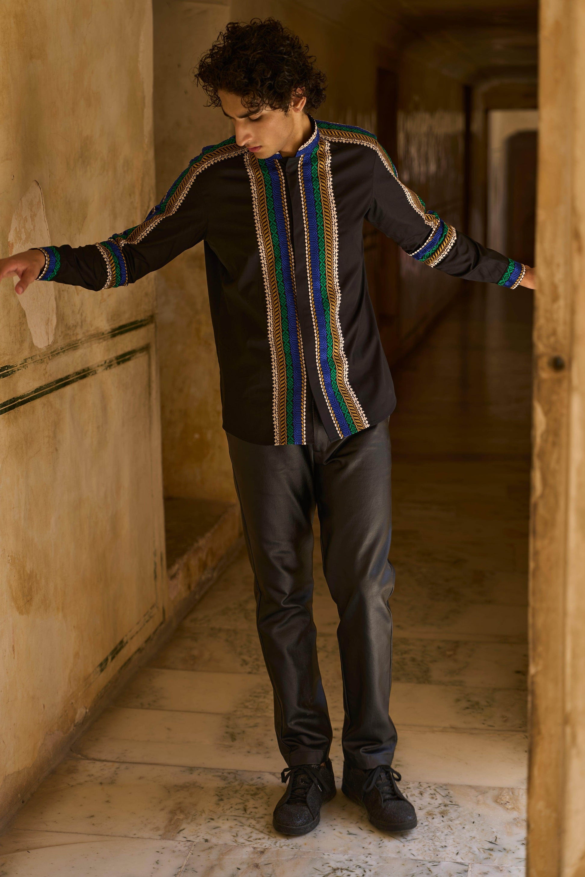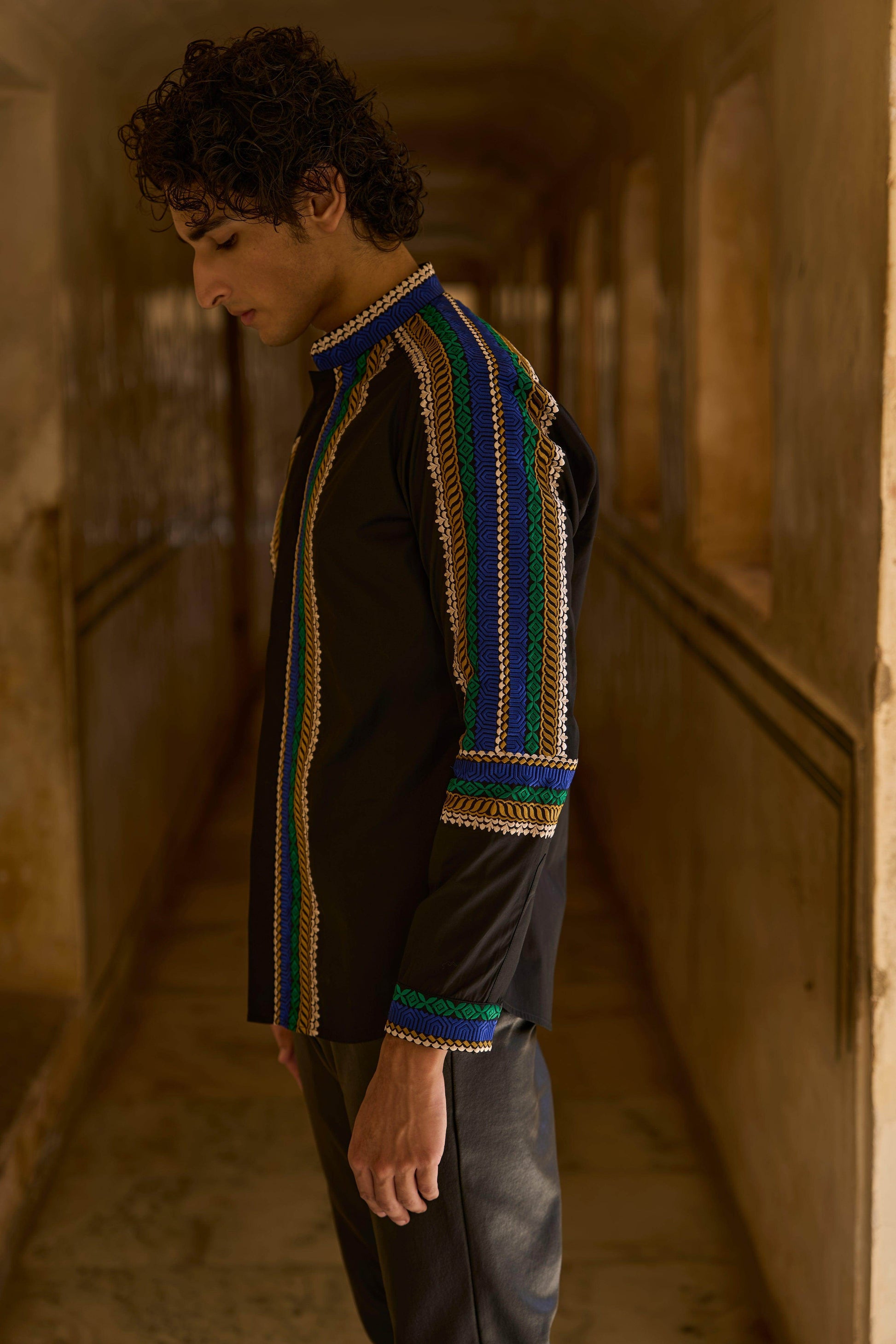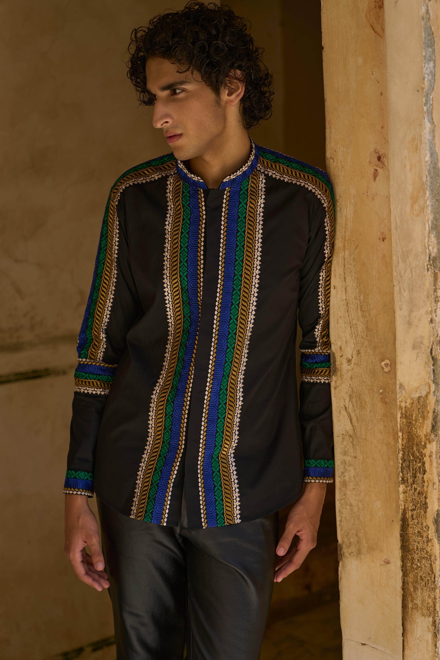Band collar shirt in black organic cotton poplin. Placed multicolour geometric embroidery borders on the center front, collar, sleeves, cuffs and back yoke. Concealed button down placket.