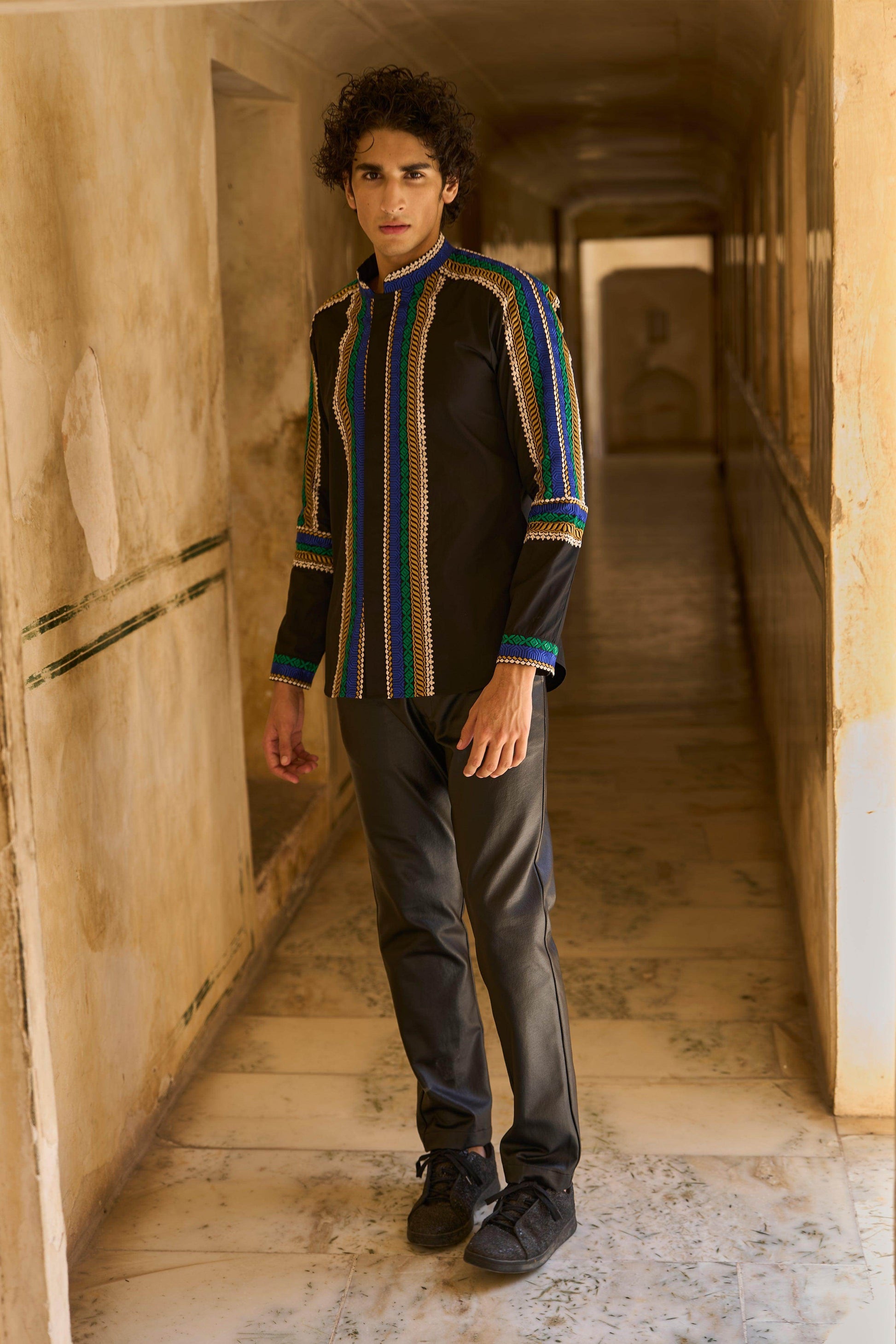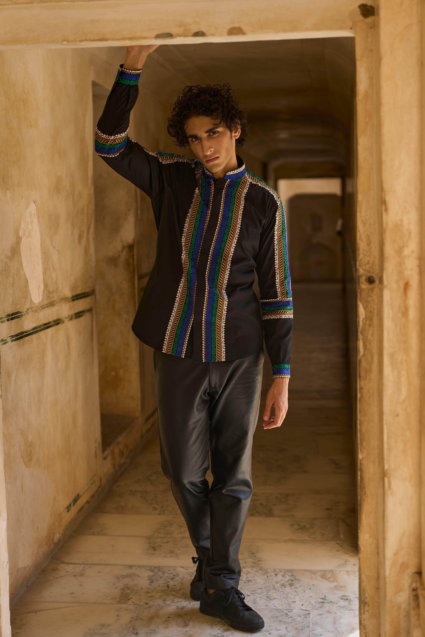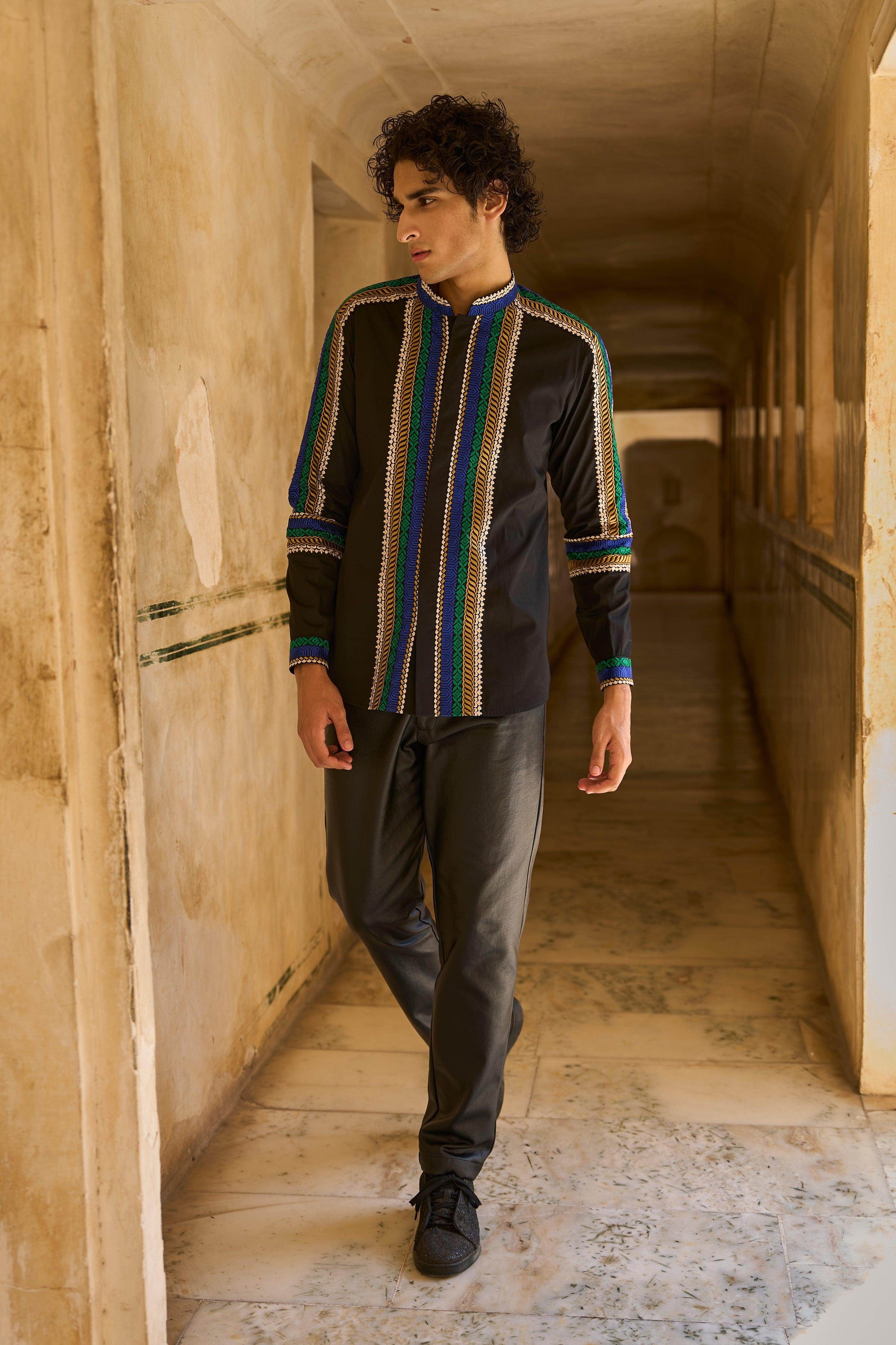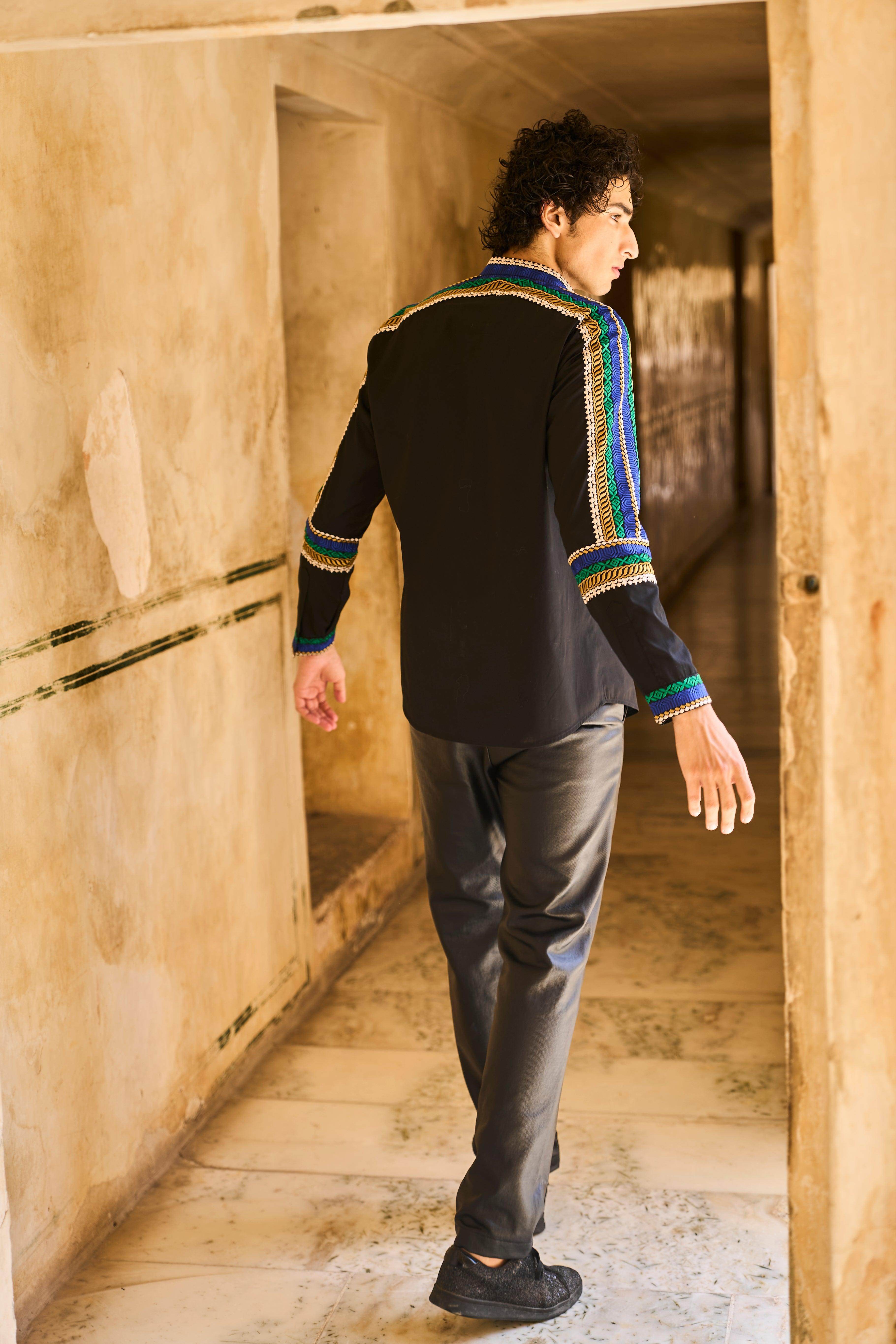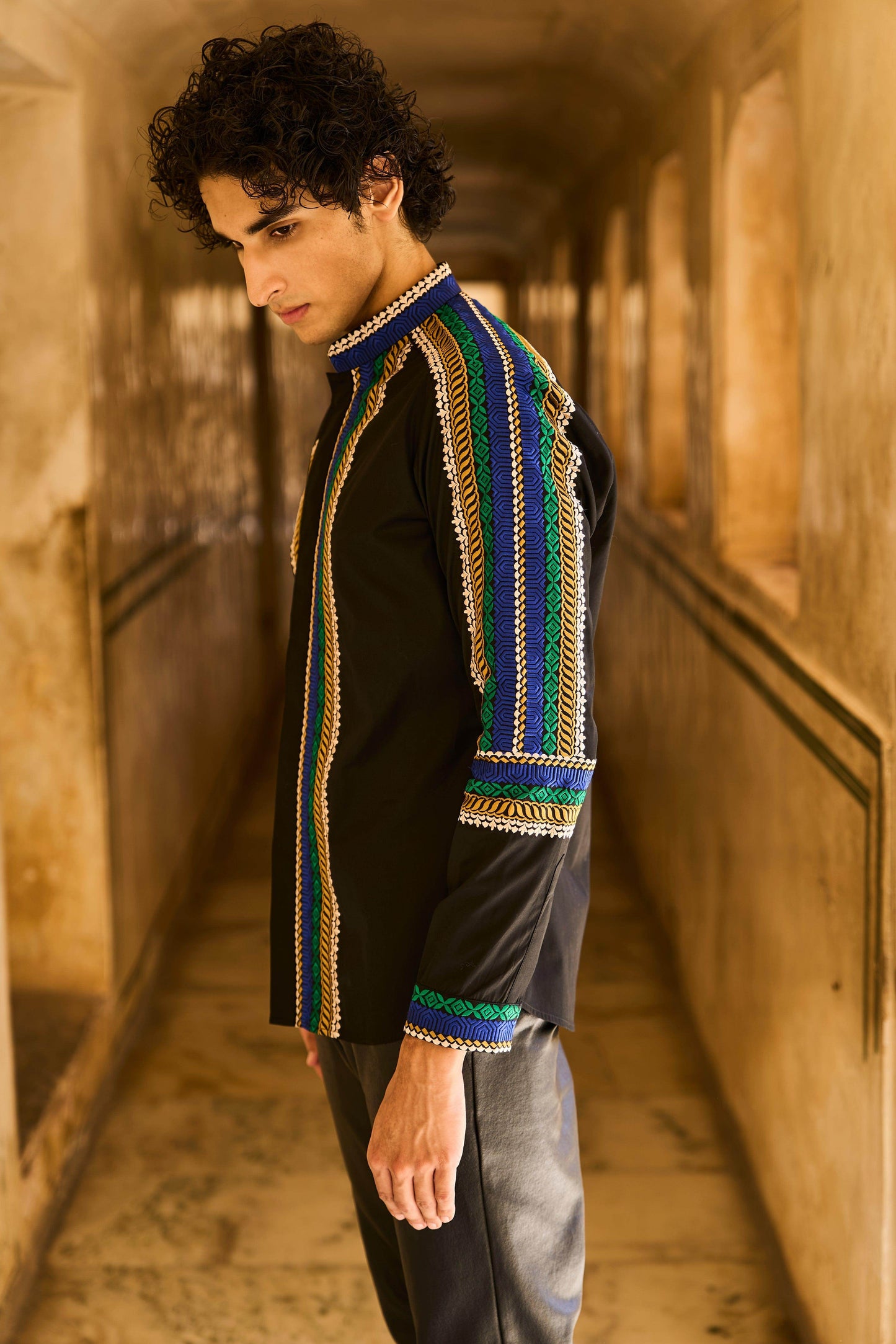 Band collar shirt in black organic cotton poplin. Placed multicolour geometric embroidery borders on the center front, collar, sleeves, cuffs and back yoke. Concealed button down placket.
