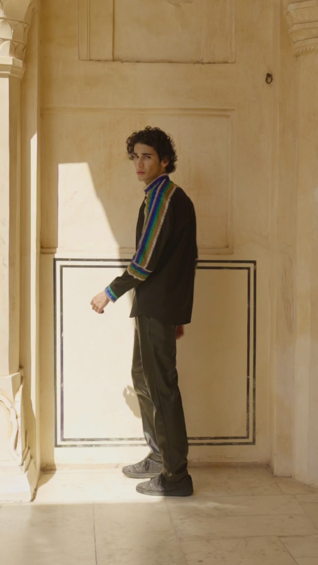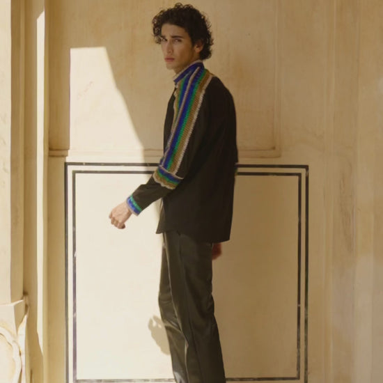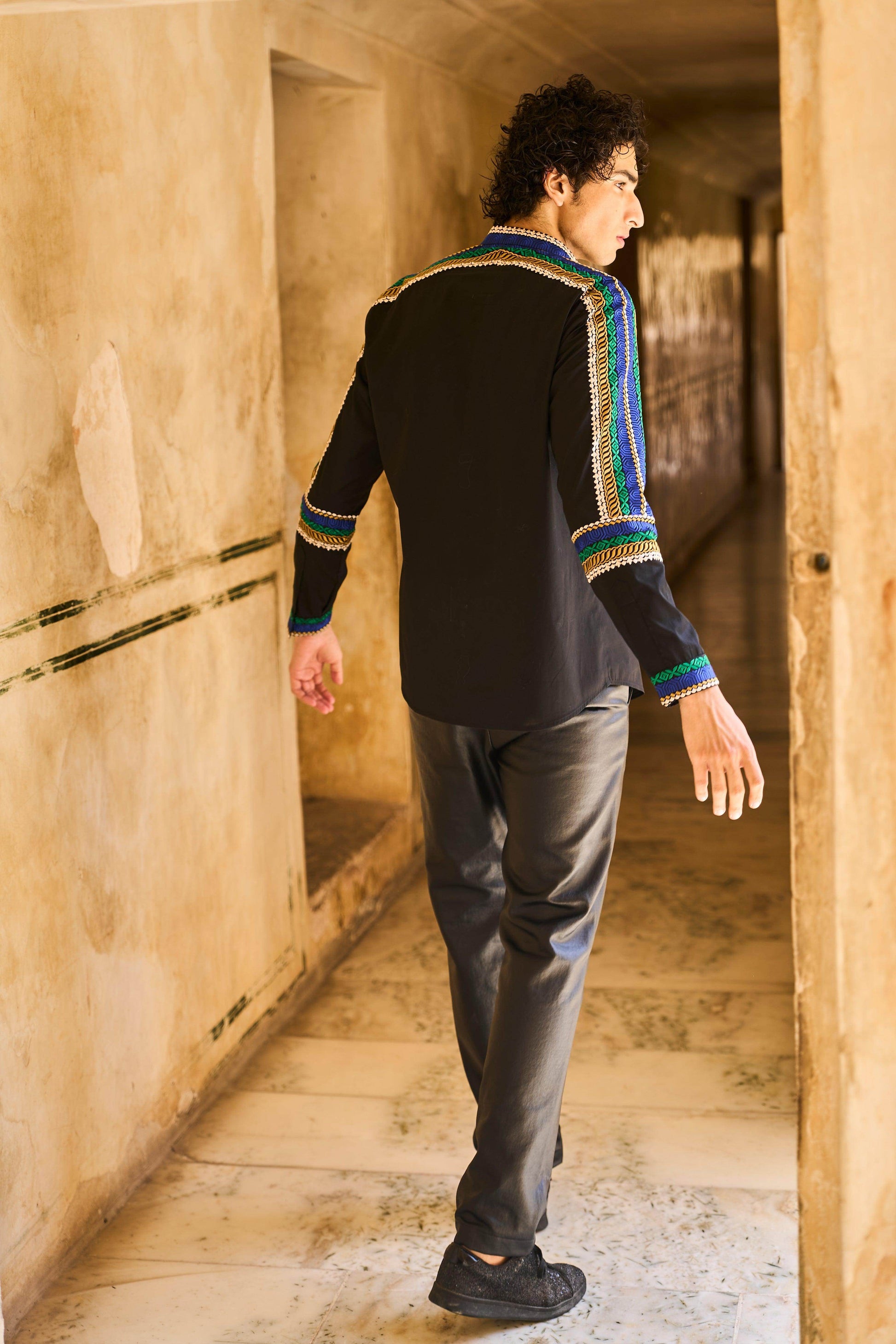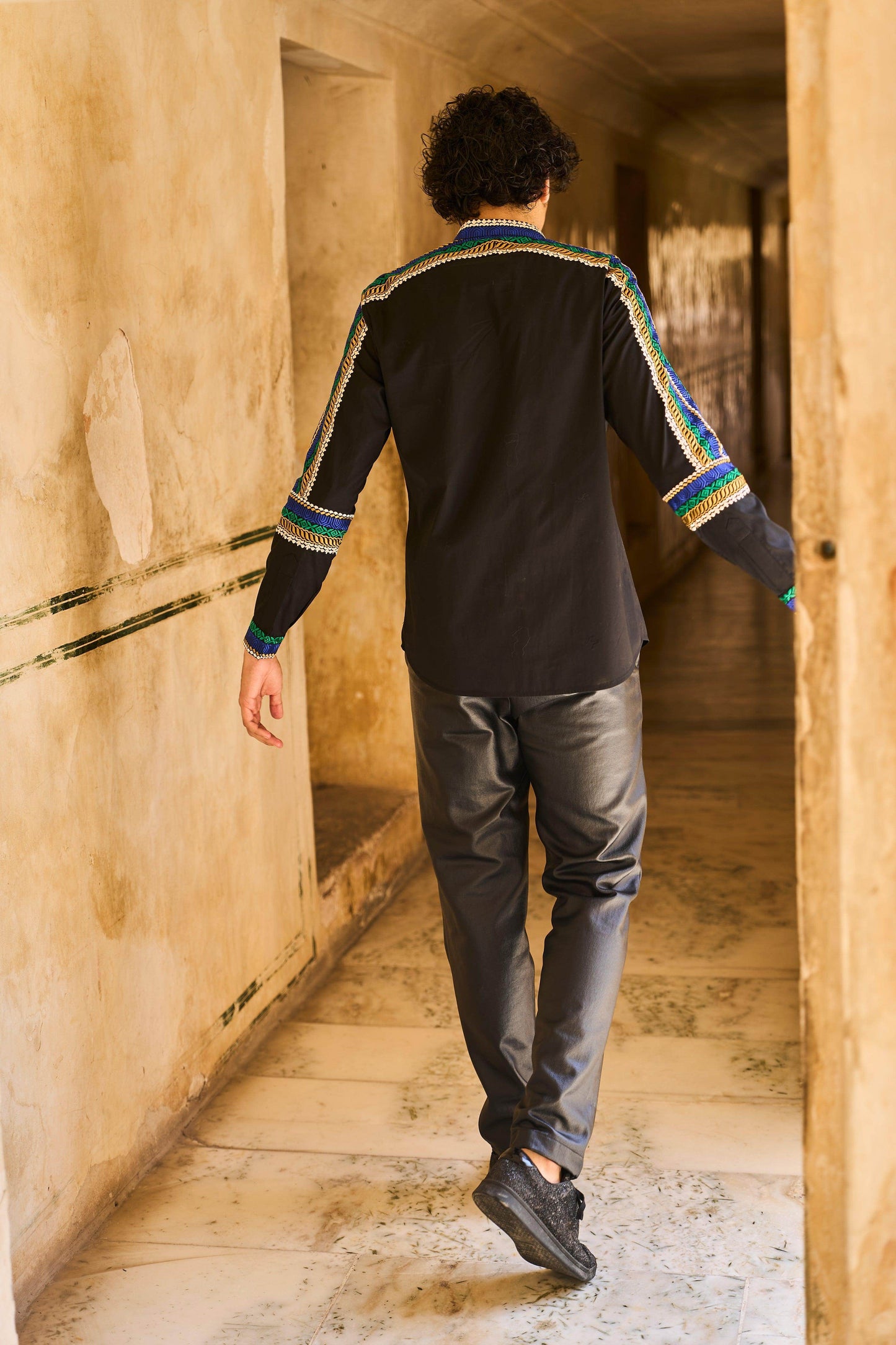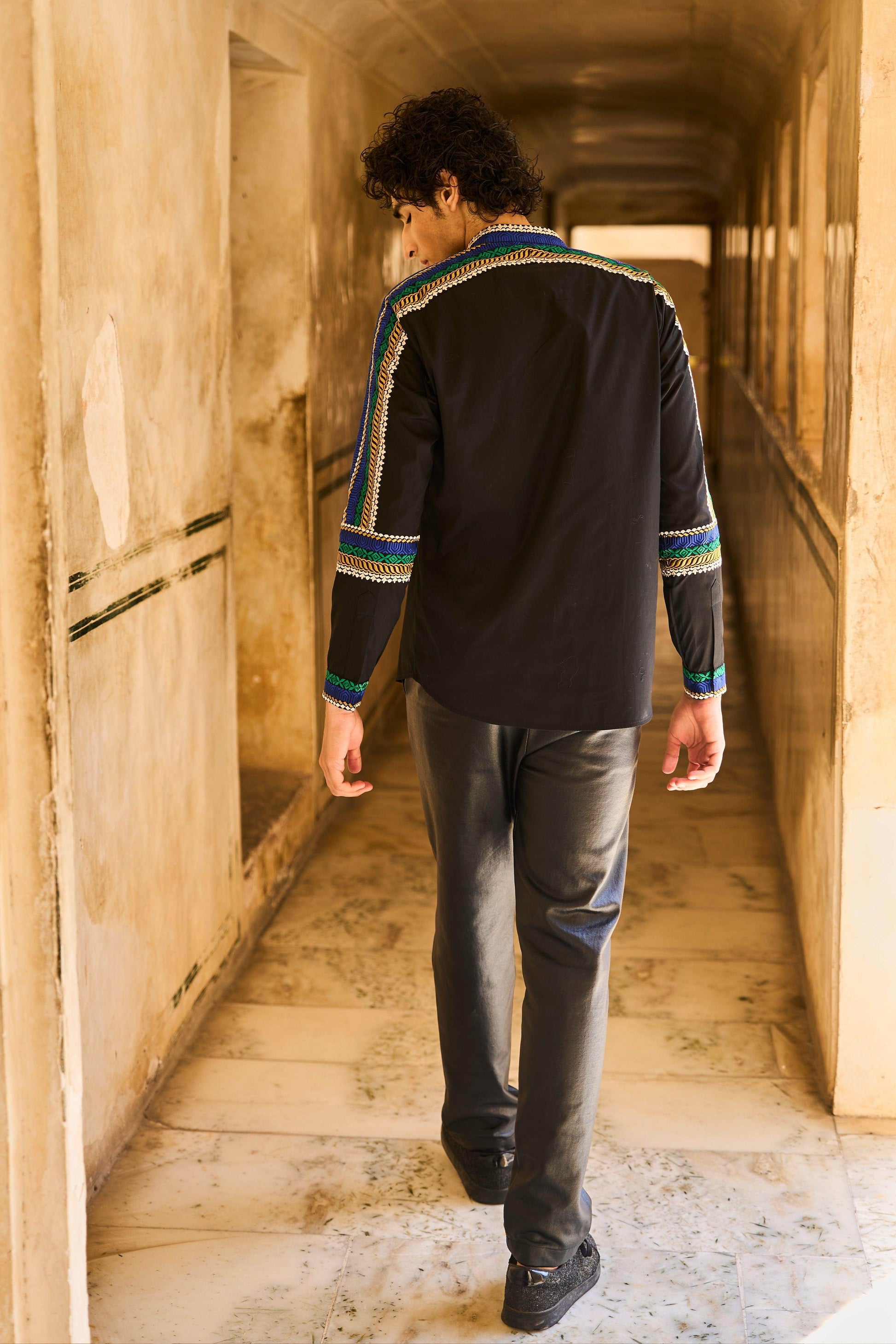Band collar shirt in black organic cotton poplin. Placed multicolour geometric embroidery borders on the center front, collar, sleeves, cuffs and back yoke. Concealed button down placket.