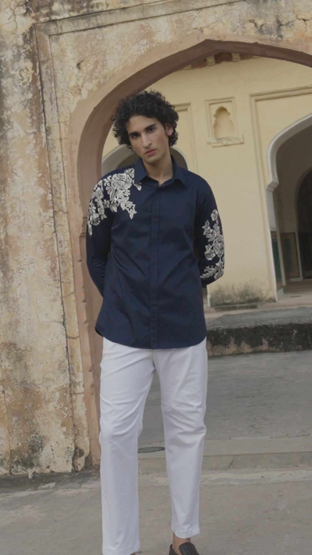 Blue organic cotton poplin full sleeve shirt with placed ivory motif embroidery on the shoulder and sleeves. Contrast ivory piping detailing on the sleeve cuff opening and back yoke. Shirt collar, concealed placket. Regular fit. Paired with relaxed fit white denim pant that tapers gently at the bottom. Cut and sewn in a flattering shape that gently tapers below the knee to a concealed pleat at the hem. Zip pockets in the side and back. Belt loops, hook/eye and zip closure in the front.