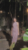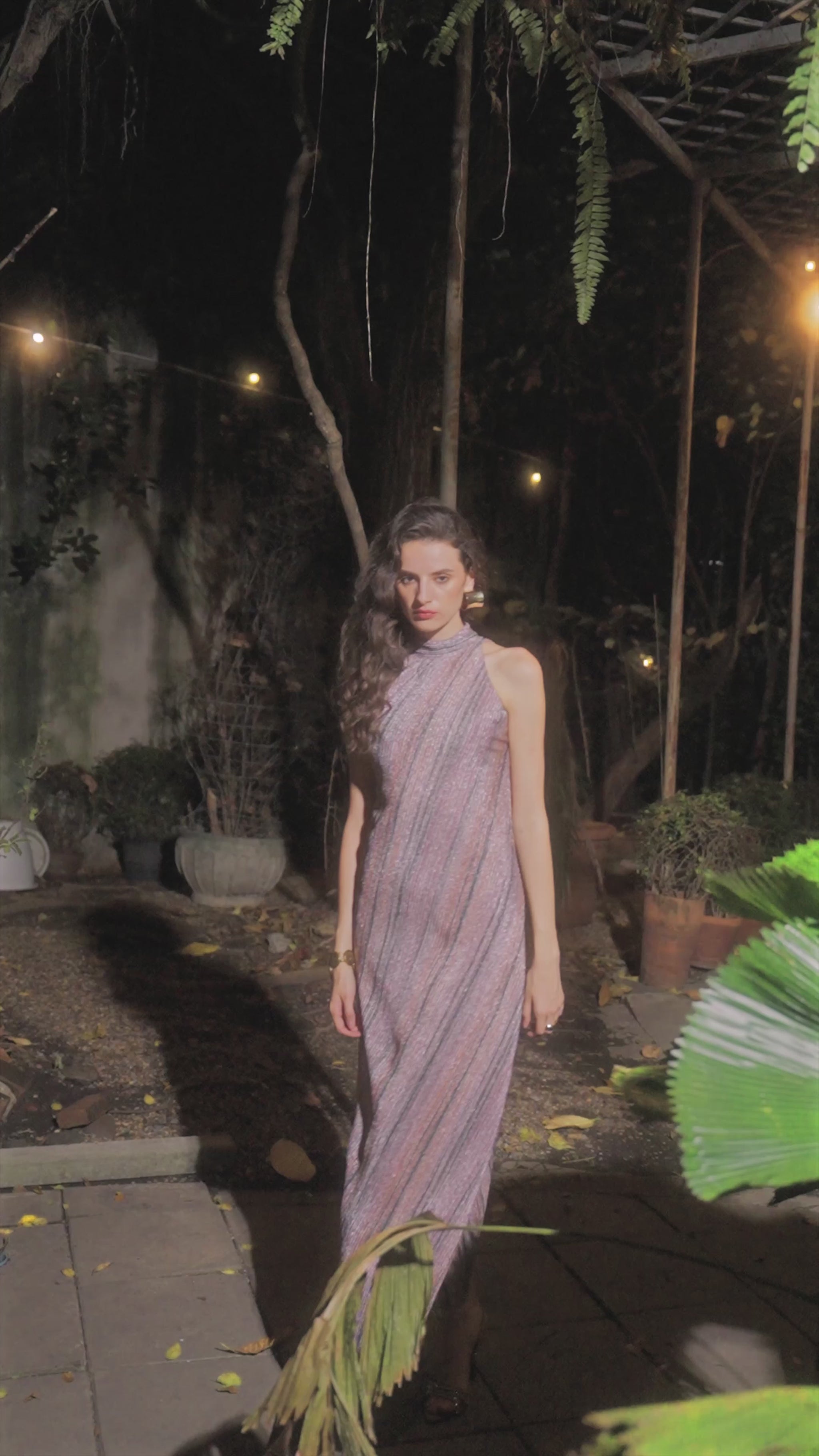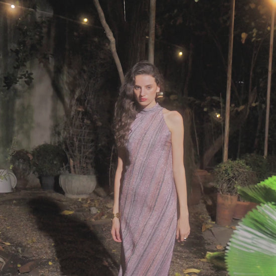 Metallic multi-tone pleated halter dress in a sleek shimmer knit. Soft banded halter neckline with a button-and-loop closure at the back. Pleated stripes in pastel tones of lilac and rose complemented with soft metallic hues create a fluid shimmer through the long, straight fall. Garment is fully lined.