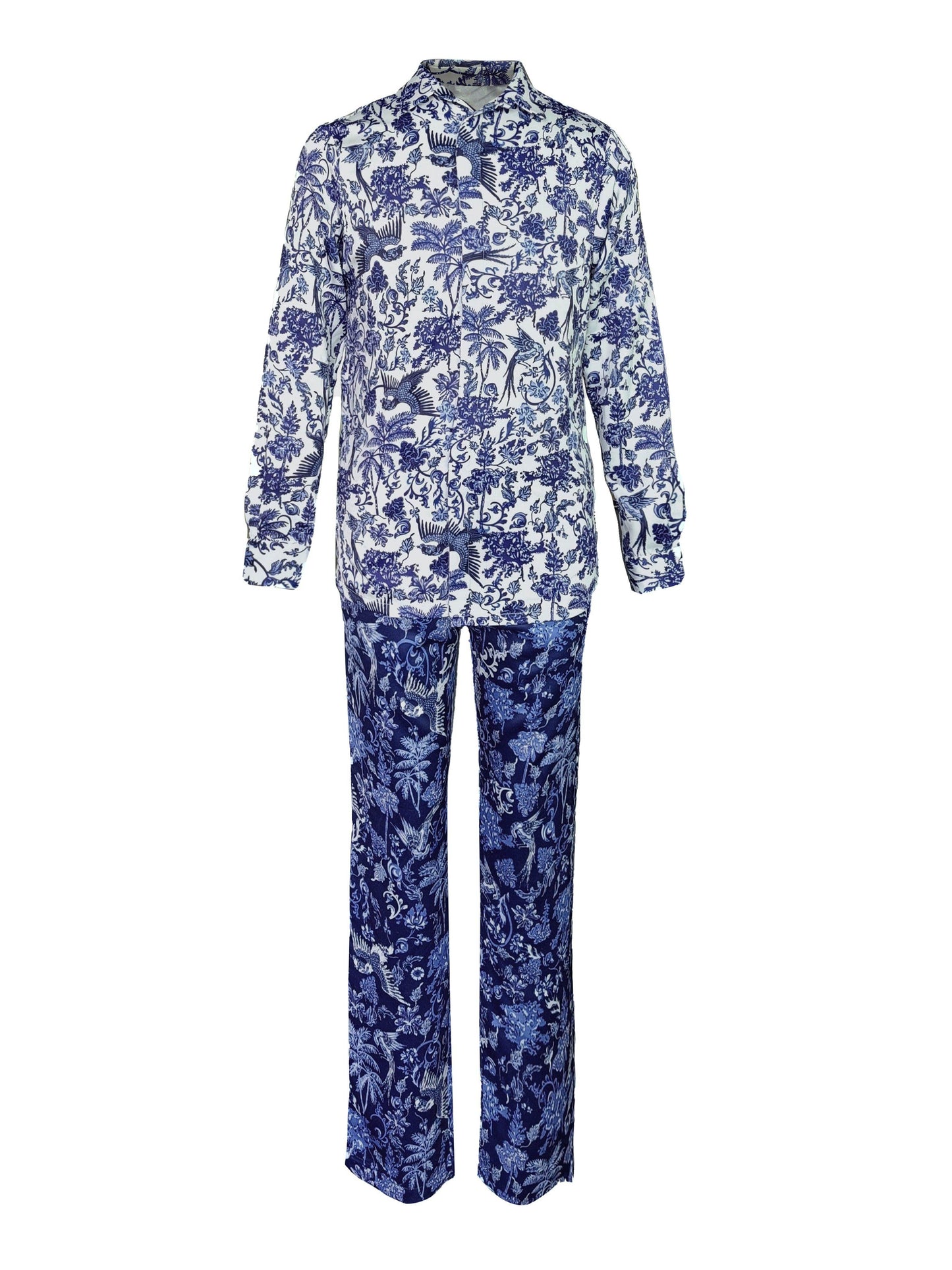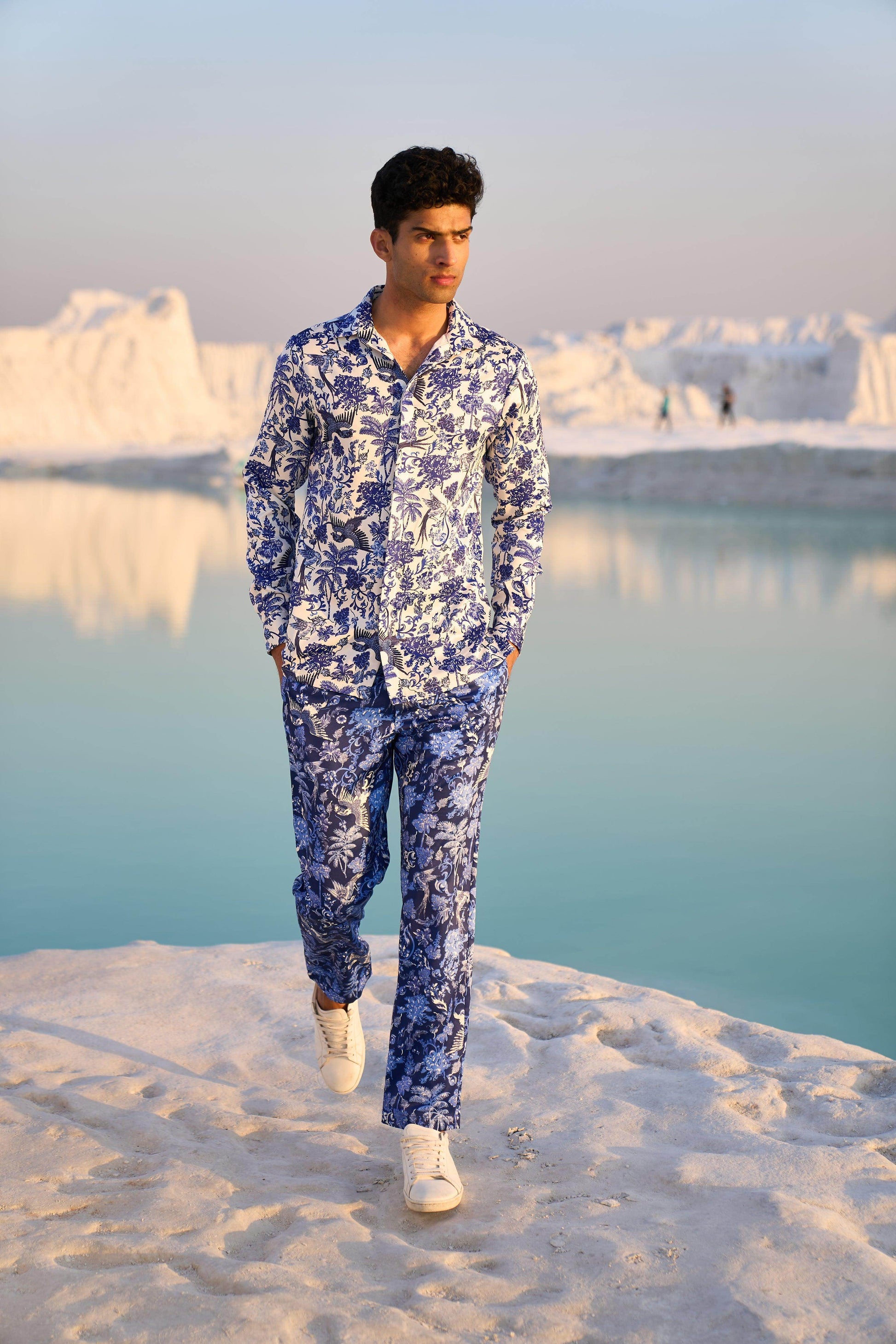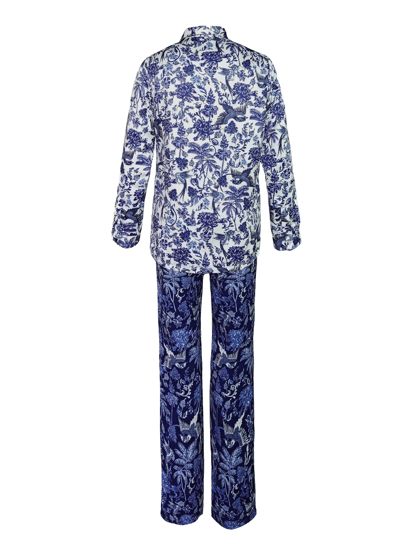 Printed set inspired by porcelain hand painting. The top is in shades of blue on white with concealed button placket. Pant is in shades of blue with zip closure at the front, belt loops. Pockets on the side and back.
