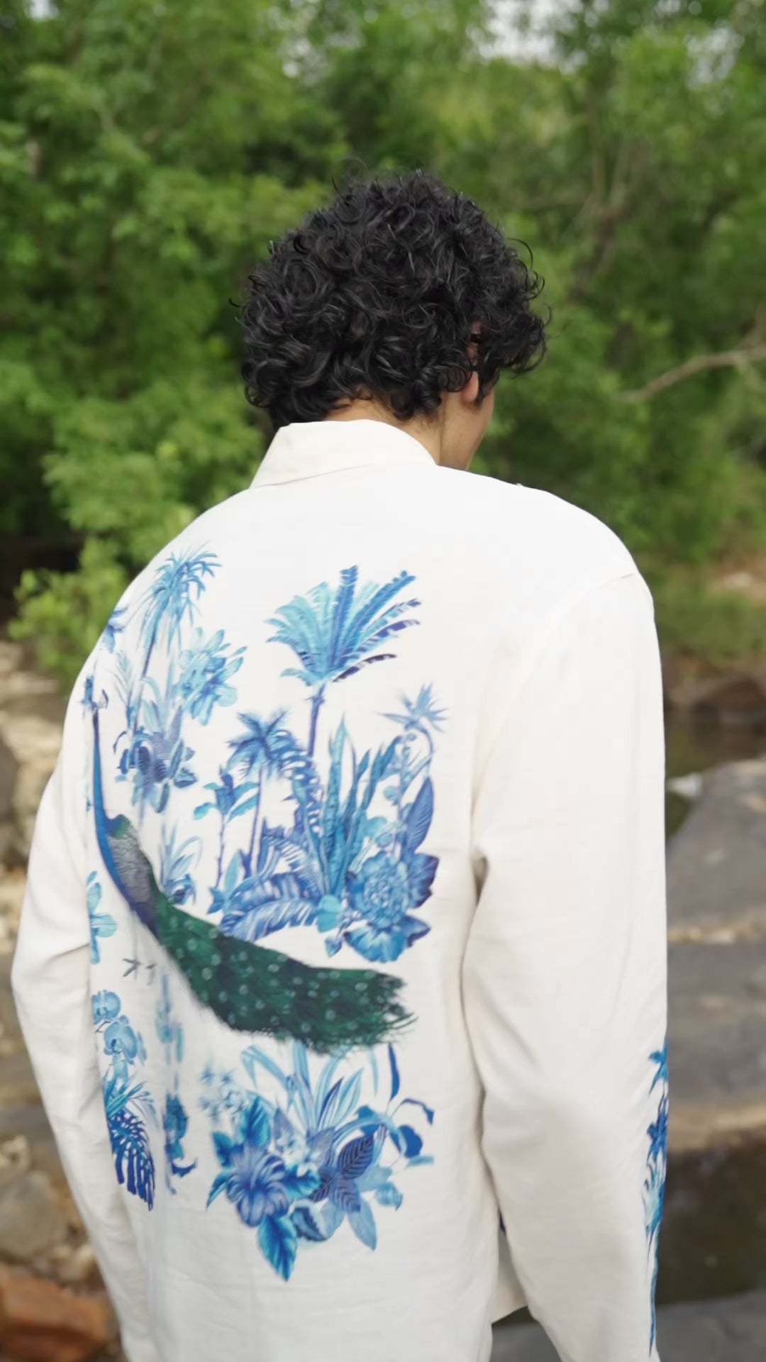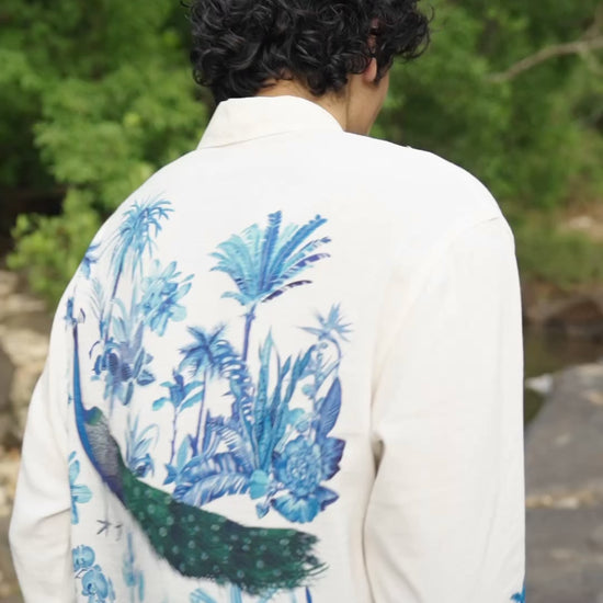 Boxy white linen shirt with placed prints in tones of ink and blue. Smaller motifs in the front complement the large scale peacock and floral motifs in the back. Shirt collar. Front button down placket with self fabric buttons. Full sleeves.