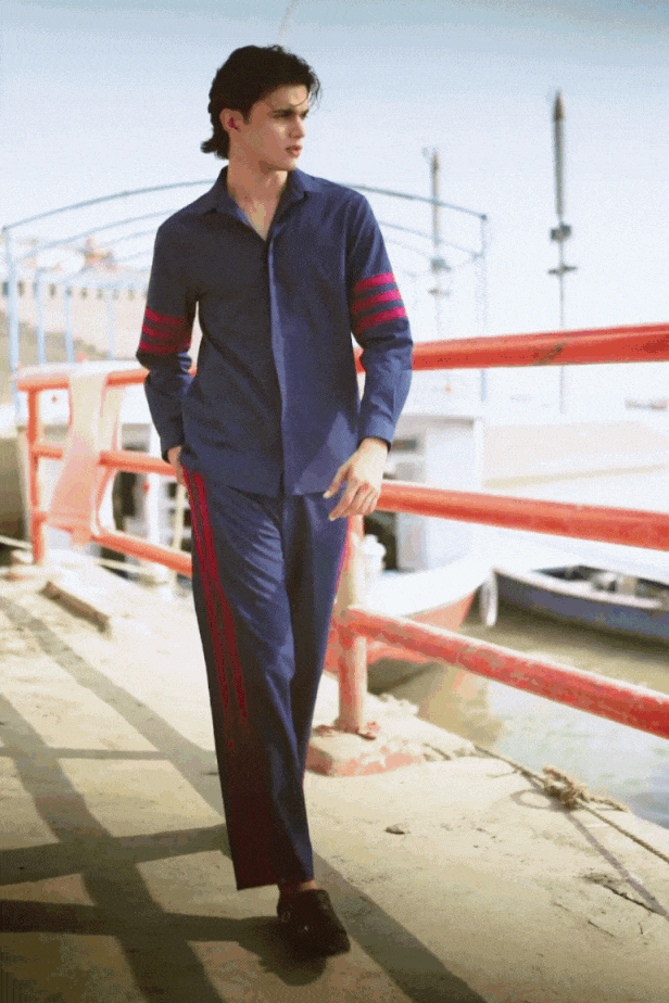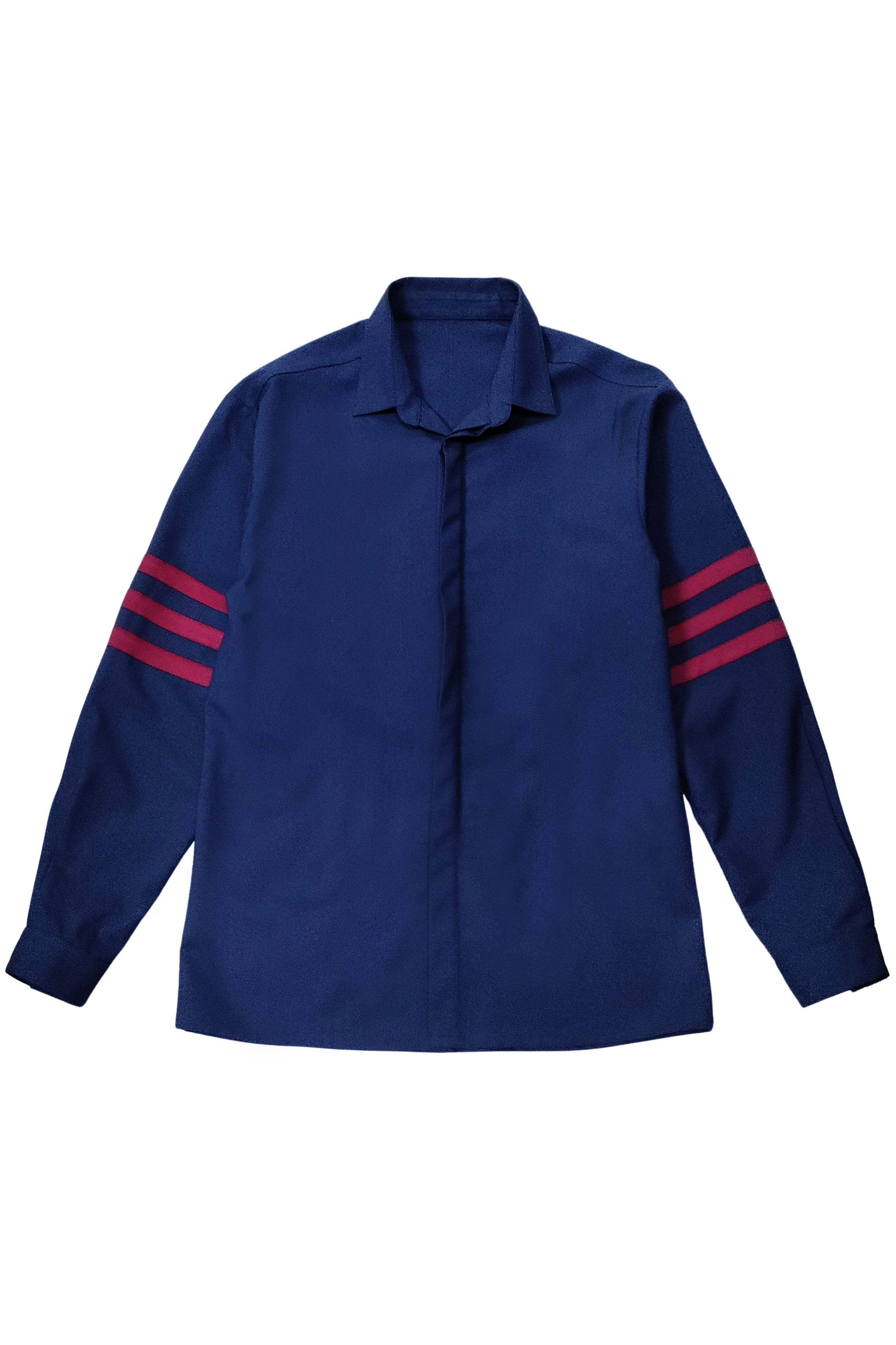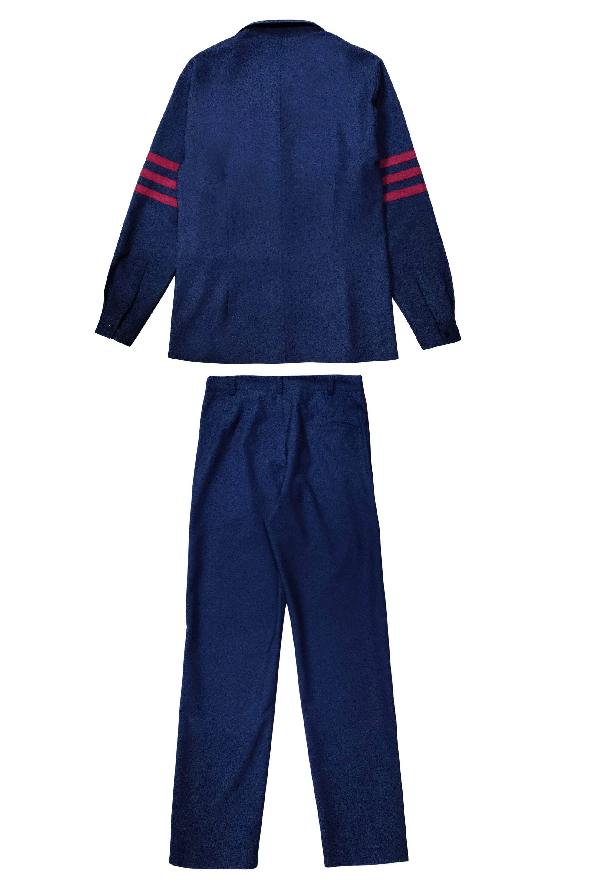 Navy pant set in all-weather suiting material. Racer-inspired red triple stripe detail on the sleeve biceps of the shirt and tuxedo-style stripes running down the side seams. The shirt has long sleeves and a concealed button placket. Pants have hook and zip closure at the front. Pockets on the side and back. Belt loops.