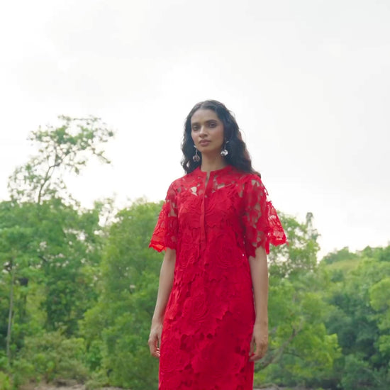 Relaxed fit red lace midi dress with a round neckline, scalloped cutwork hem and flared short sleeves. Popover with front button down placket. Rice stitch detailing on the slim band collar and front placket. Comes with a matching slip.