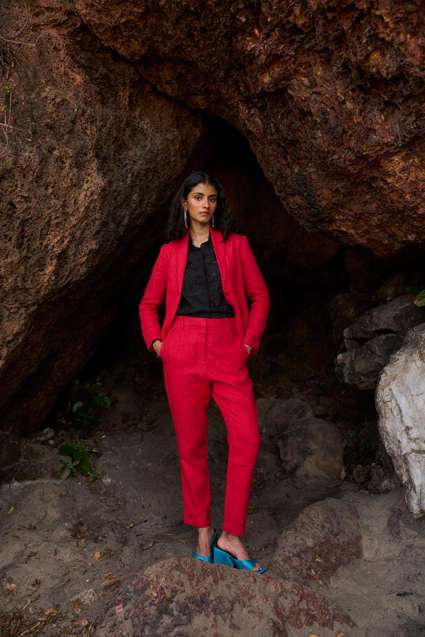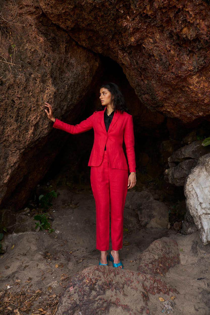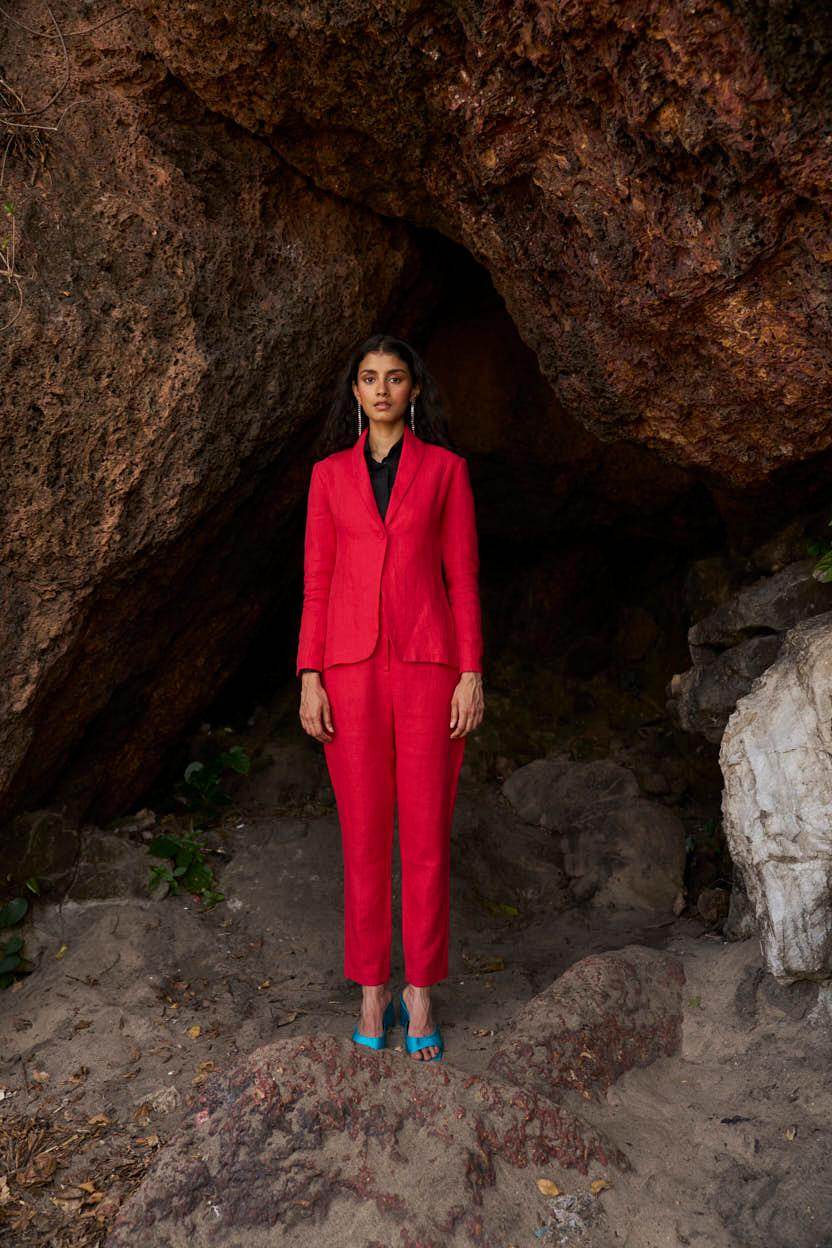 Red linen suit. The blazer has a shawl collar lapel. Single button closure in the front and double vented in the back. Snap button closure on the sleeve. Paired with matching pants. Hook/eye and zip closure in the front. Belt loops at the waist and pockets at the sides.