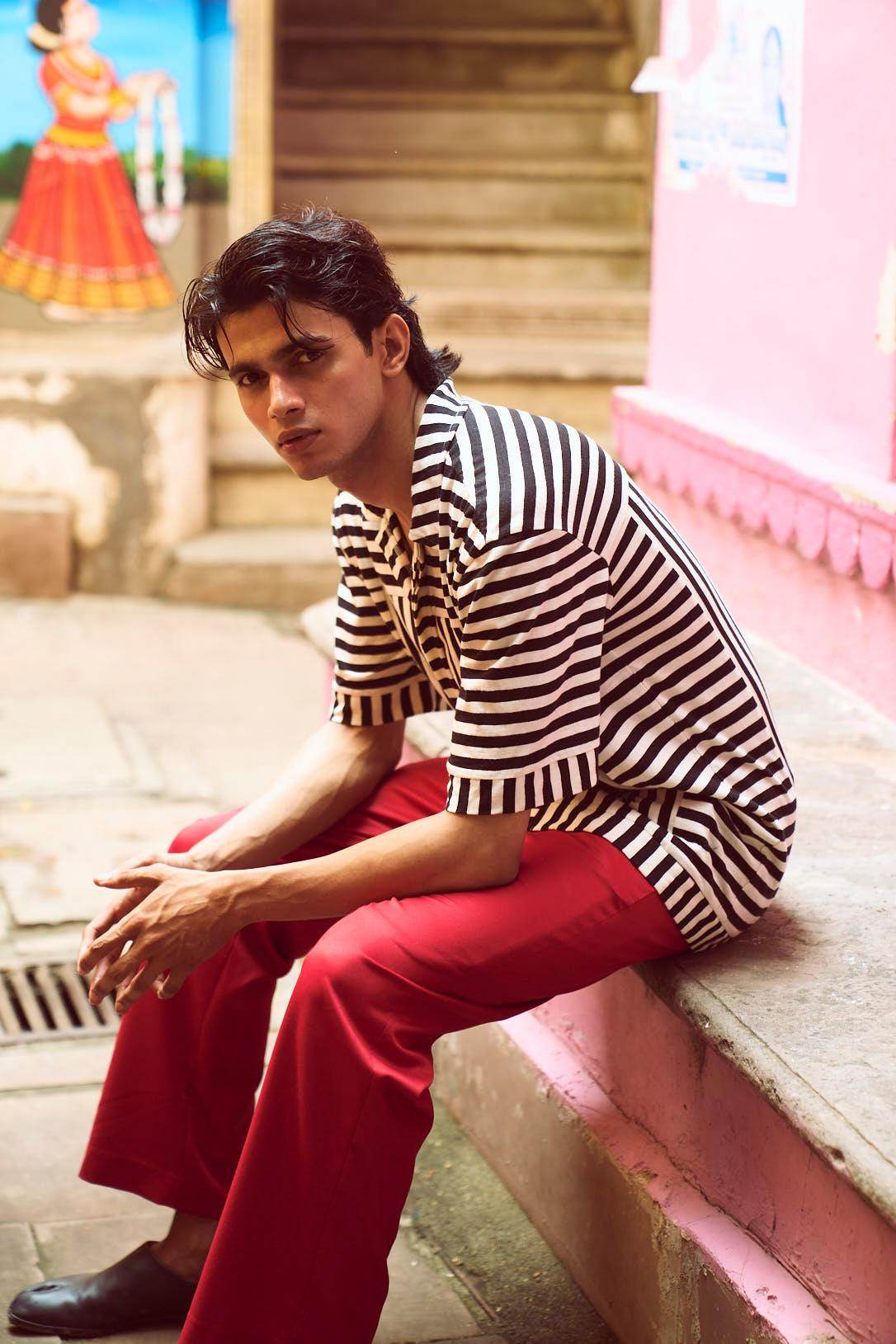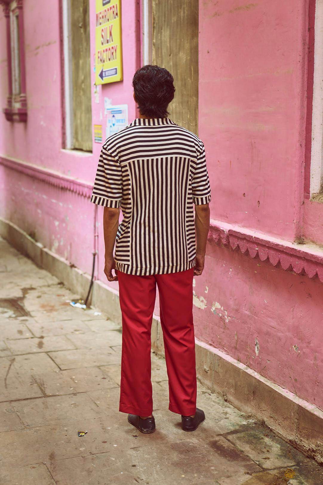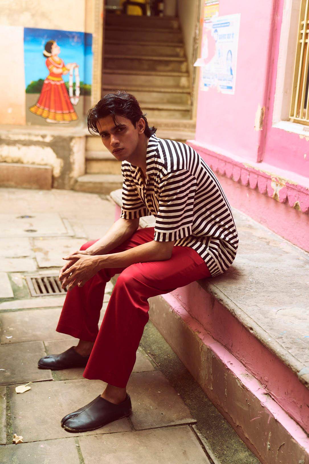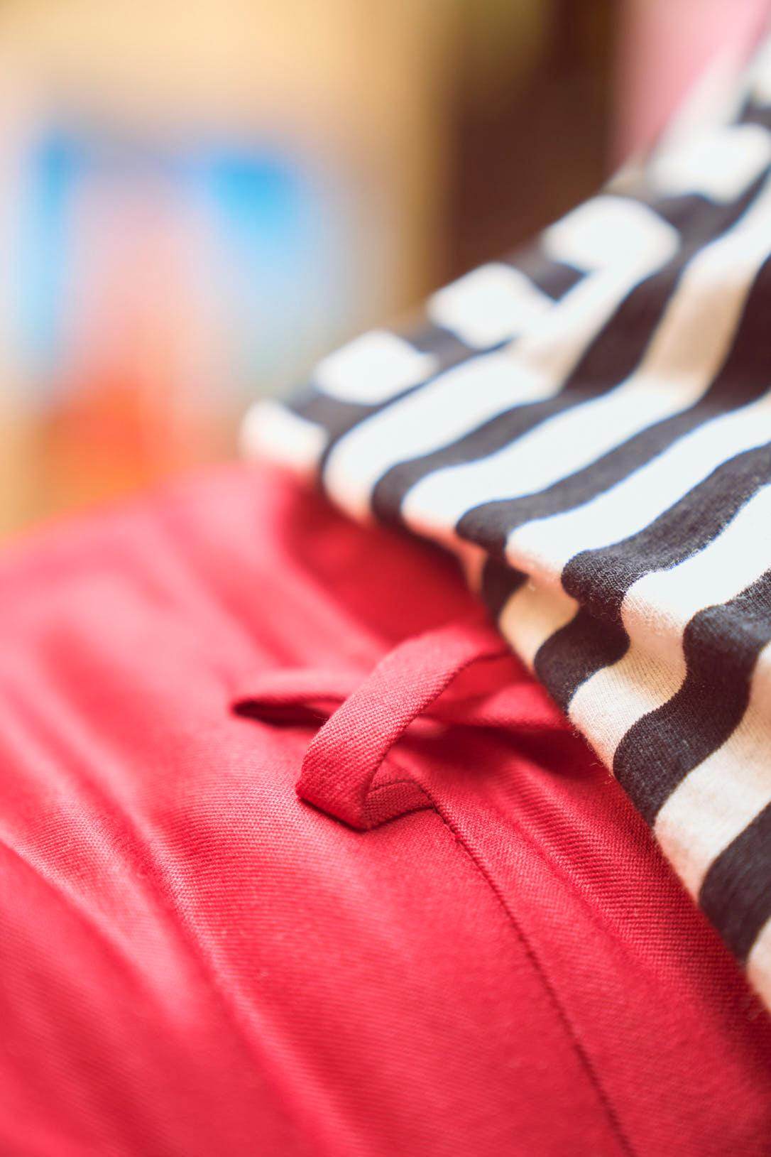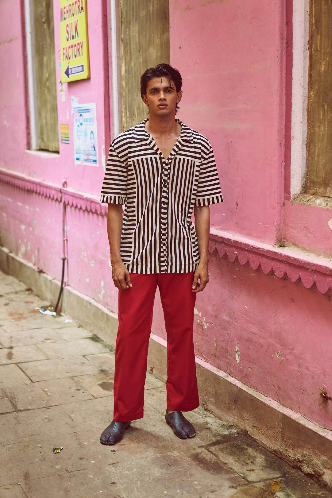 Red straight-fit pants. Pockets on the side and back. Hook and zip closure at the front. Elasticated at the back. Crossed belt loops.