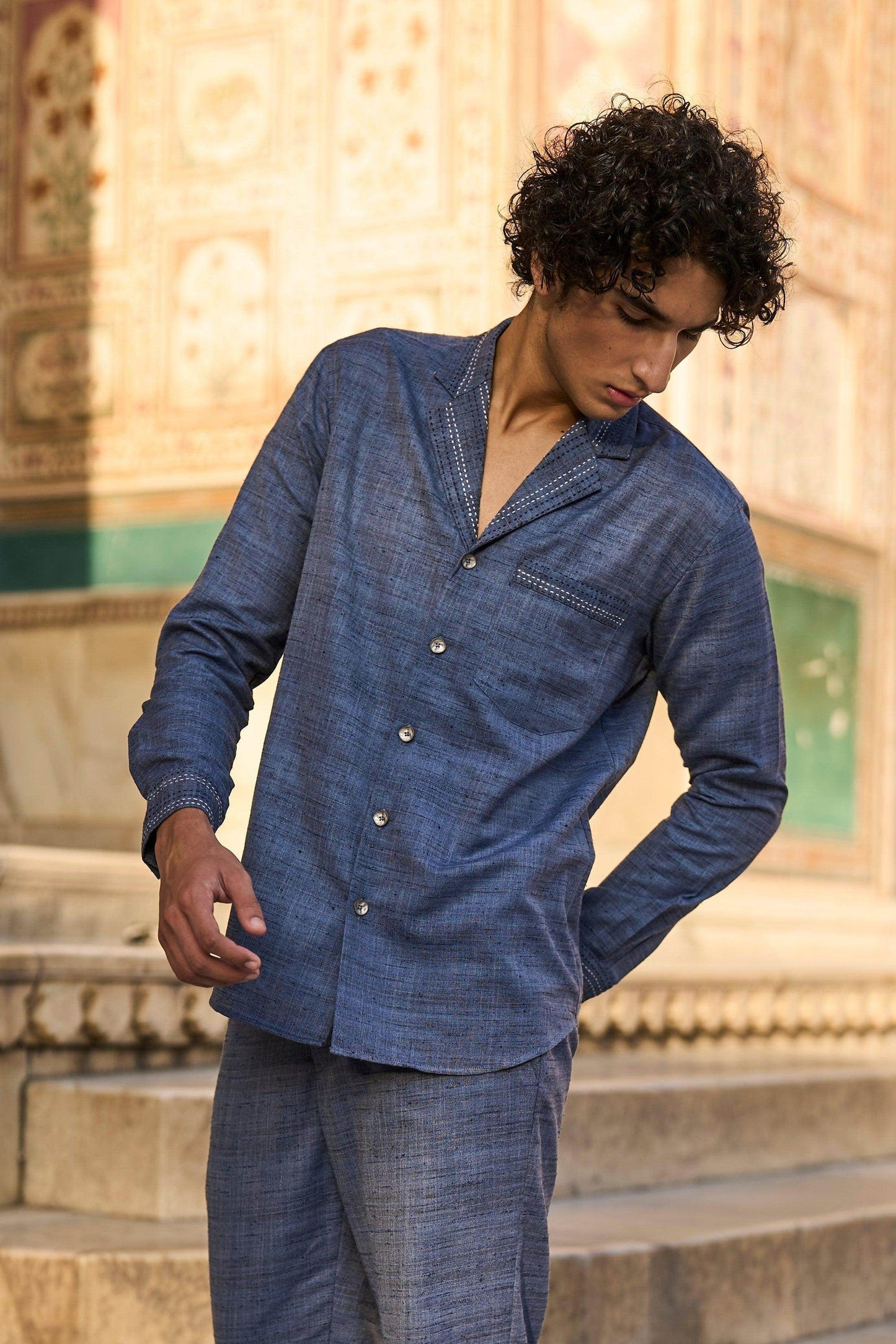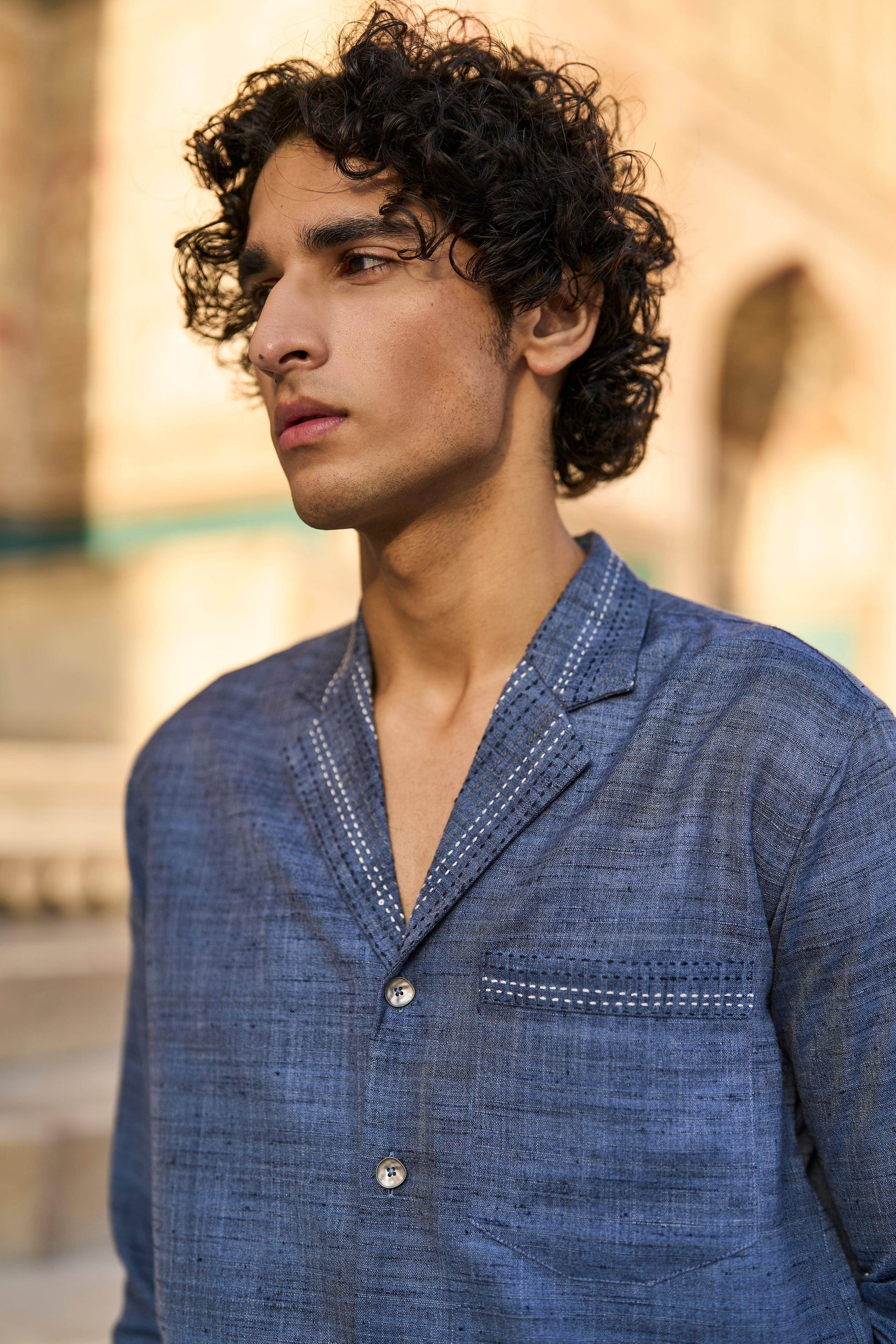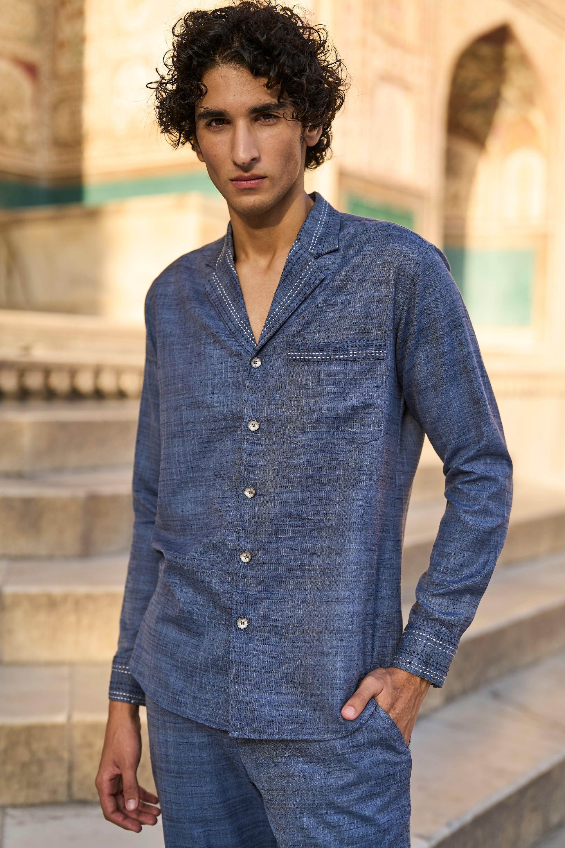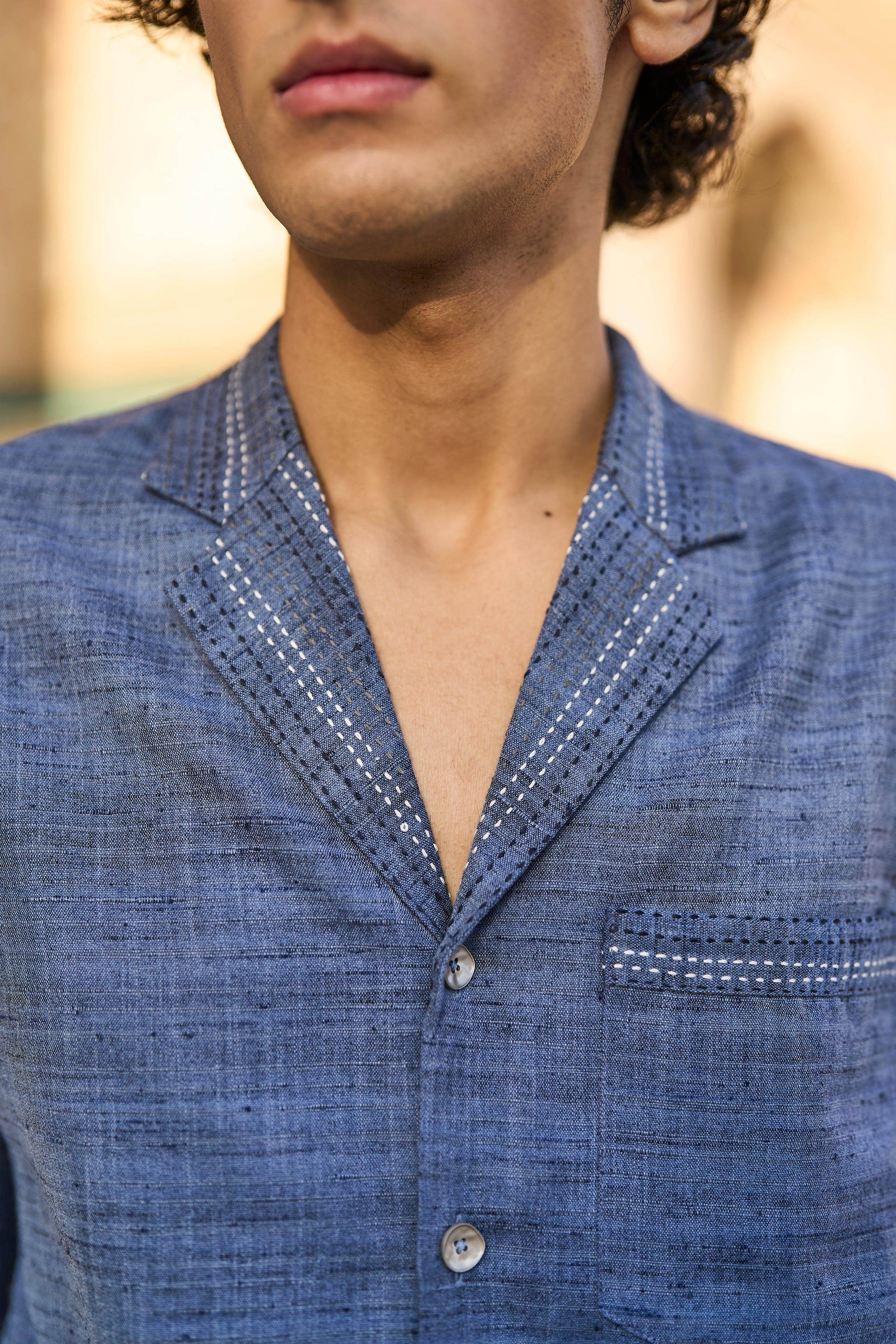 Textured slub shirt in petrol blue with contrast kantha stitch detailing on the pocket, sleeve cuff and camp collar. Full sleeves, relaxed fit. Full front button down.