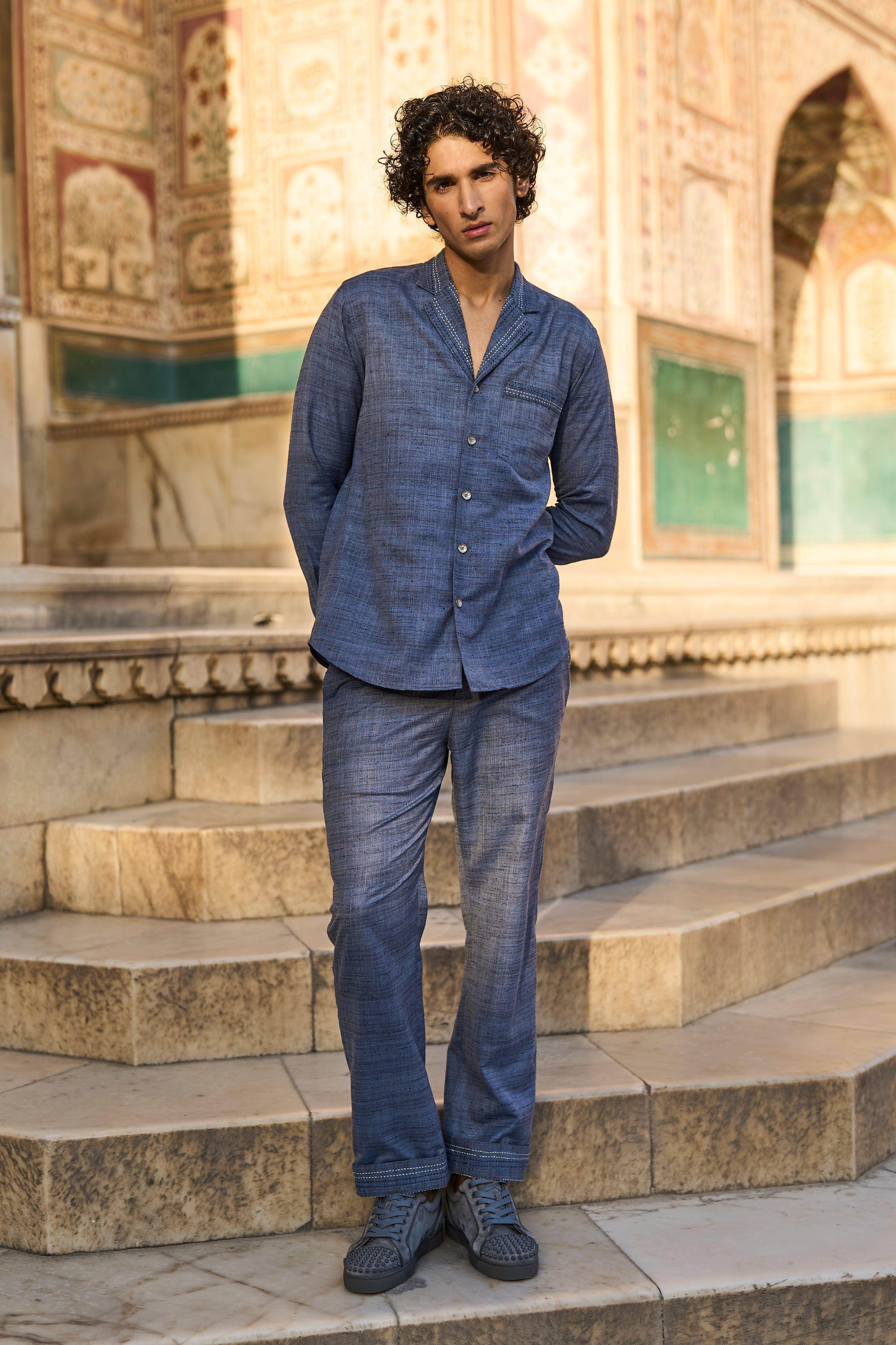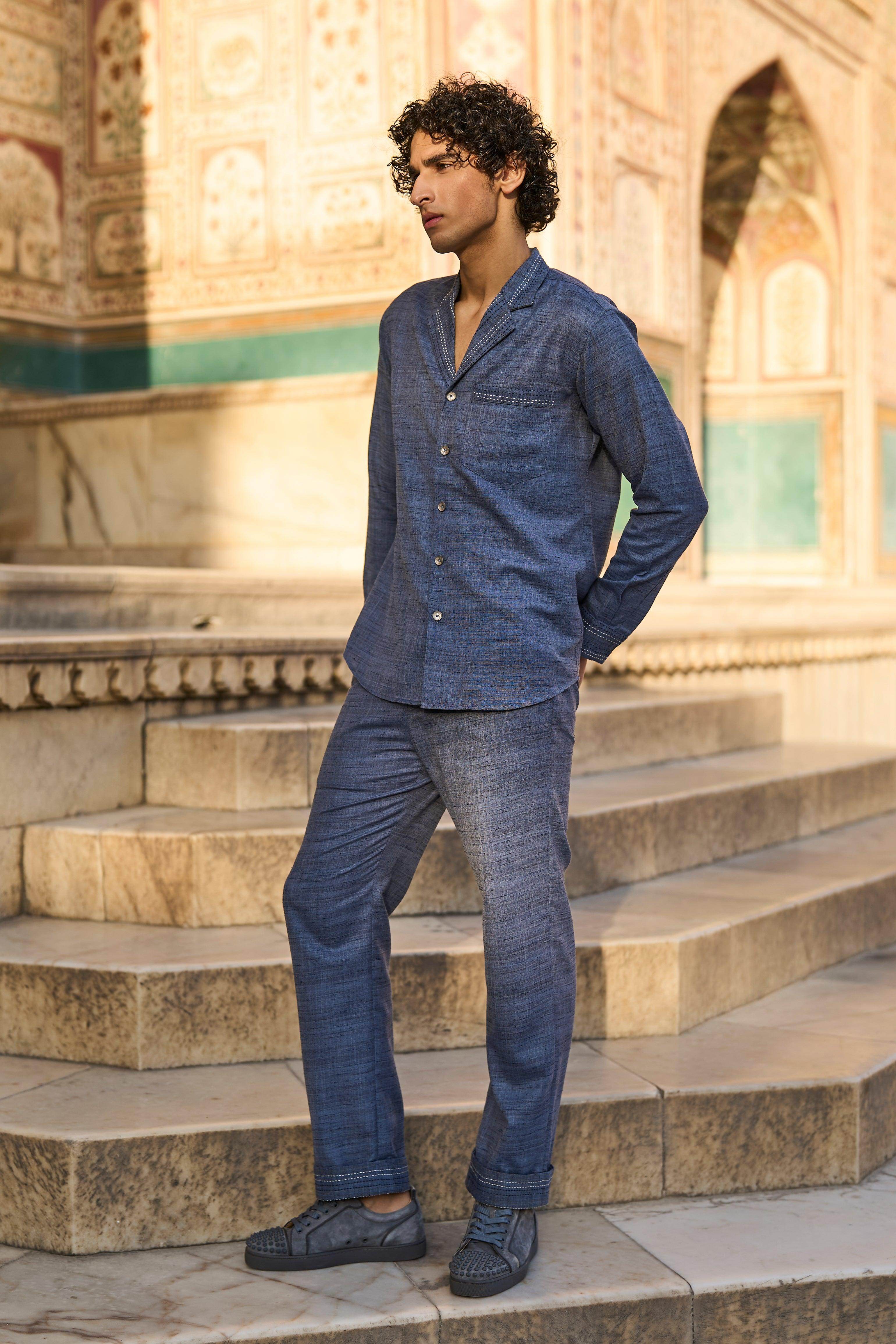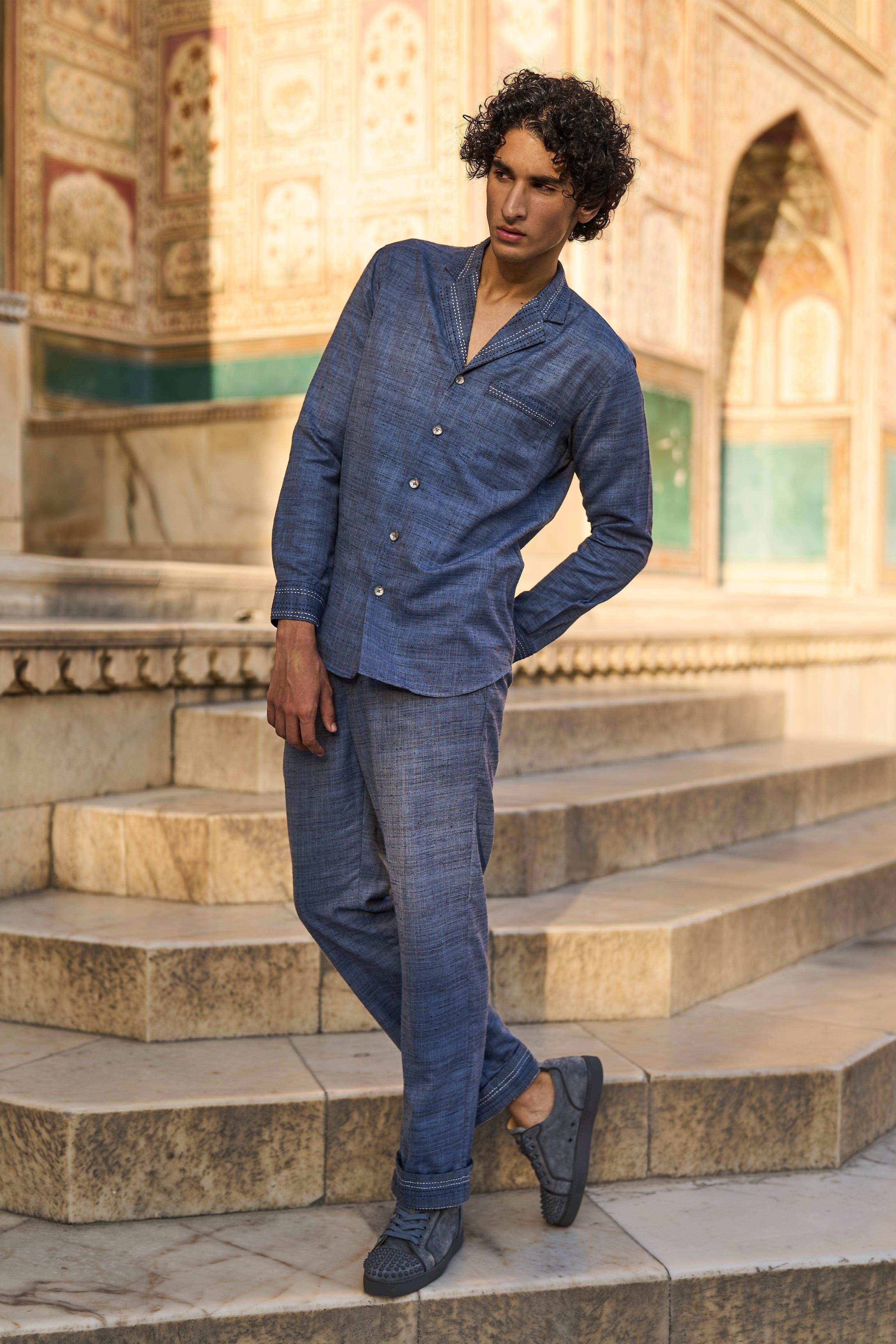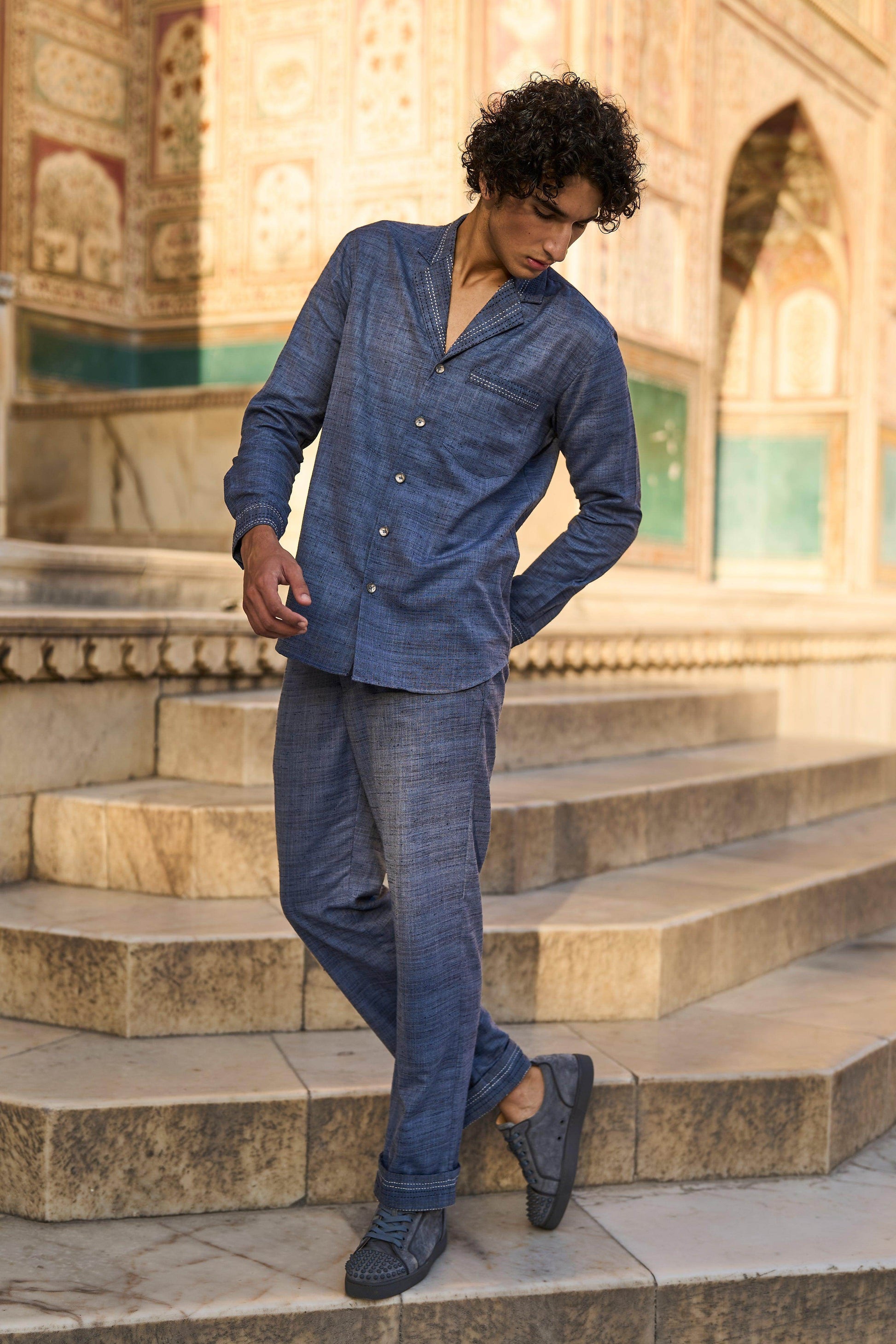 Textured slub shirt in petrol blue with contrast kantha stitch detailing on the pocket, sleeve cuff and camp collar. Full sleeves, relaxed fit. Full front button down.