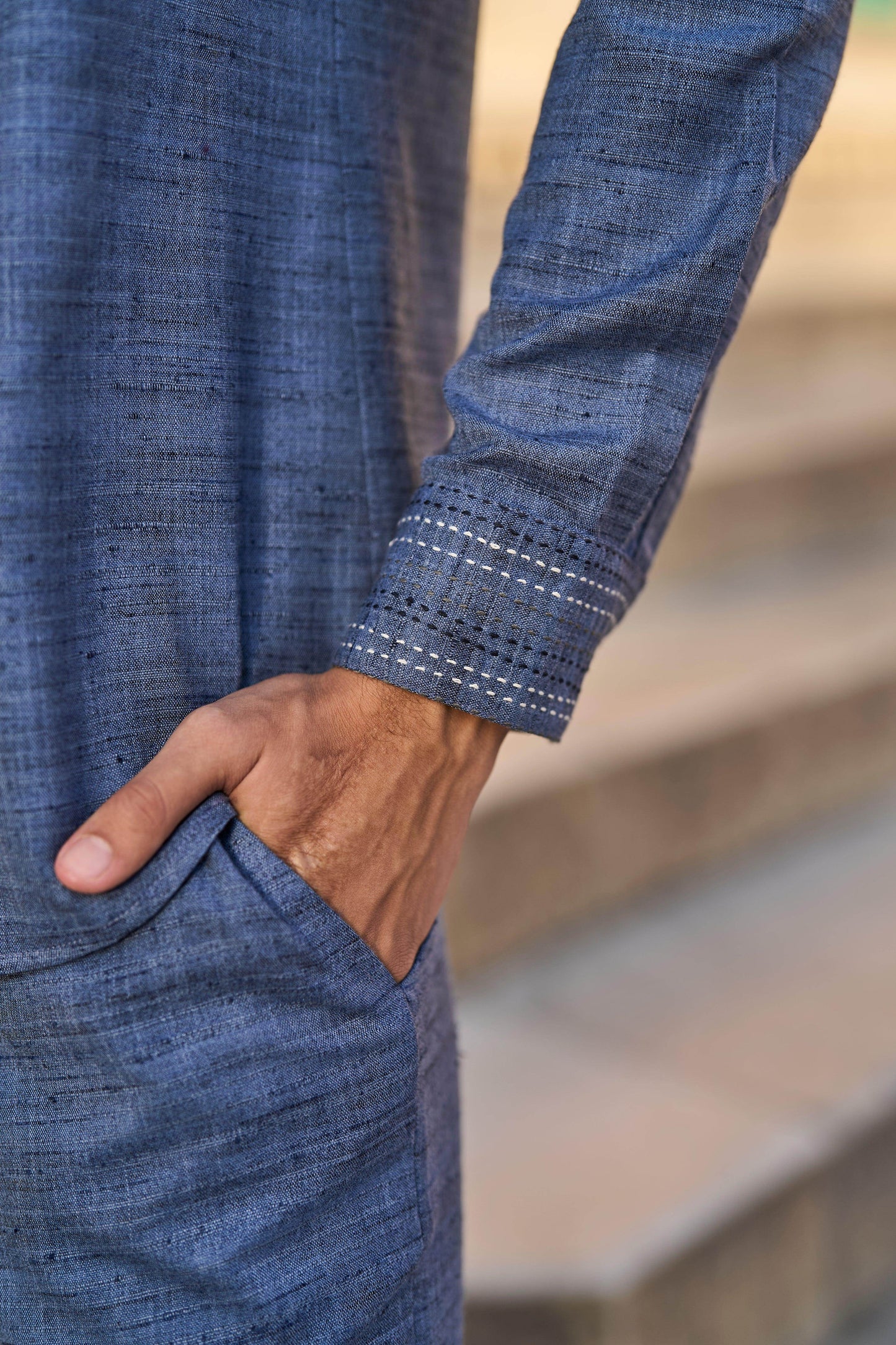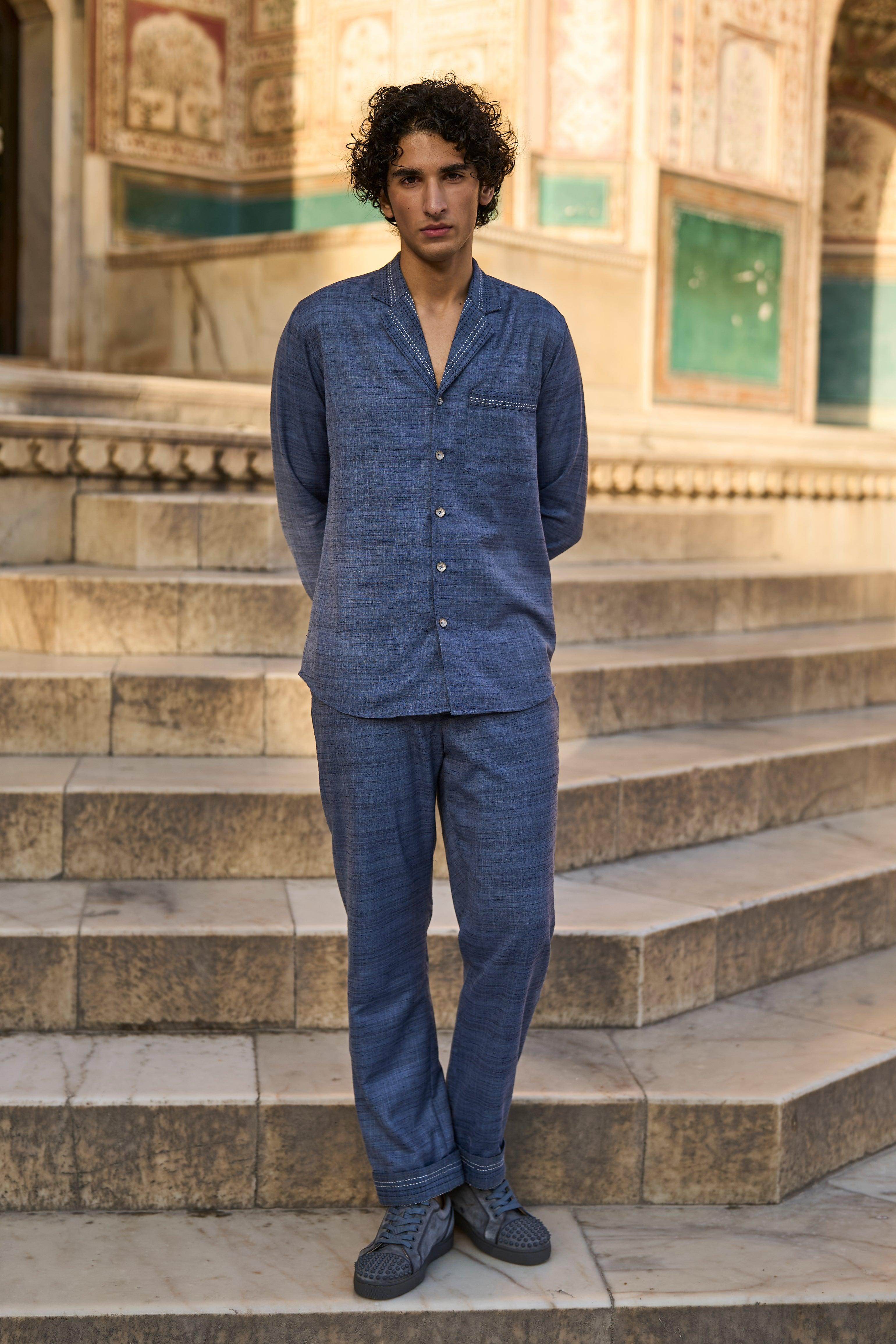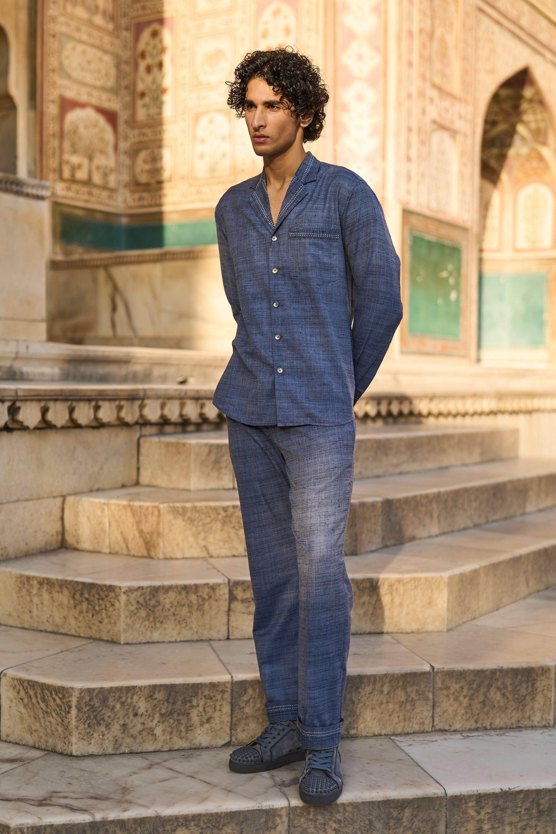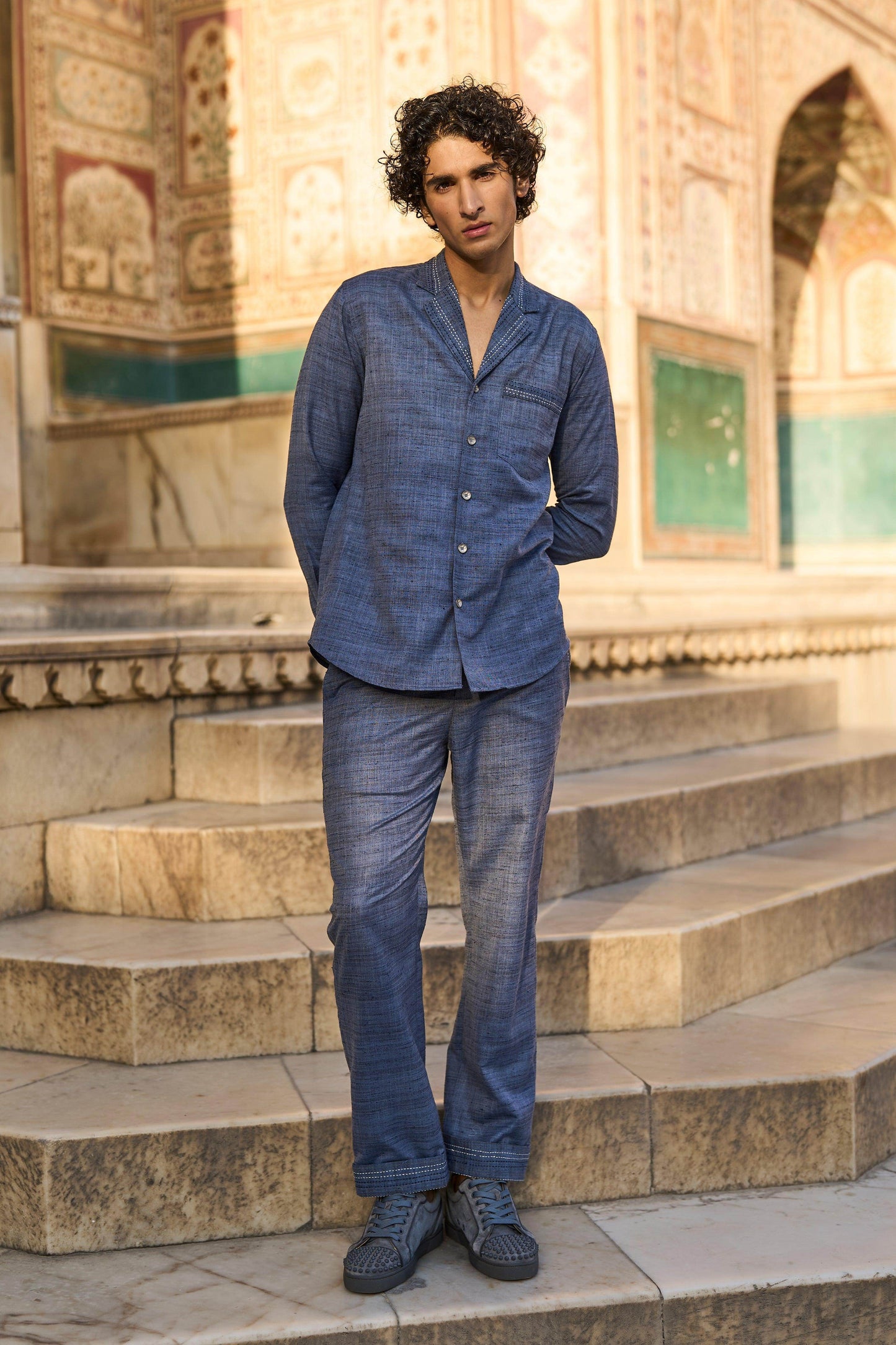 Textured slub shirt in petrol blue with contrast kantha stitch detailing on the pocket, sleeve cuff and camp collar. Full sleeves, relaxed fit. Full front button down.