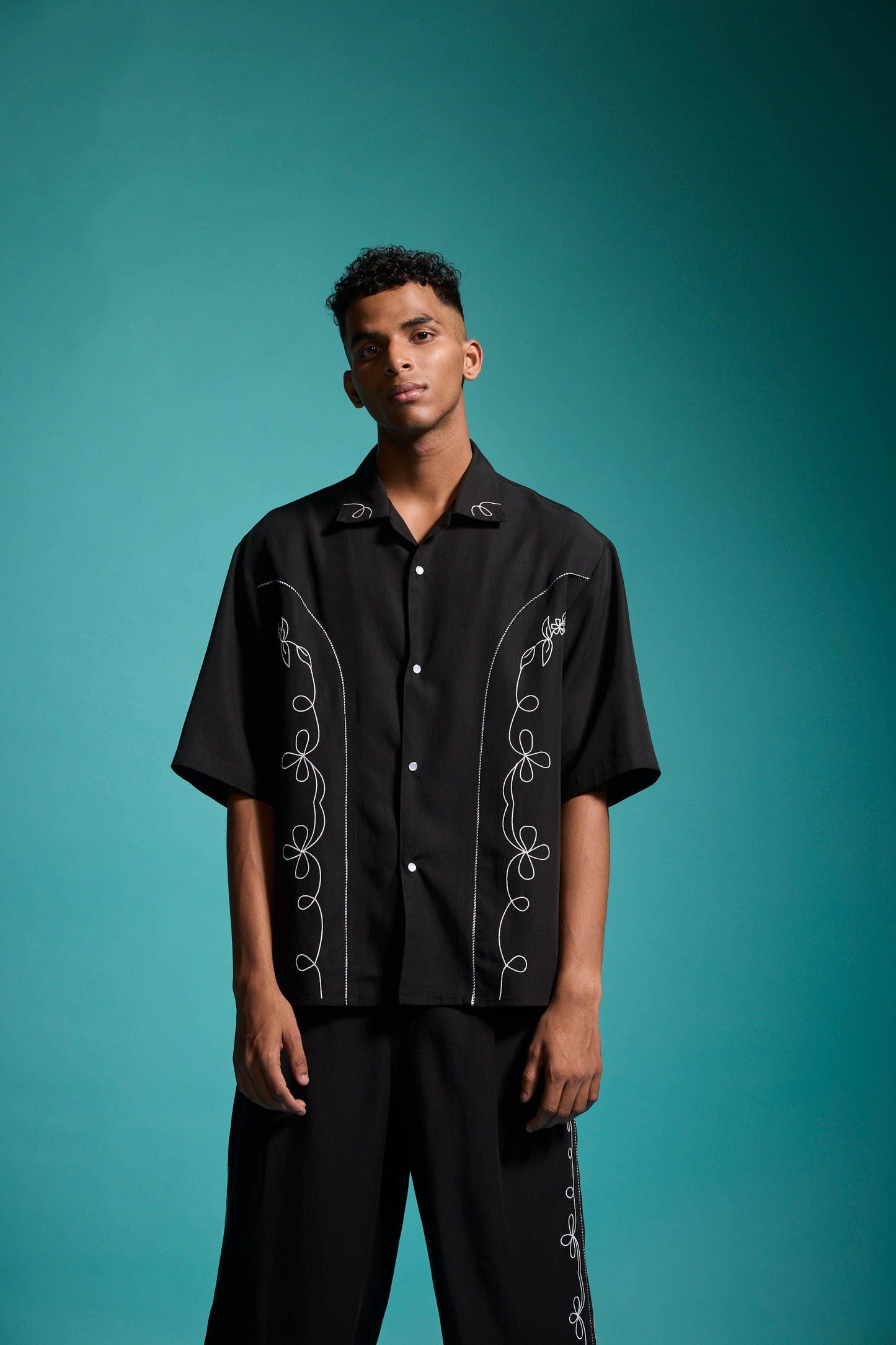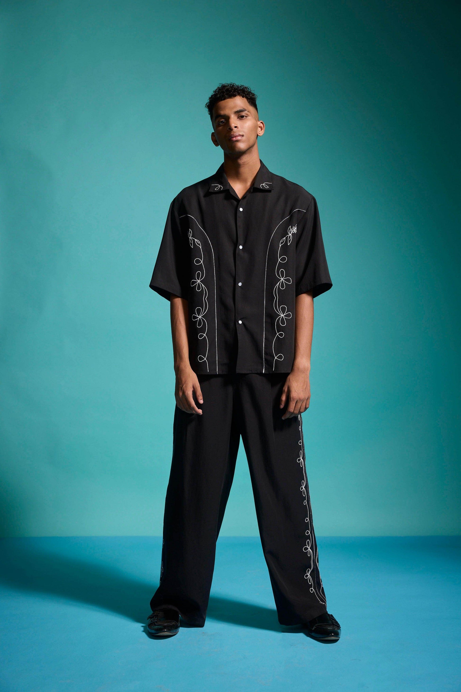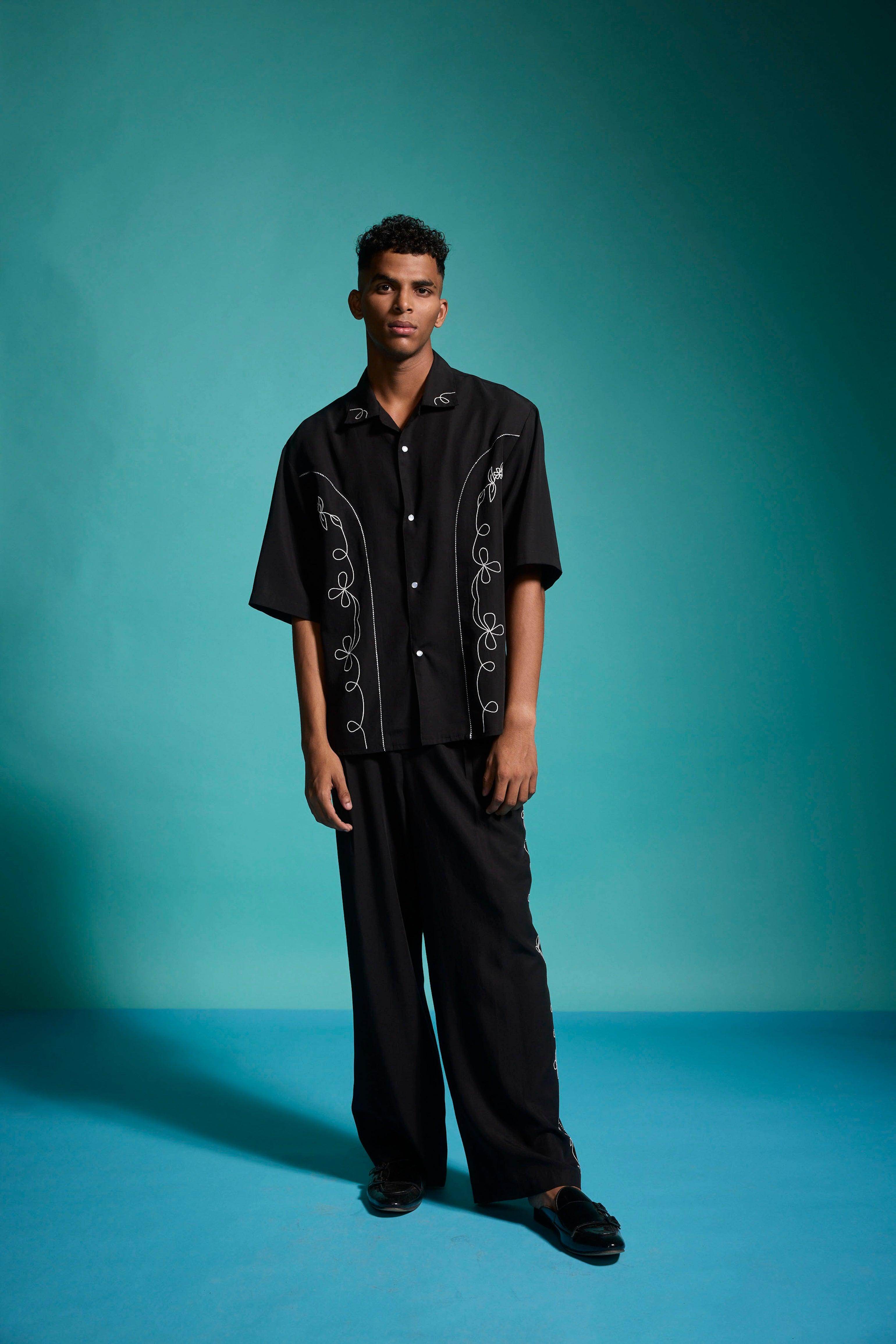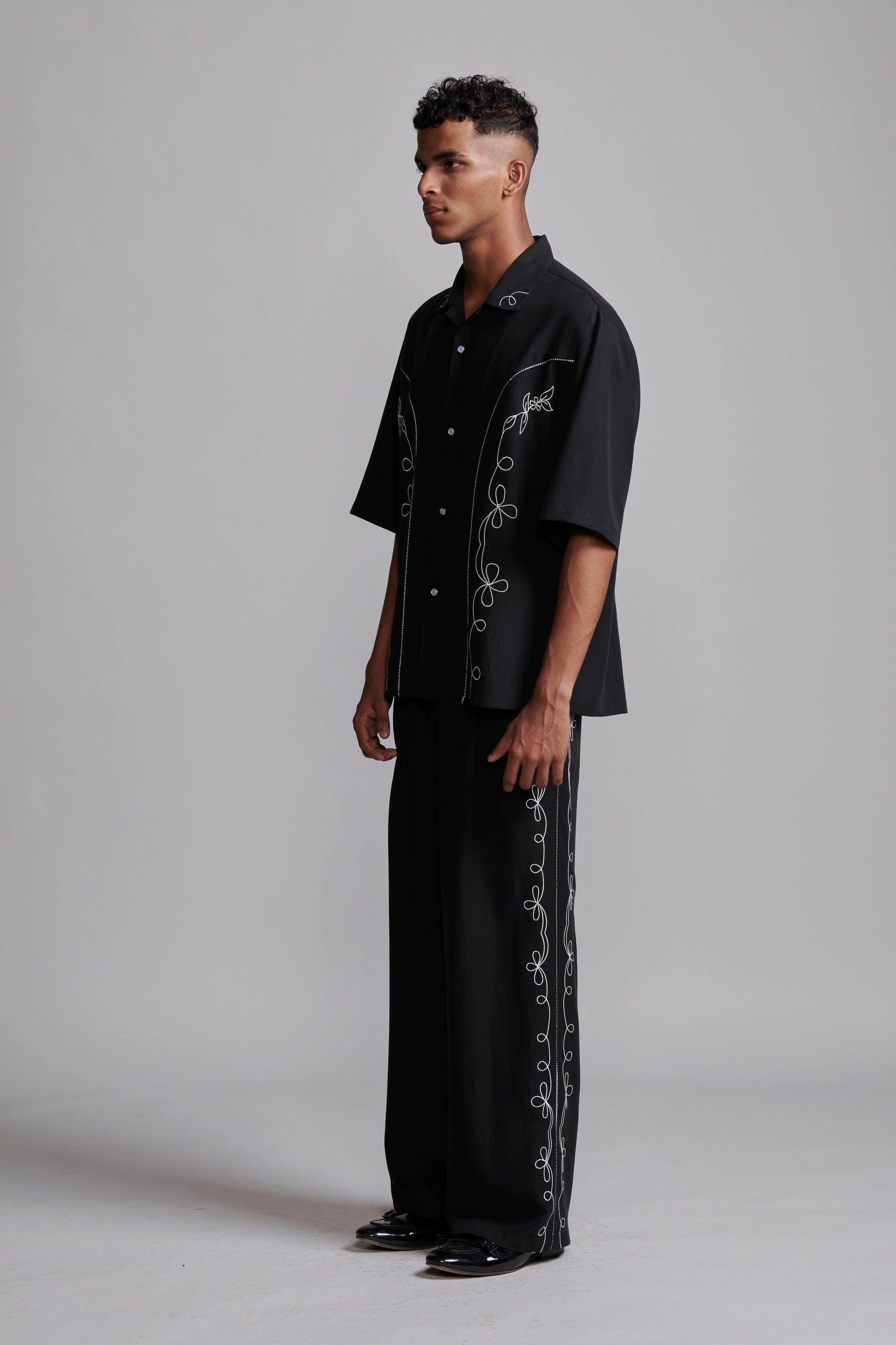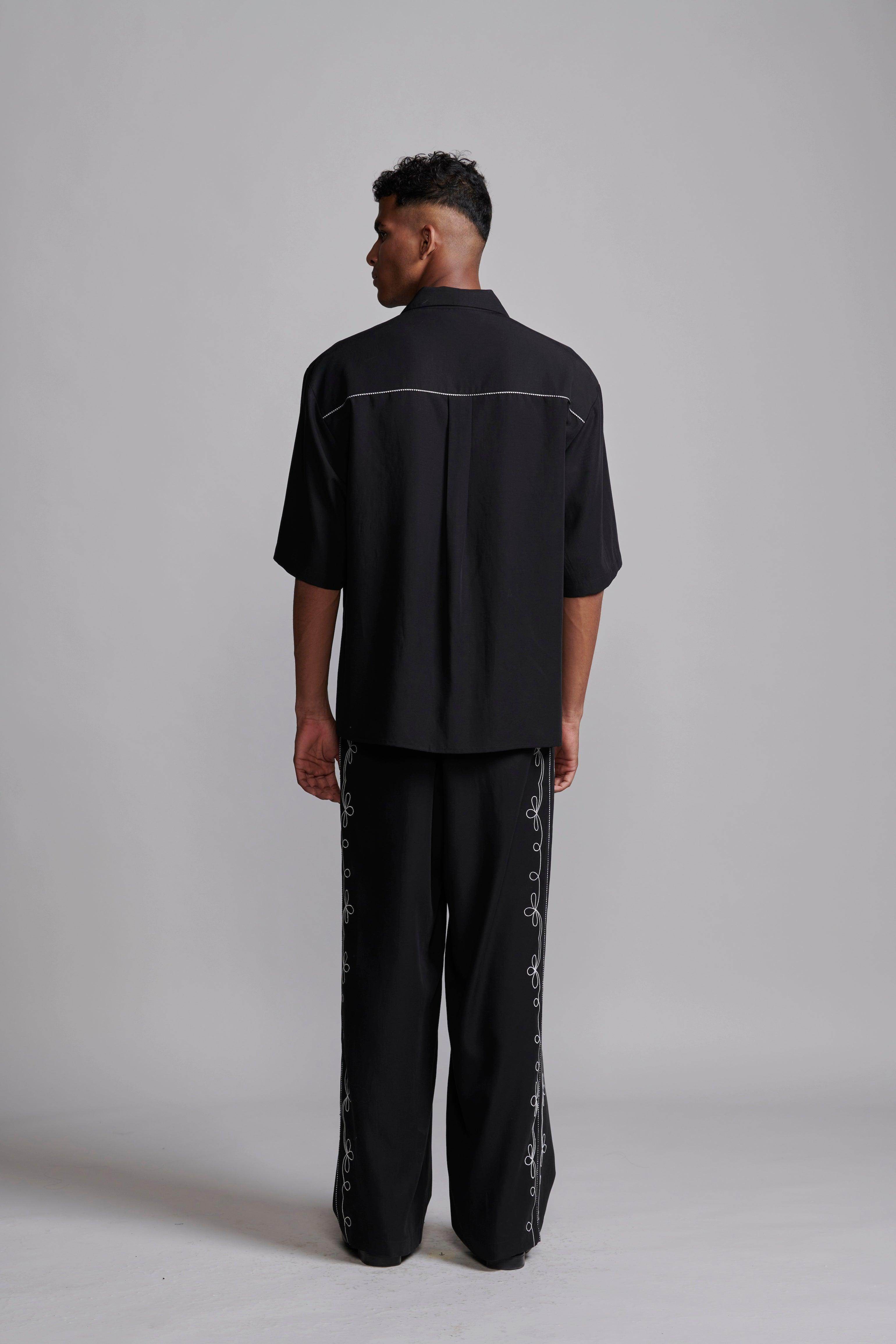 Black relaxed-fit shirt in sustainable, breathable Tencel. Contrast white embroidery down the front framed with black-and-white piping along the princess seams. Half sleeves with a notch collar. Snap button placket. Box pleat with piping at the back yoke. Side seam slits. Paired with black relaxed-fit shirt in sustainable, breathable Tencel. Contrast white embroidery down the front framed with black-and-white piping along the princess seams. Half sleeves with a notch collar. Snap button placket. Box pleat with piping at the back yoke. Side seam slits.