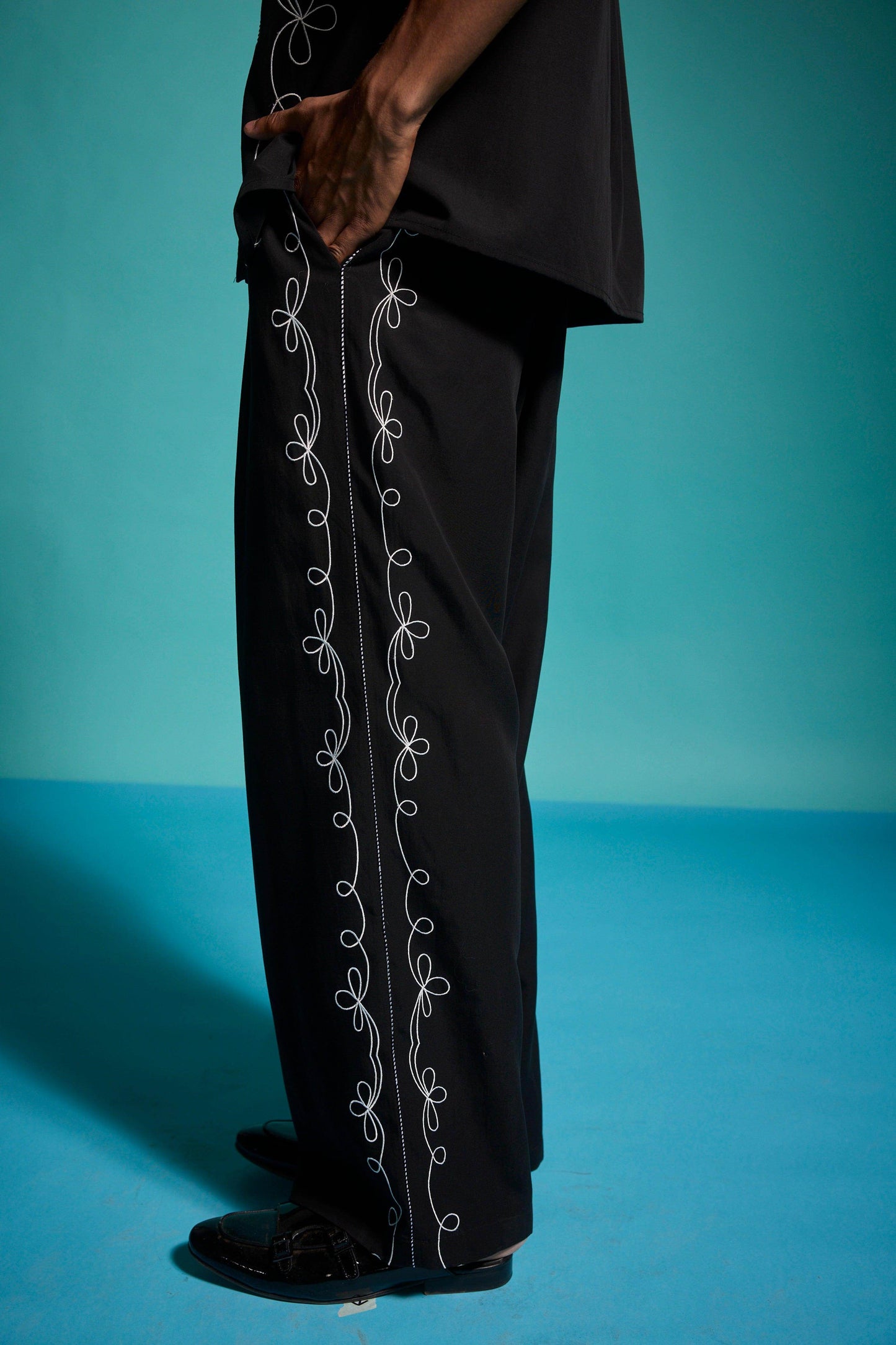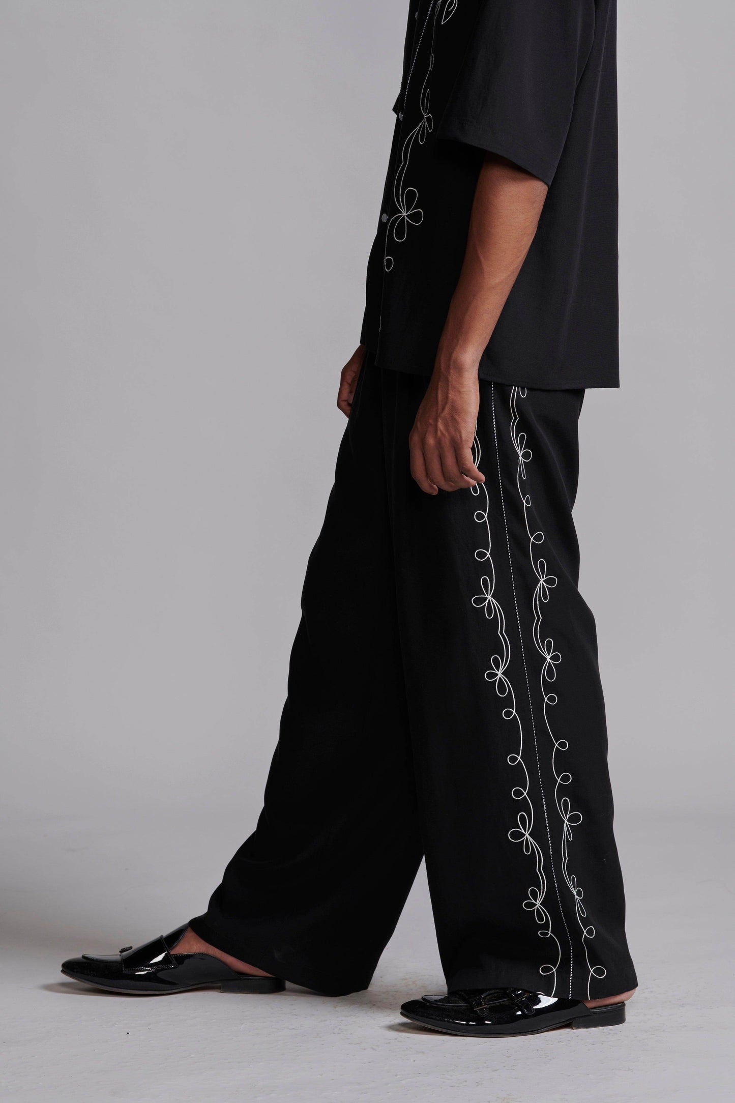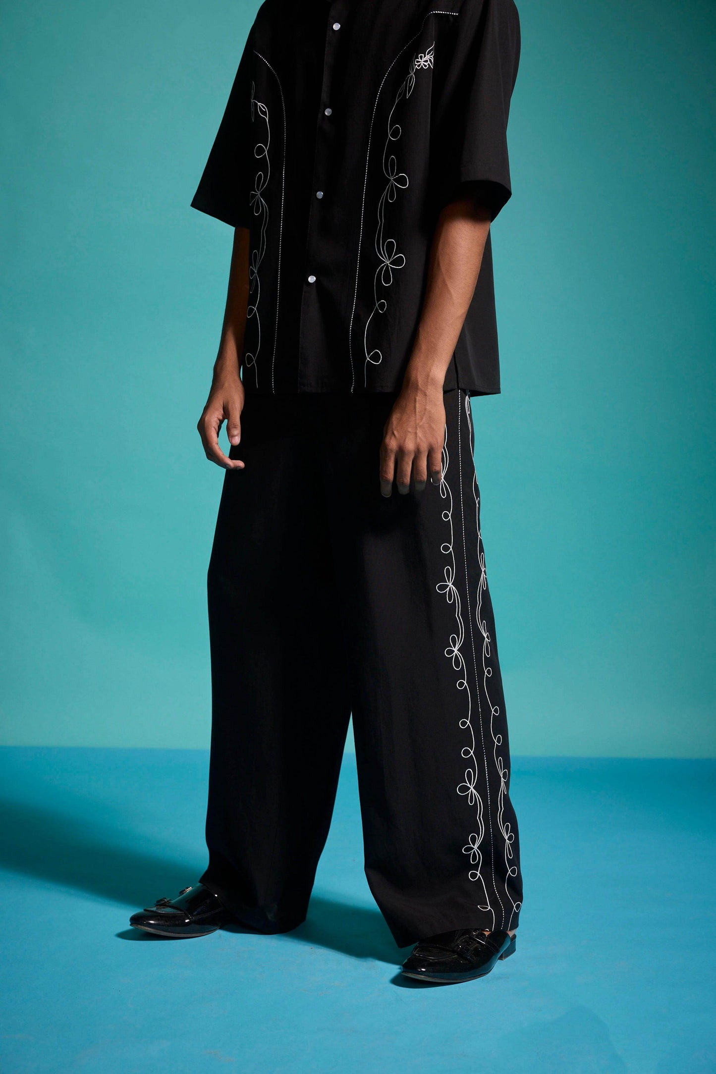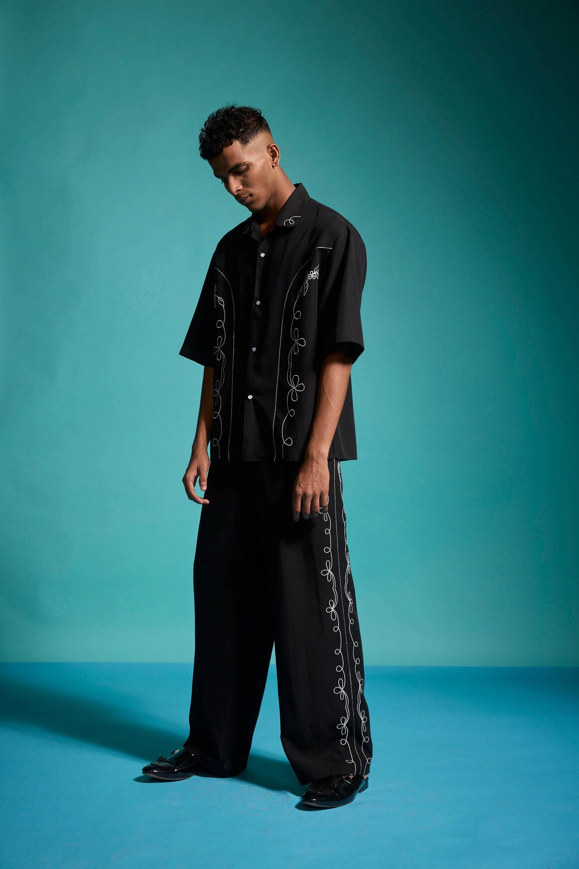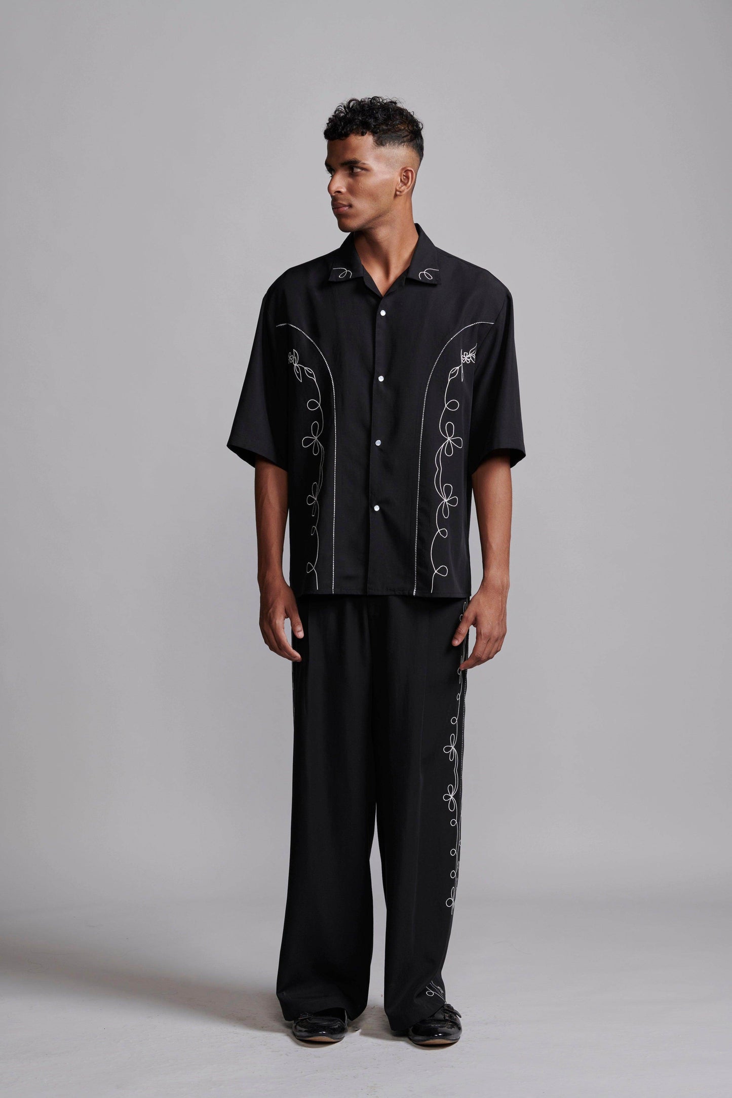Black relaxed-fit shirt in sustainable, breathable Tencel. Contrast white embroidery down the front framed with black-and-white piping along the princess seams. Half sleeves with a notch collar. Snap button placket. Box pleat with piping at the back yoke. Side seam slits. Paired with black relaxed-fit shirt in sustainable, breathable Tencel. Contrast white embroidery down the front framed with black-and-white piping along the princess seams. Half sleeves with a notch collar. Snap button placket. Box pleat with piping at the back yoke. Side seam slits.