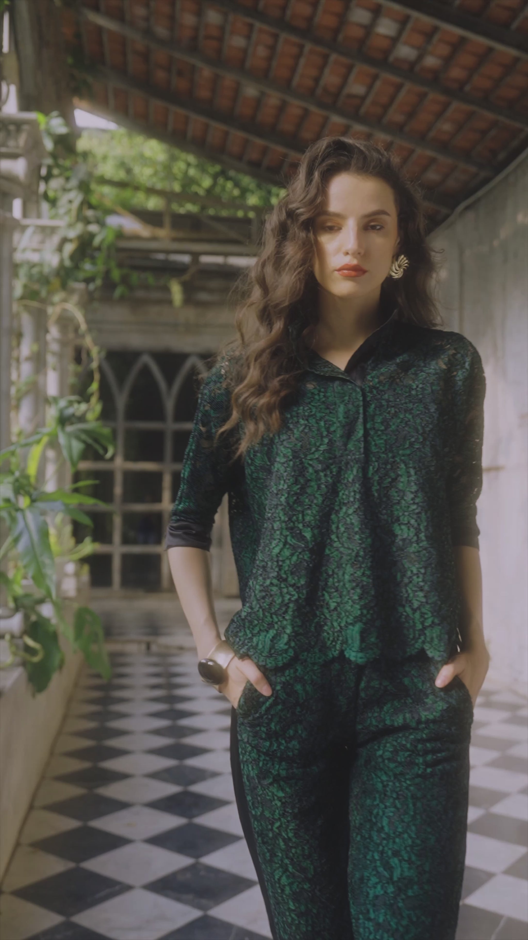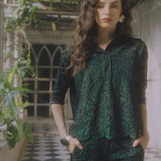 Intricate emerald lace top with intricate floral detailing. Contrast black embroidery on the surface with a textured lace layer over a floral lace base. Concealed popover placket with a band collar. Drop shoulders, cropped sleeves with satin contrast cuffs and placket. High-low scalloped hem with slits in the sides. Relaxed, Boxy fit. Comes with a slip. Paired with straight fit pant in matching emerald lace. Contrast black satin cut and sew panel down the side seams. Scalloped hem. Structured waistband. Concealed zipper with hook/eye closure. Pockets in the sides. Garment is fully lined.