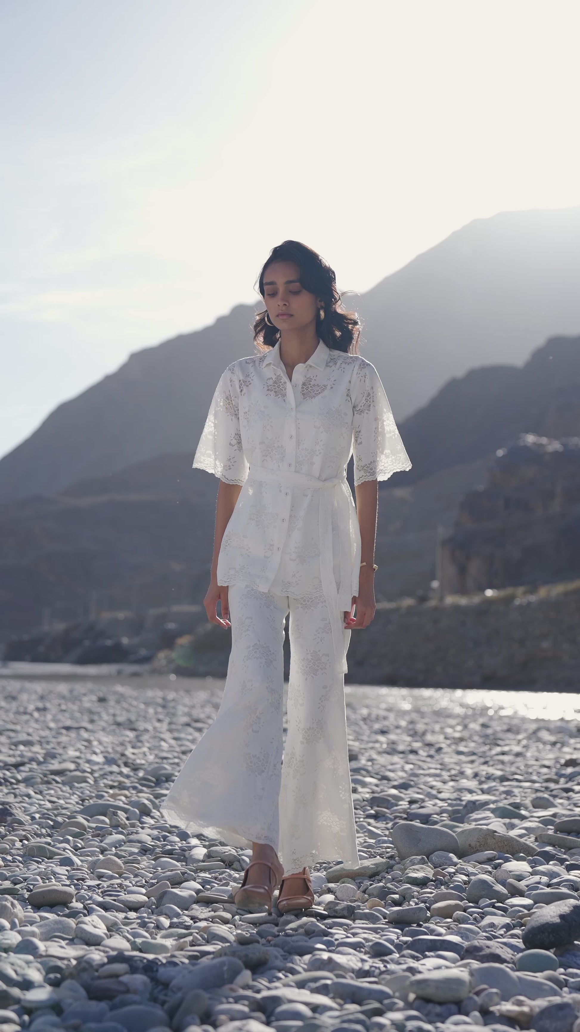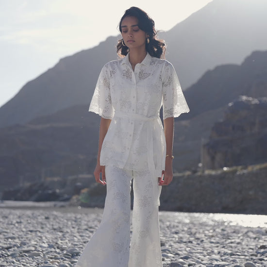 Relaxed fit top in knitted floral lace fabric. Scalloped crop sleeves and hem. Shirt collar with front button down placket. Comes with a waist tie. Made in lightweight, breathable fabric. Includes a matching slip.