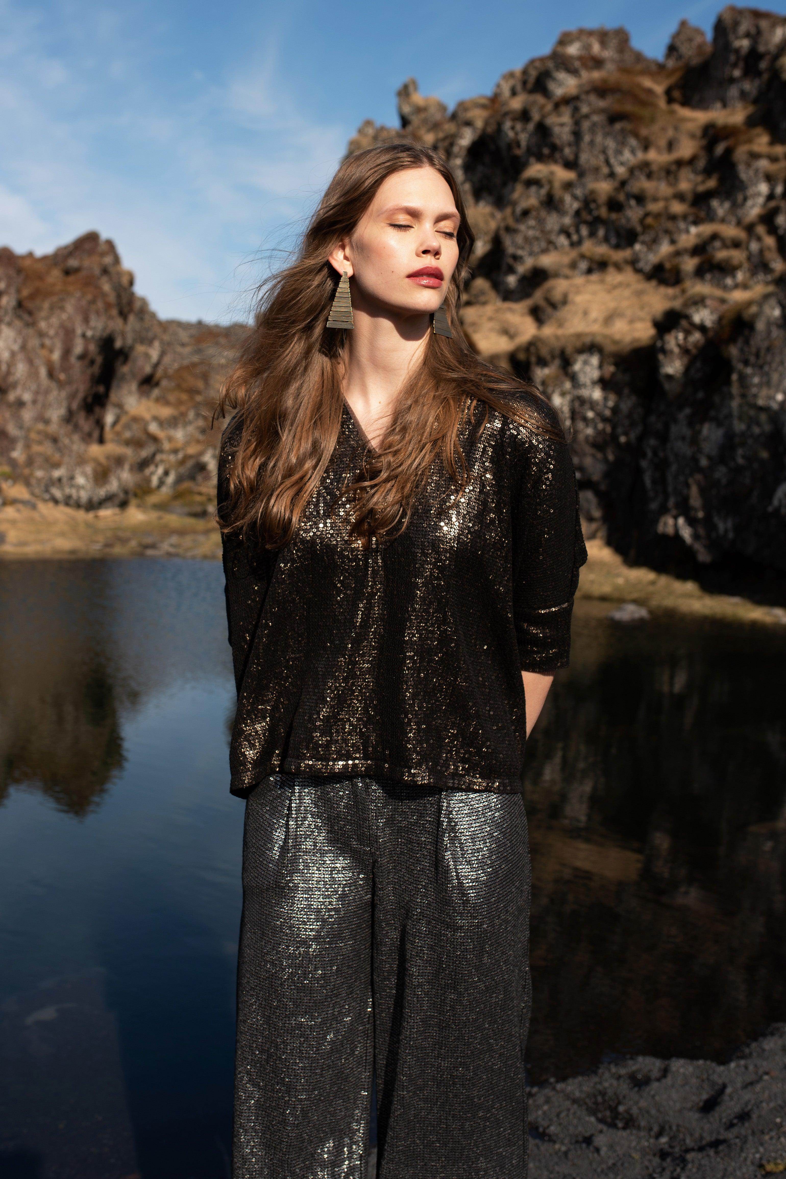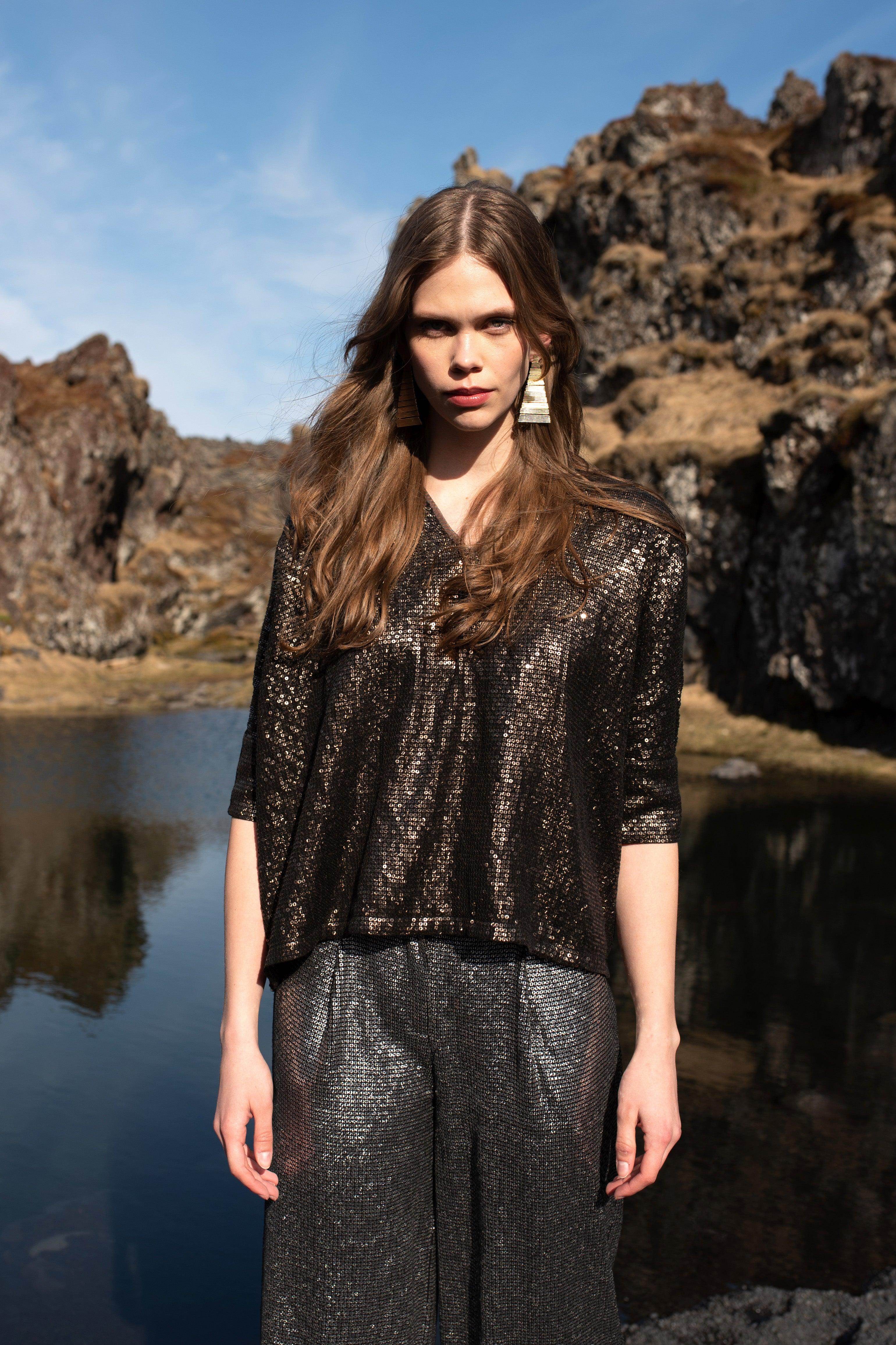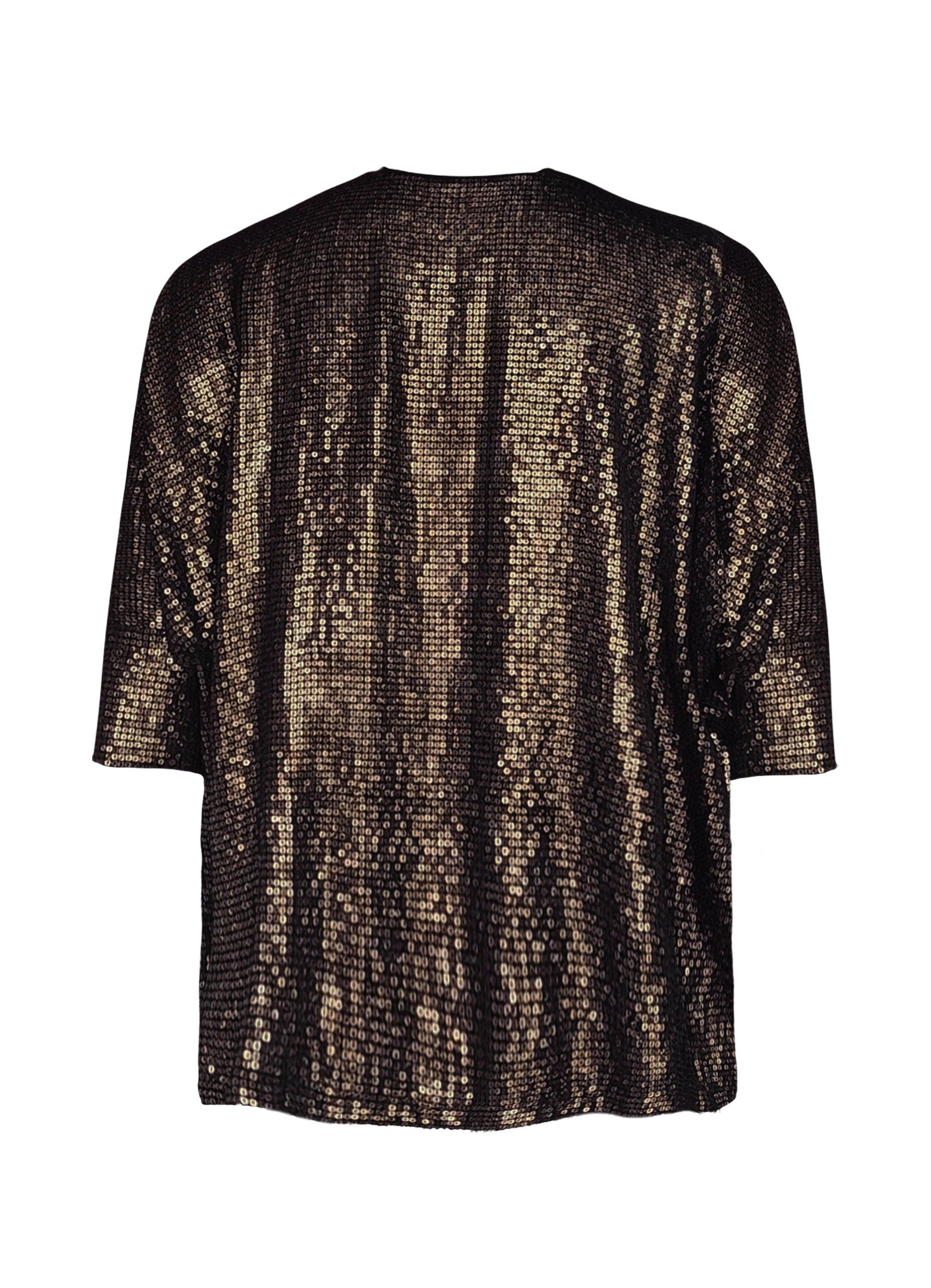 Dull bronze boxy sequin top with a V-neck. Three-fourth sleeves.