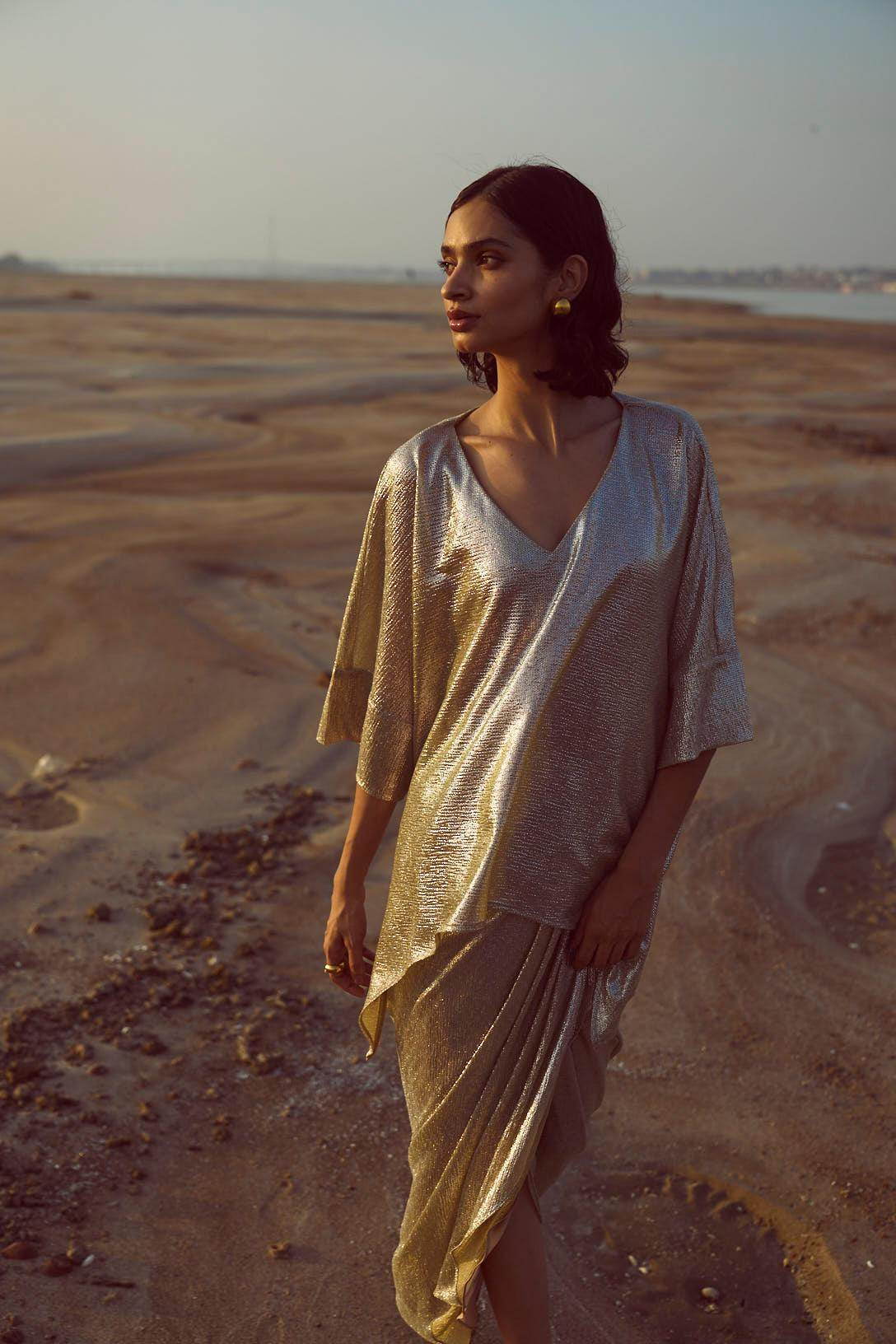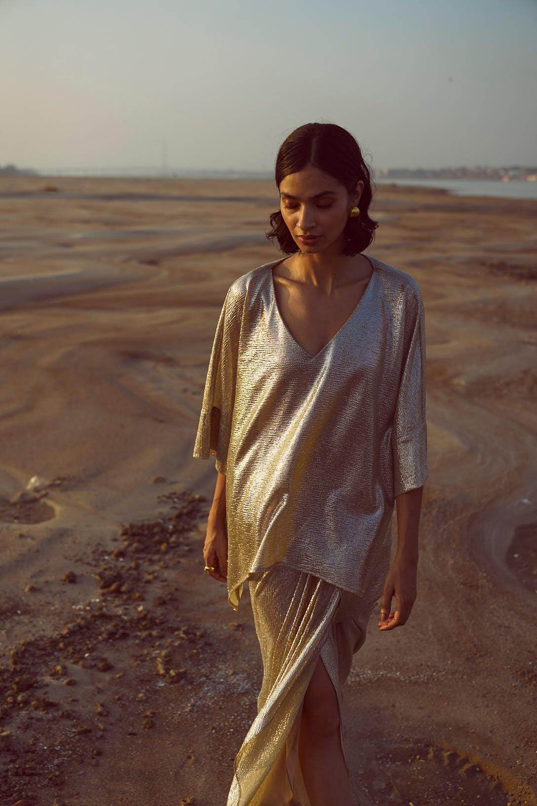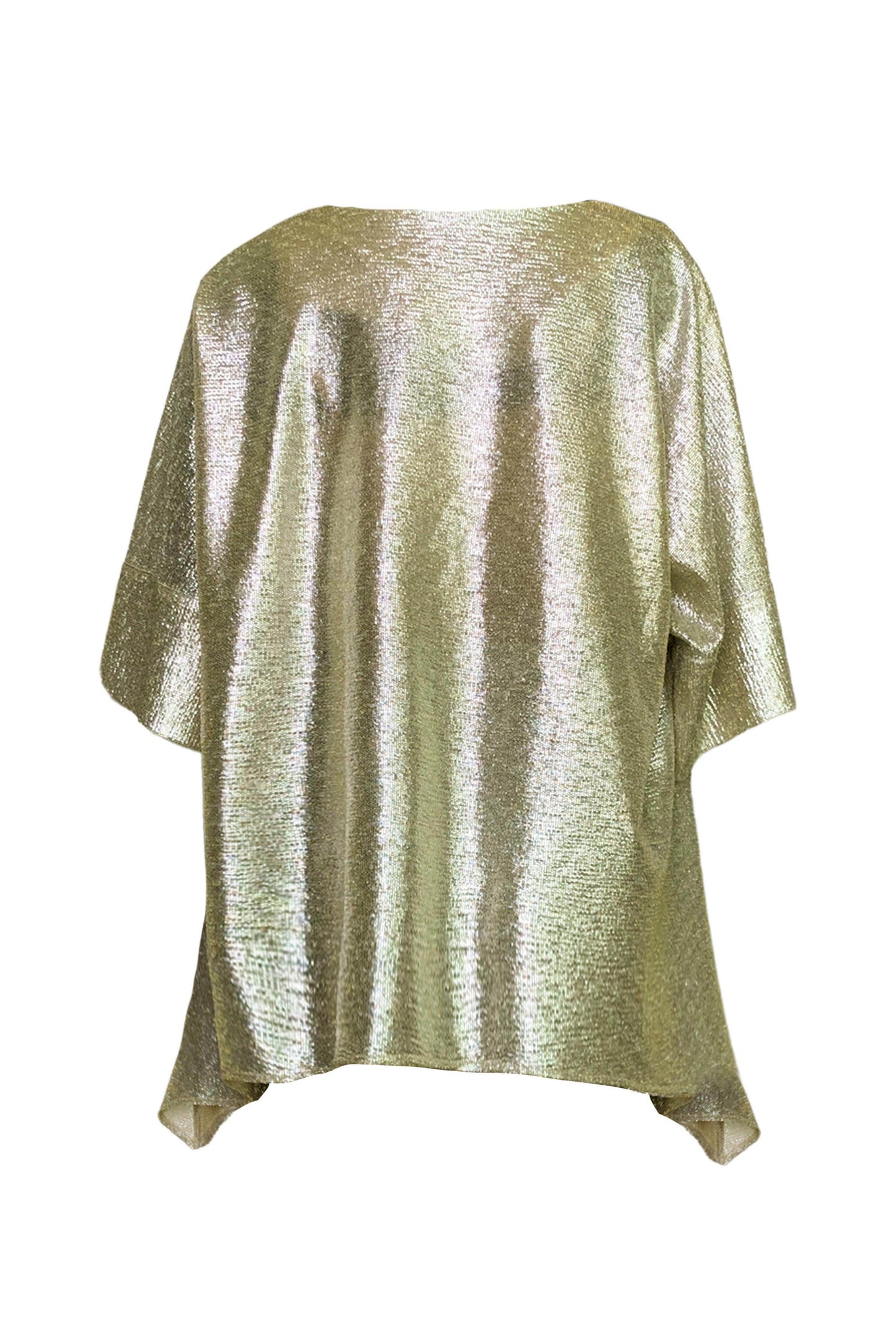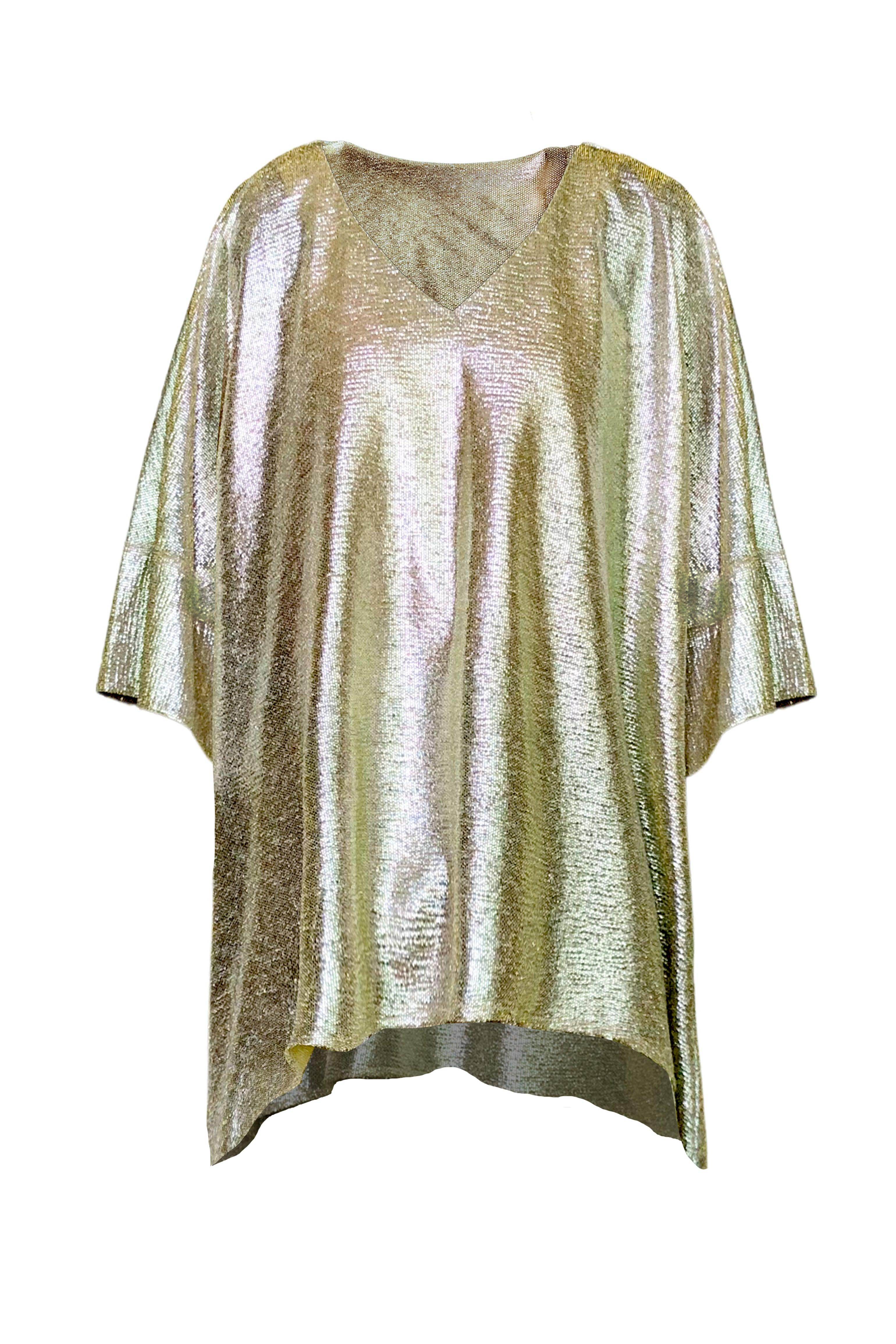 Champagne coloured boxy popover lamé top. V-neckline. Elbow length dolman sleeves. Uneven hem. Comes with a cami slip.