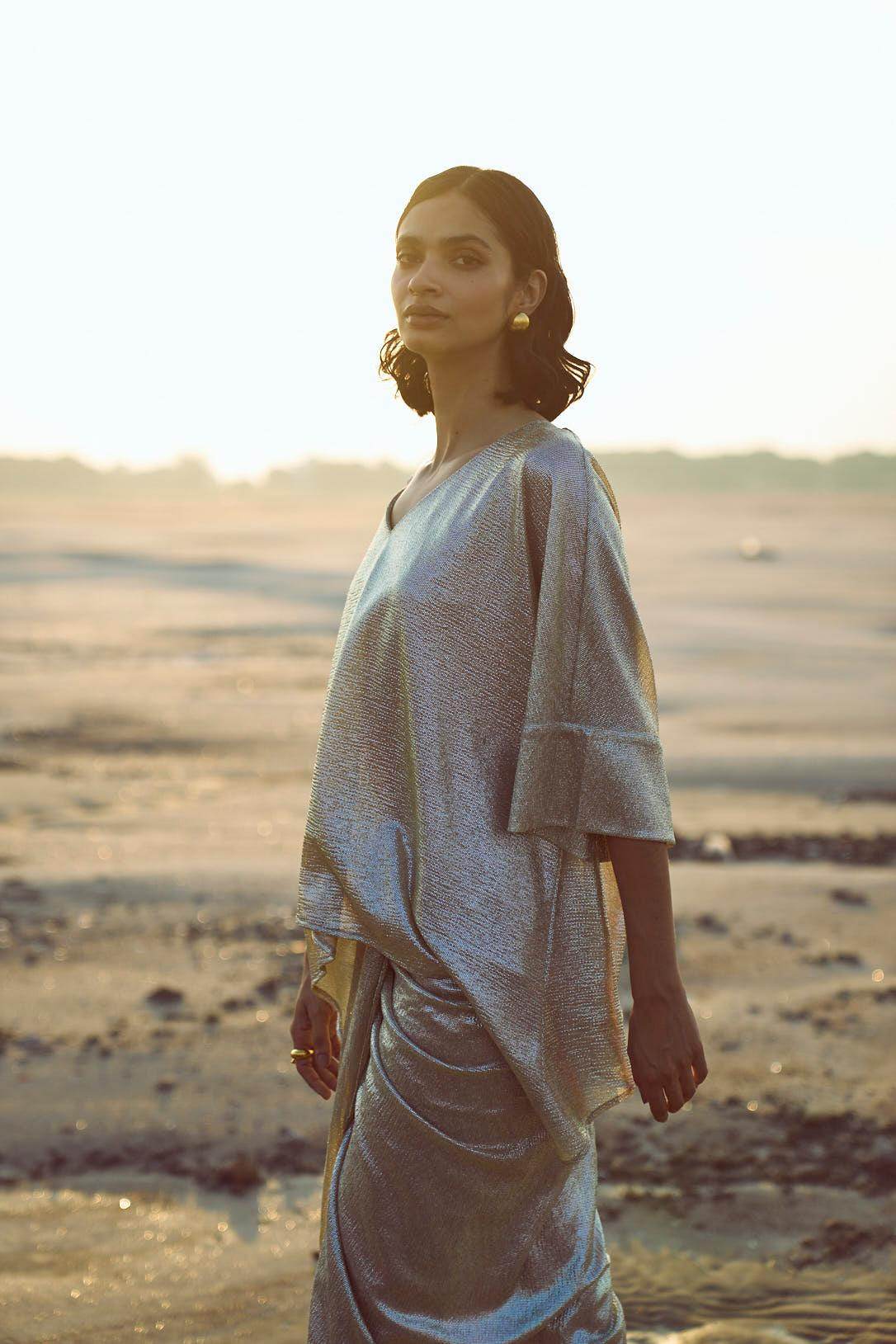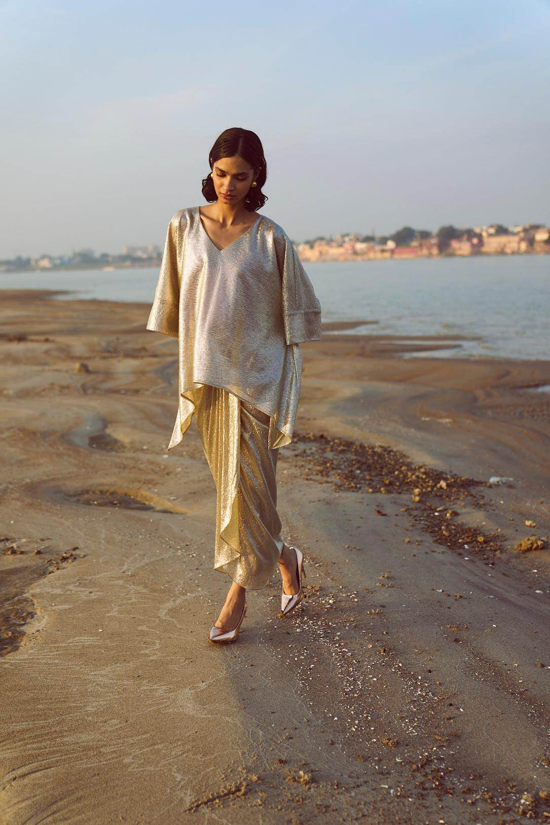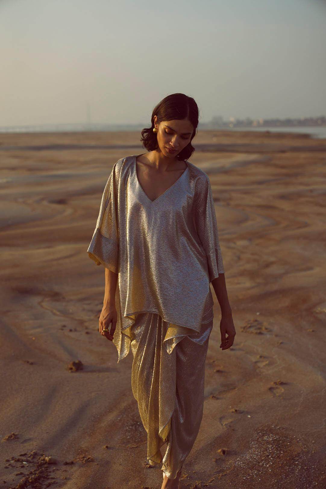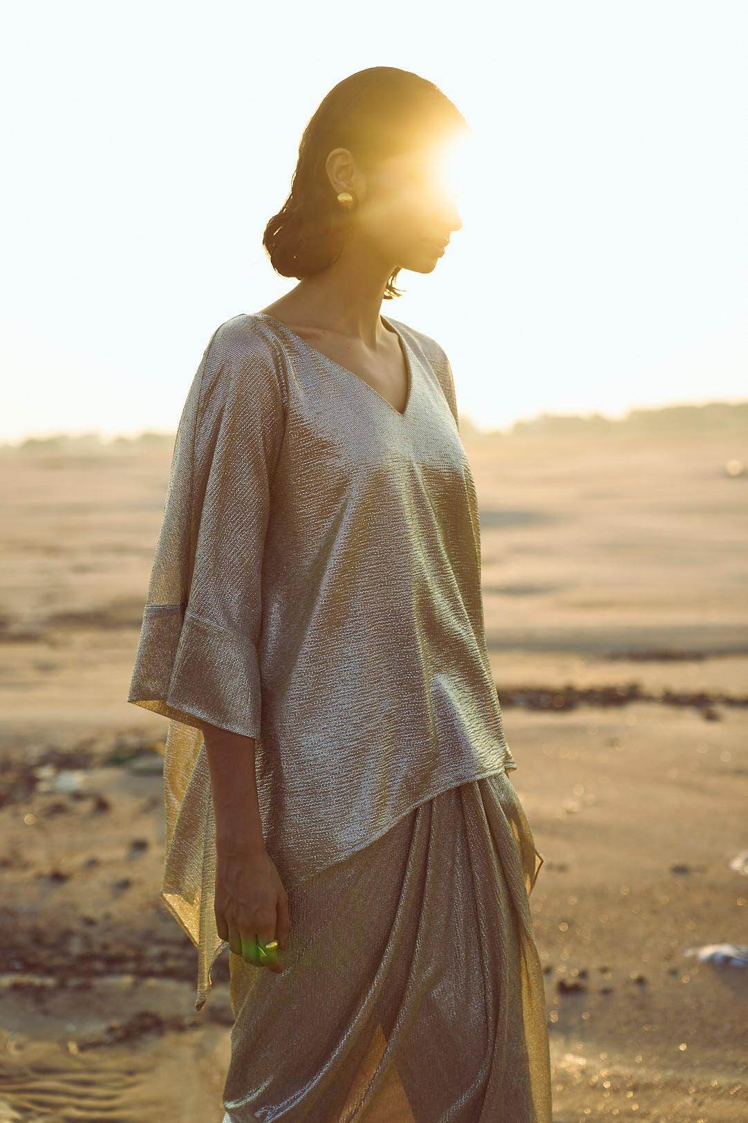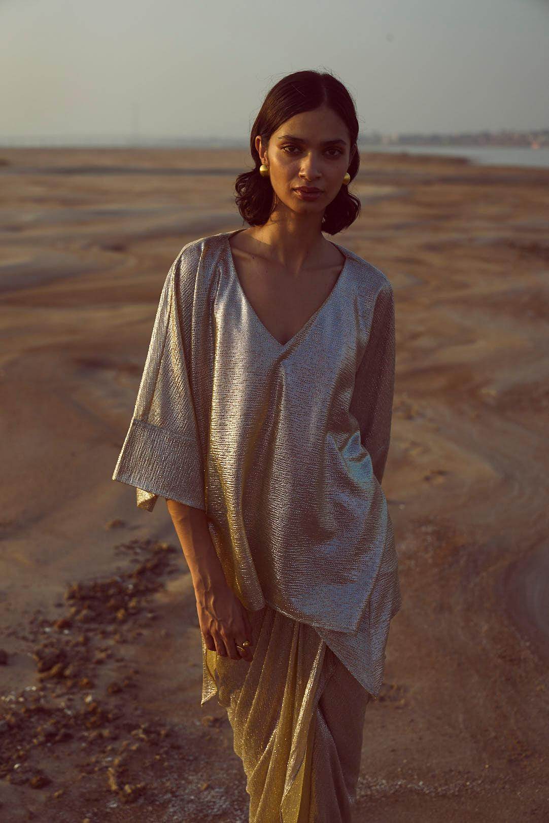 Champagne coloured boxy popover lamé top. V-neckline. Elbow length dolman sleeves. Uneven hem. Comes with a cami slip.