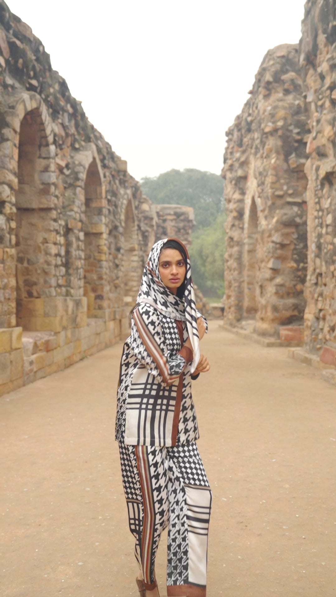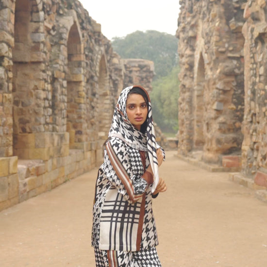 Houndstooth and geometric blocked print in tones of black, white, cream and brown. Breathable, textured organic viscose base. Straight pant with a semi-elasticated waist and pockets in the sides.