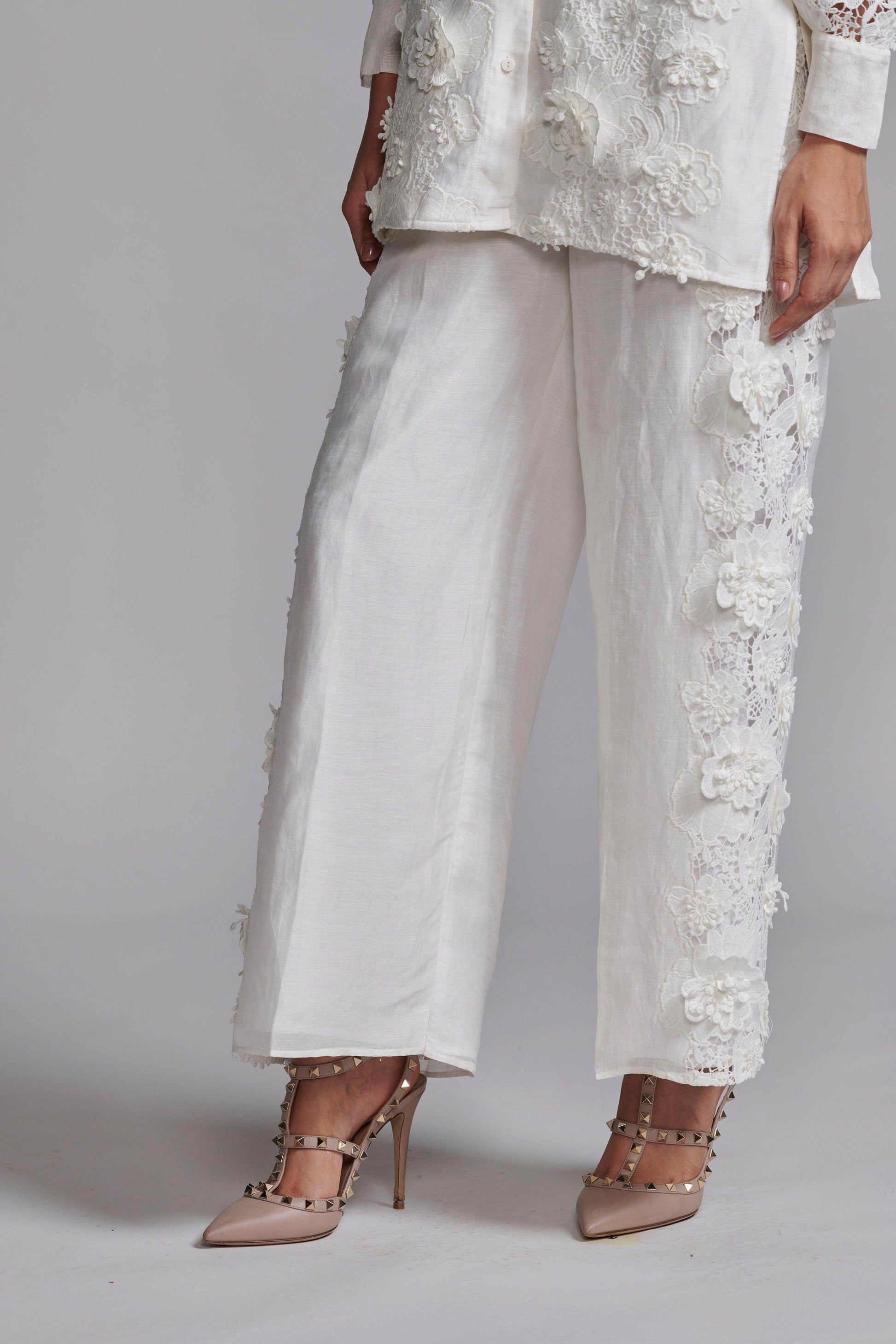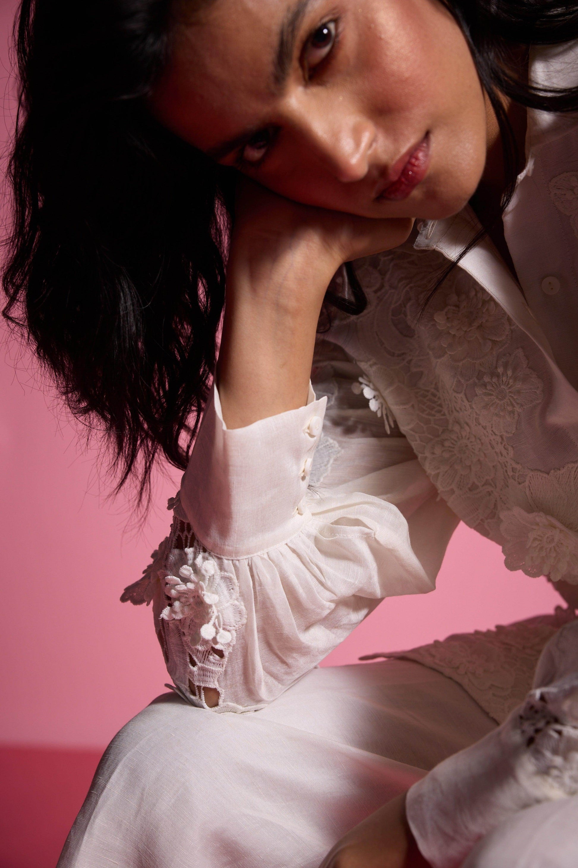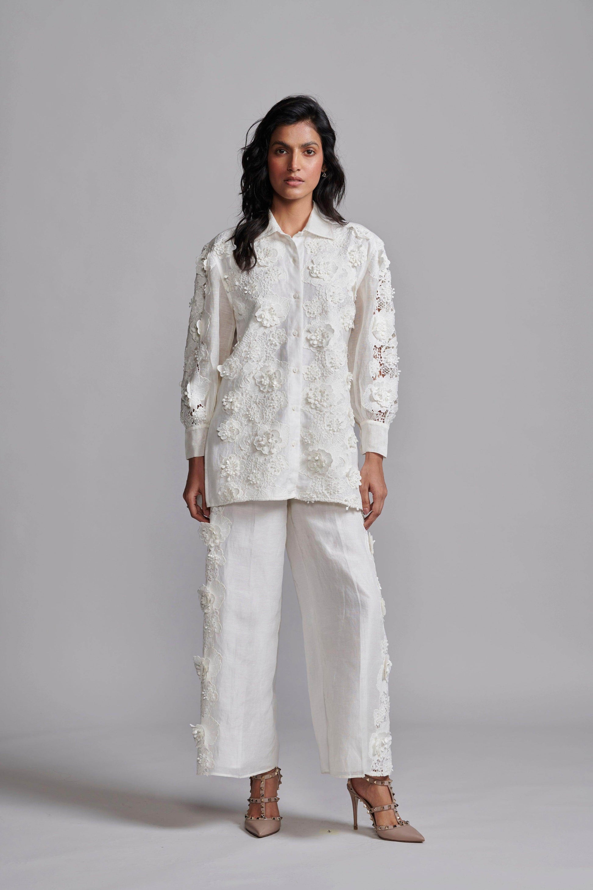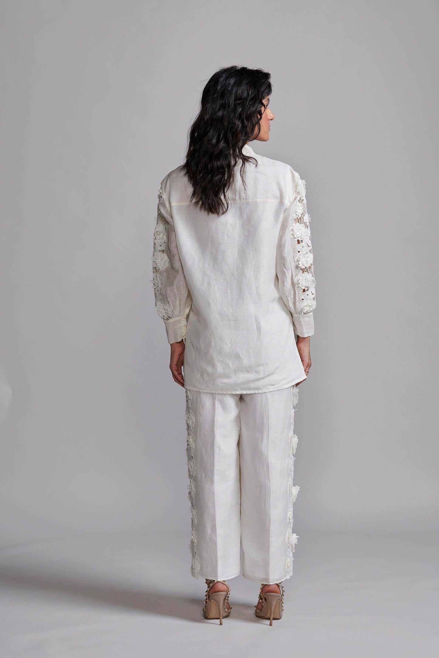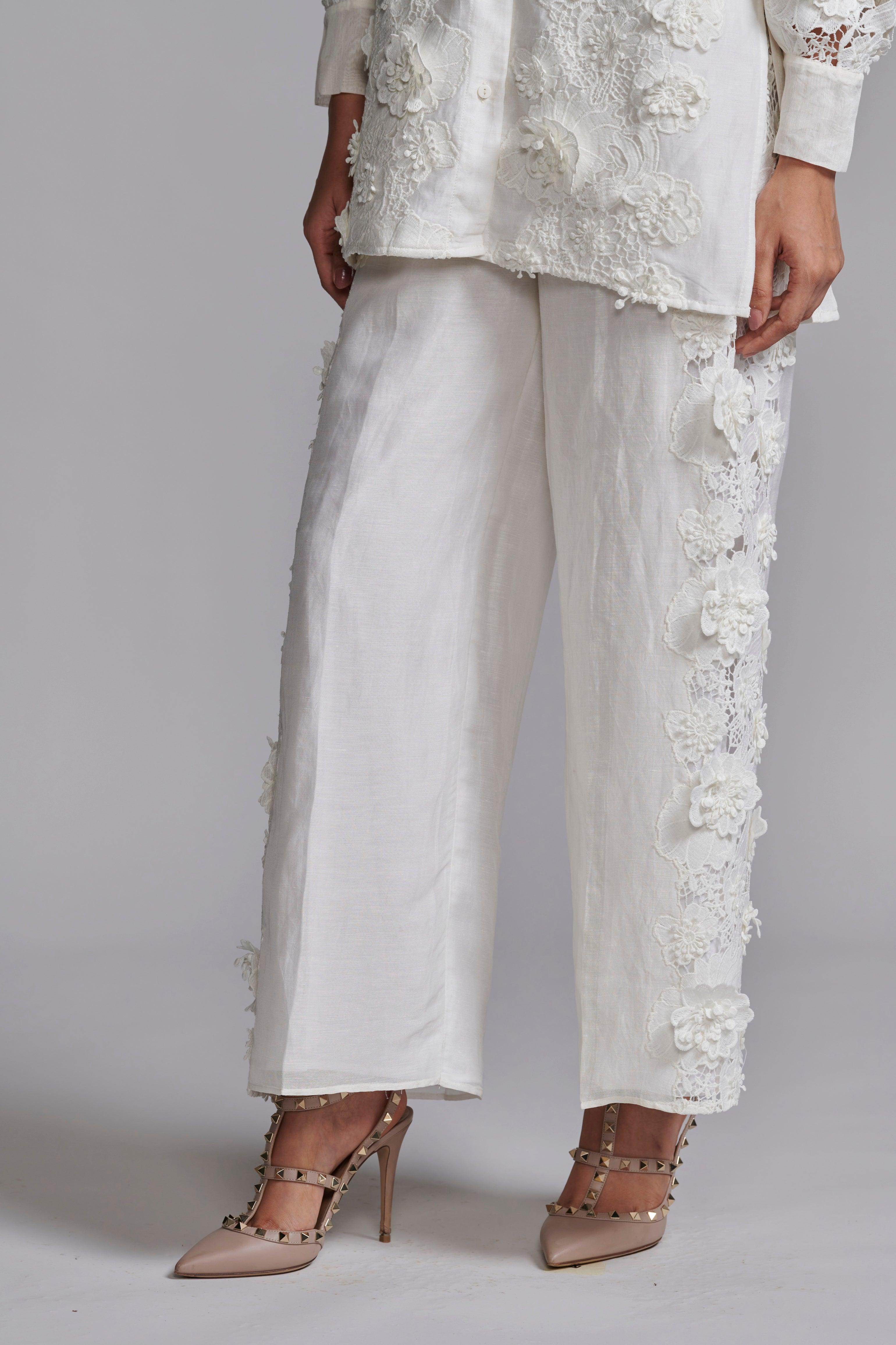 Off-white relaxed fit shirt in a luxurious linen and silk blend. Features 3D cotton floral lace appliqué on the front and sleeves. Lined front and back. Long bishop sleeves, shirt collar, button-down front, and side slits. Paired with Off-white relaxed fit pants in a luxurious linen and silk blend. Features 3D cotton floral lace appliqué on the side seams. Fully lined. Semi-elasticated waist with front hook-and-eye and zip closure.