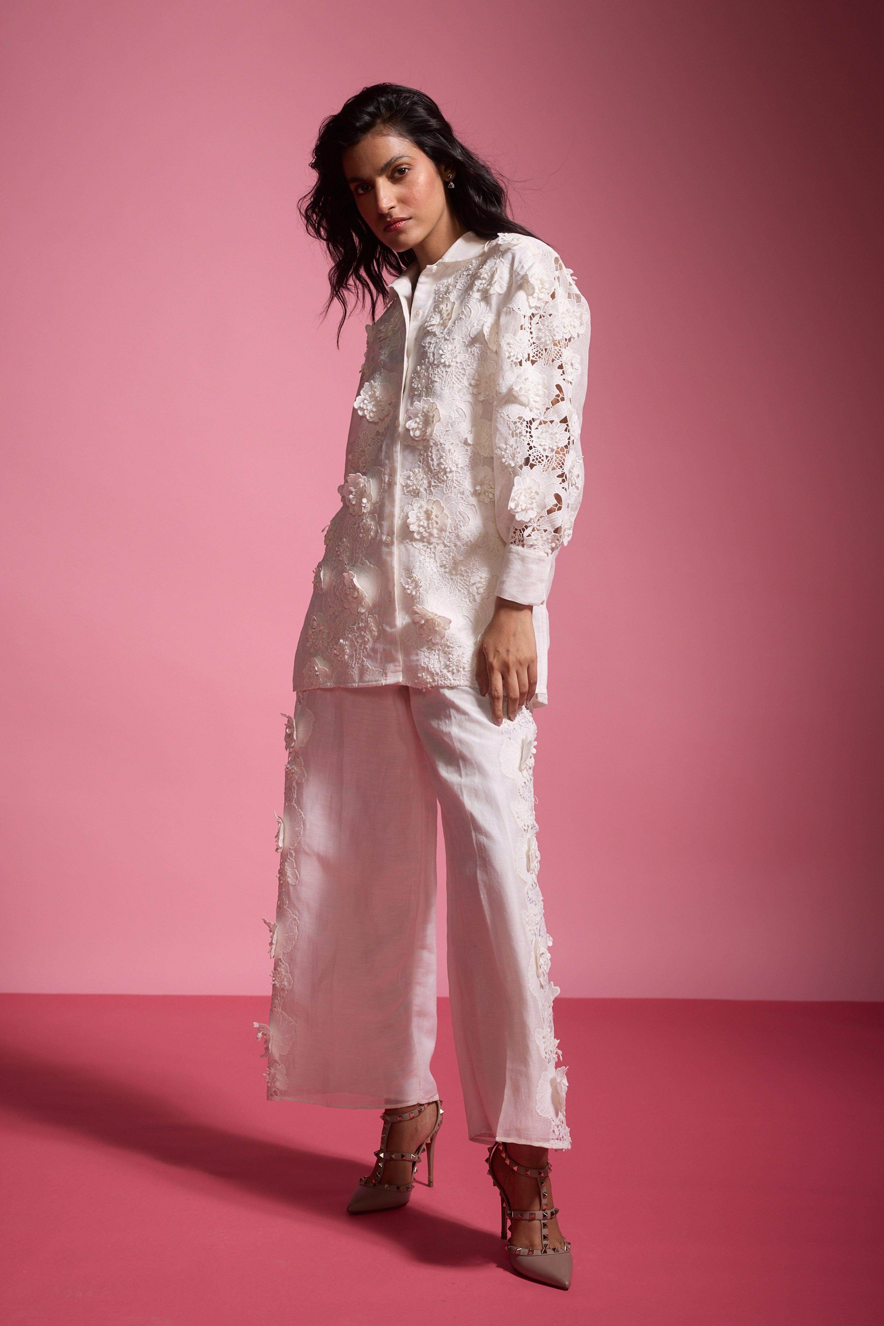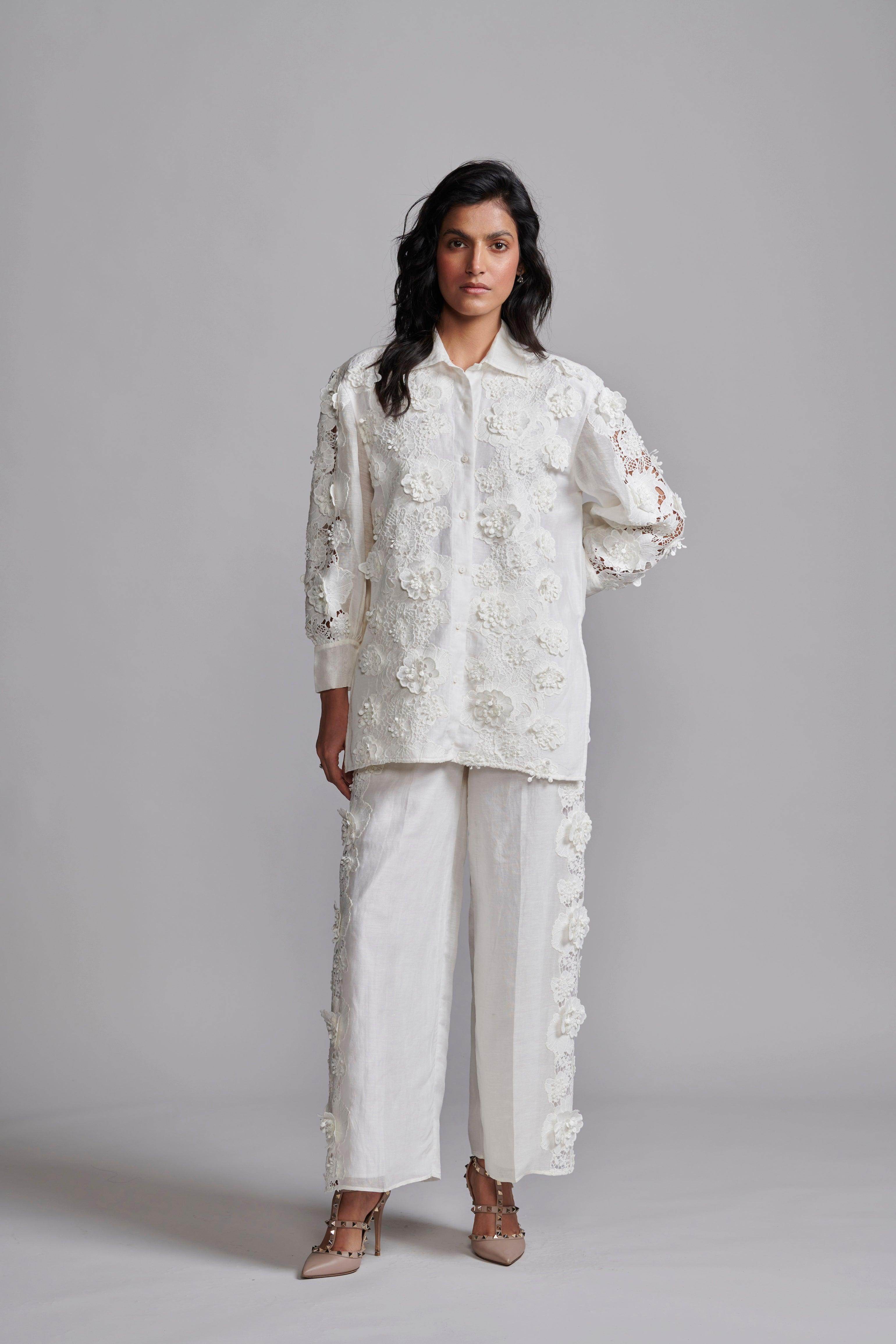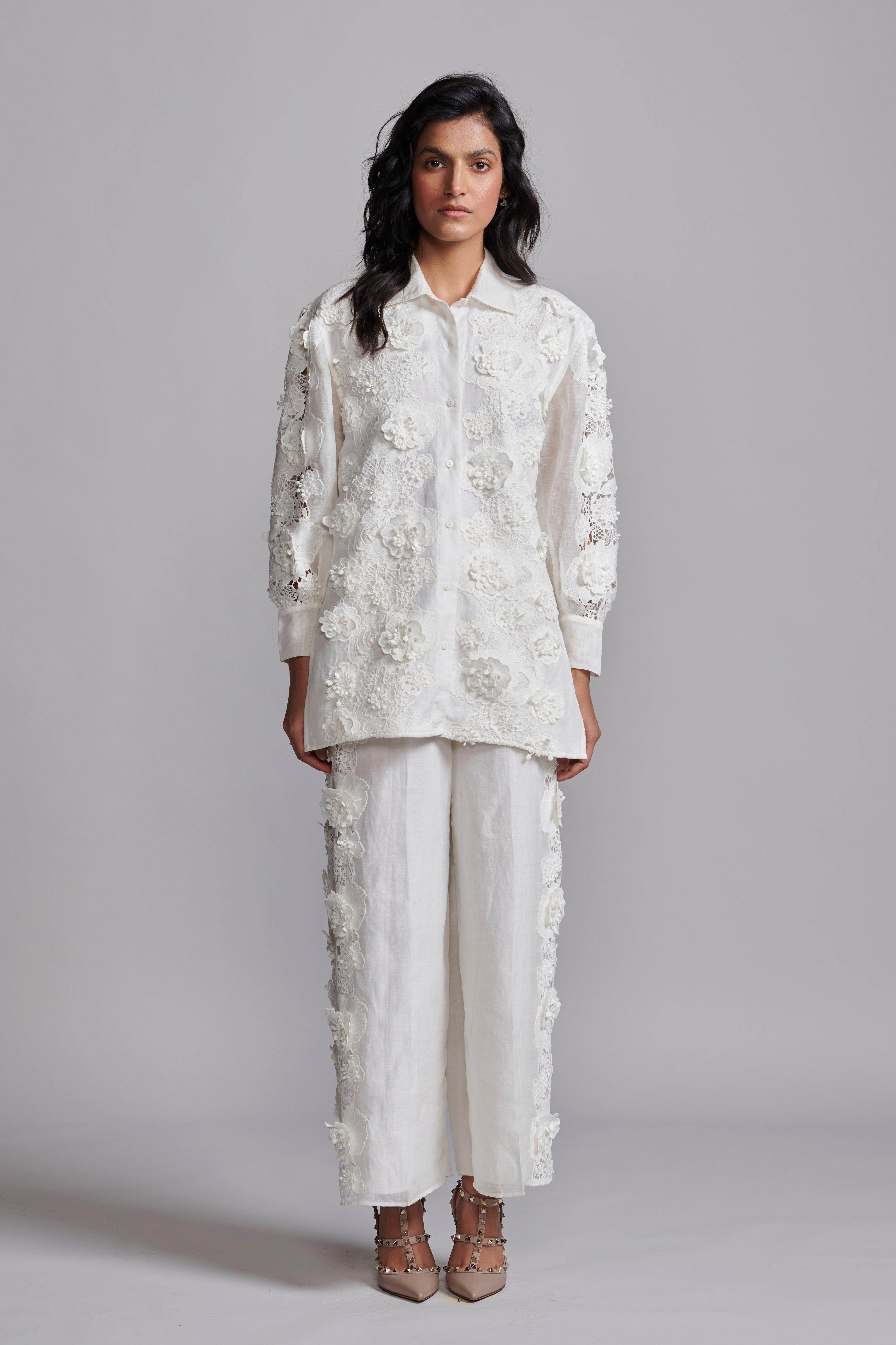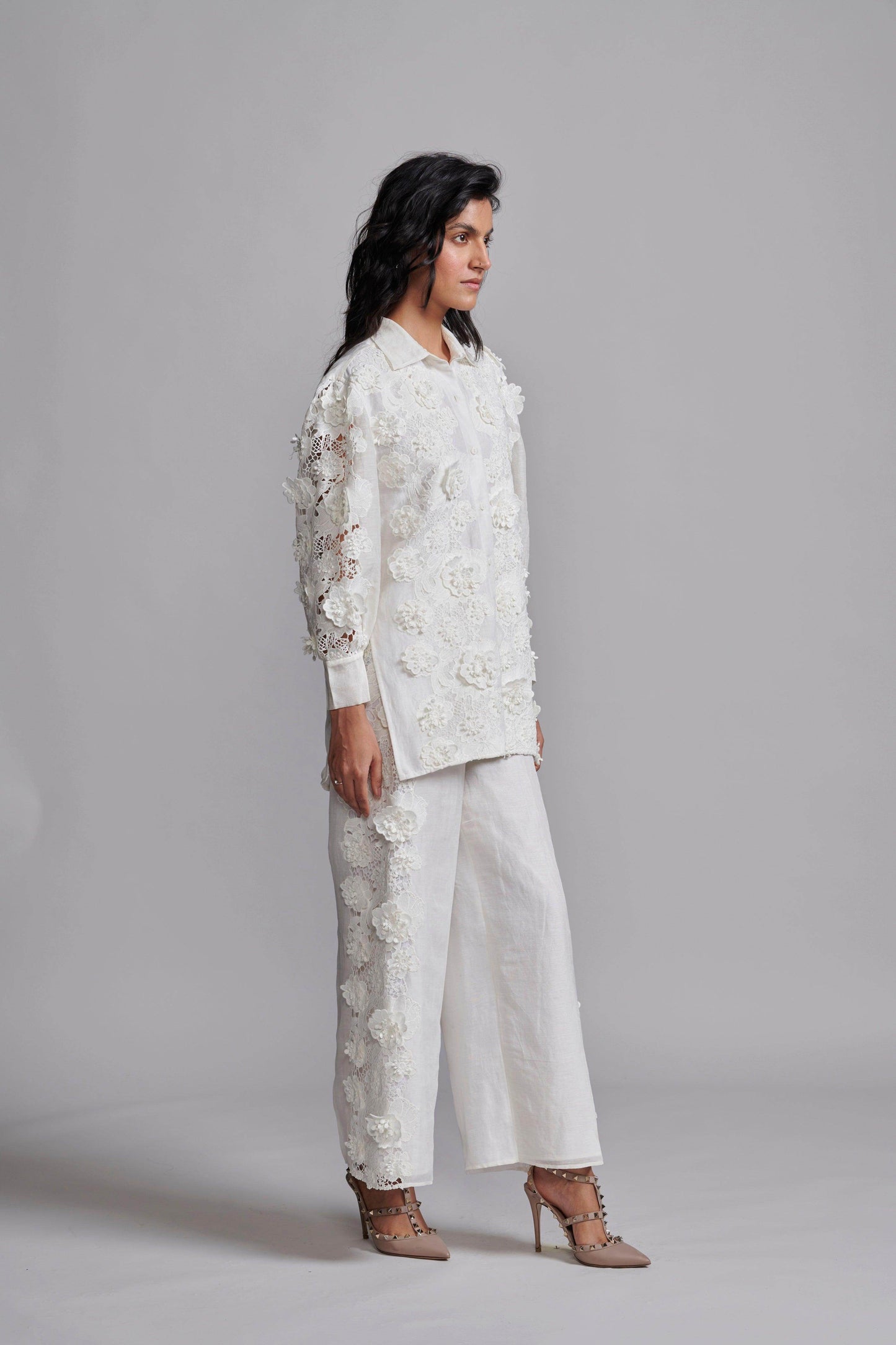 Off-white relaxed fit shirt in a luxurious linen and silk blend. Features 3D cotton floral lace appliqué on the front and sleeves. Lined front and back. Long bishop sleeves, shirt collar, button-down front, and side slits. Paired with Off-white relaxed fit pants in a luxurious linen and silk blend. Features 3D cotton floral lace appliqué on the side seams. Fully lined. Semi-elasticated waist with front hook-and-eye and zip closure.