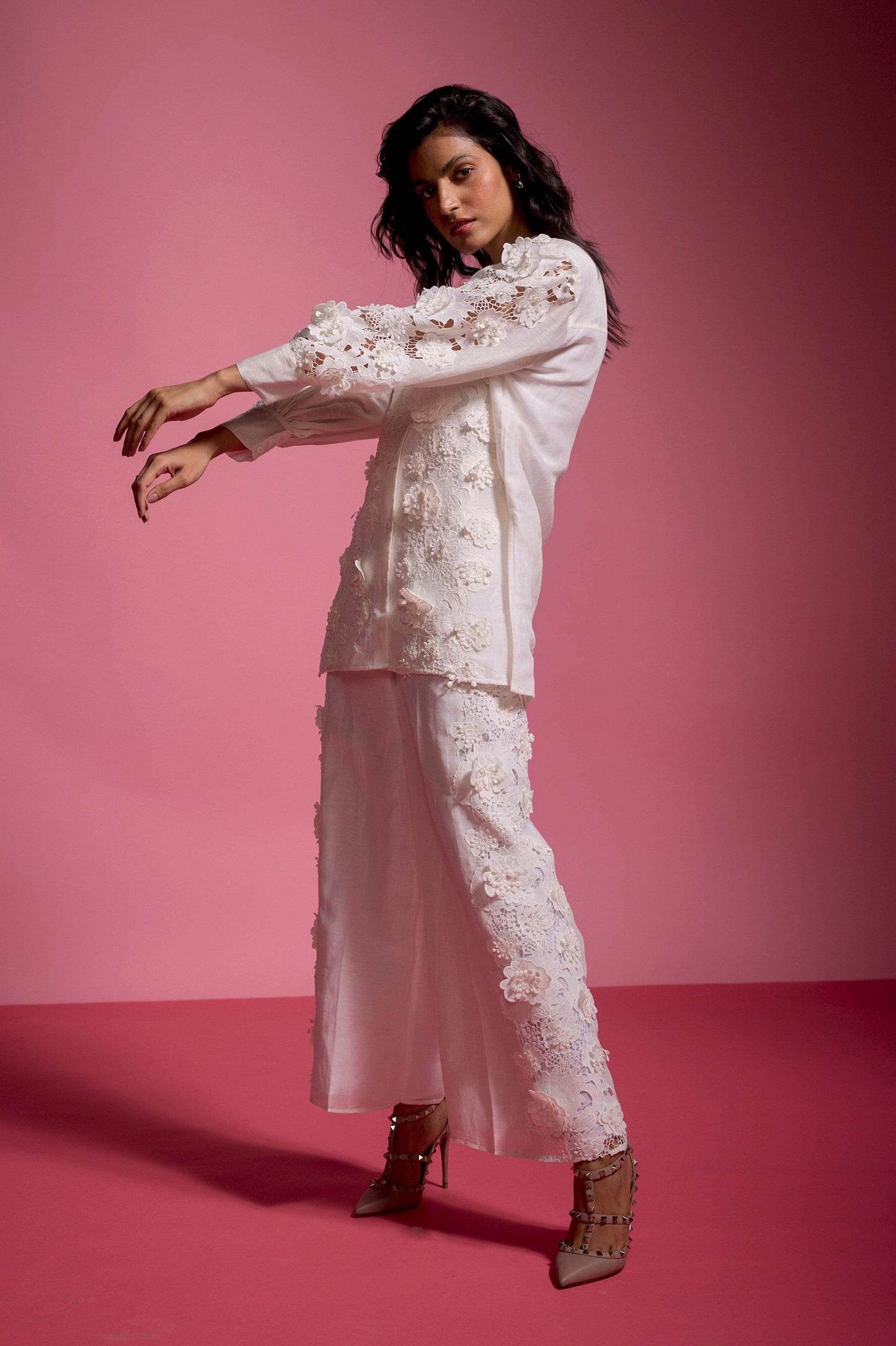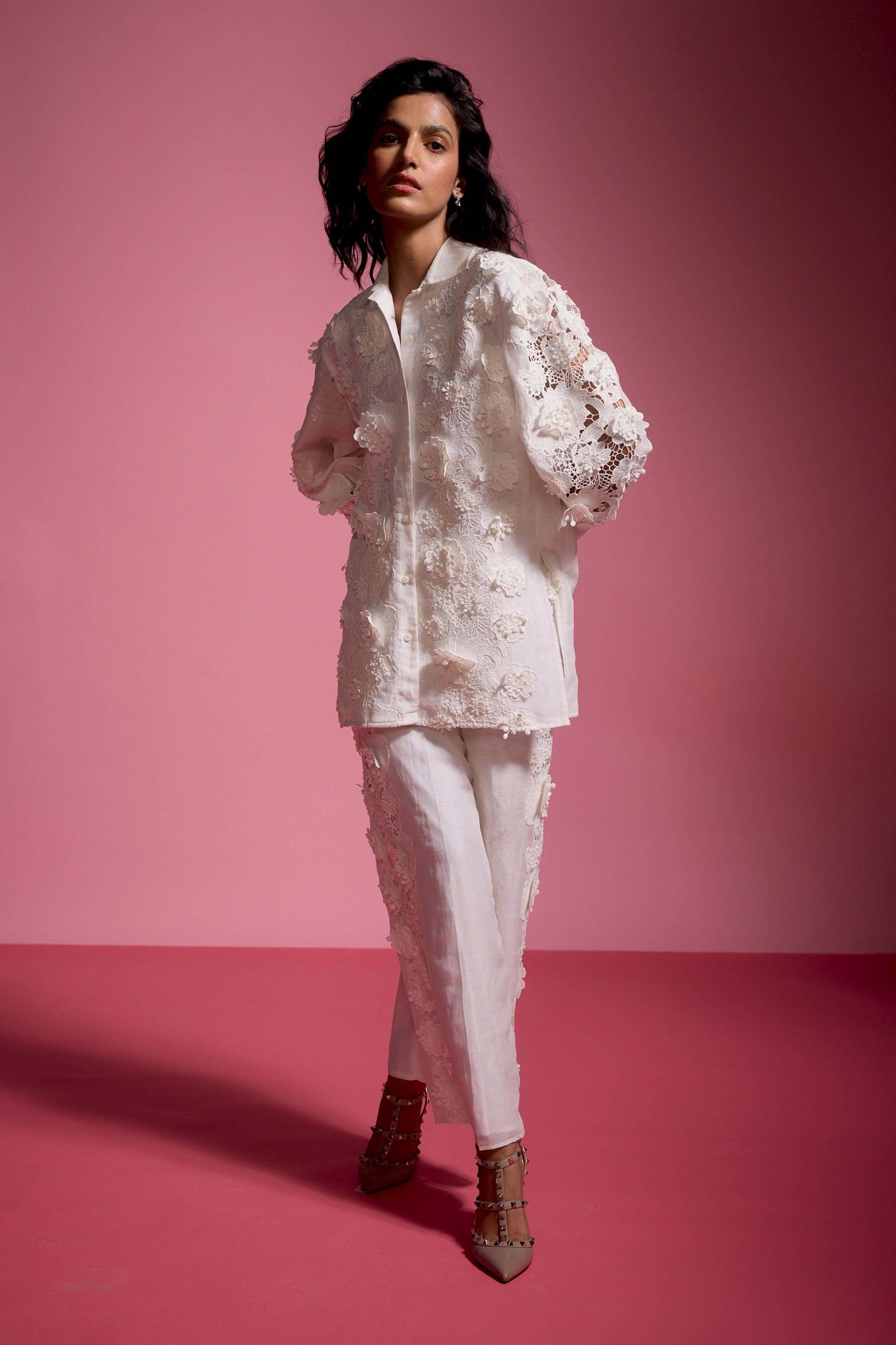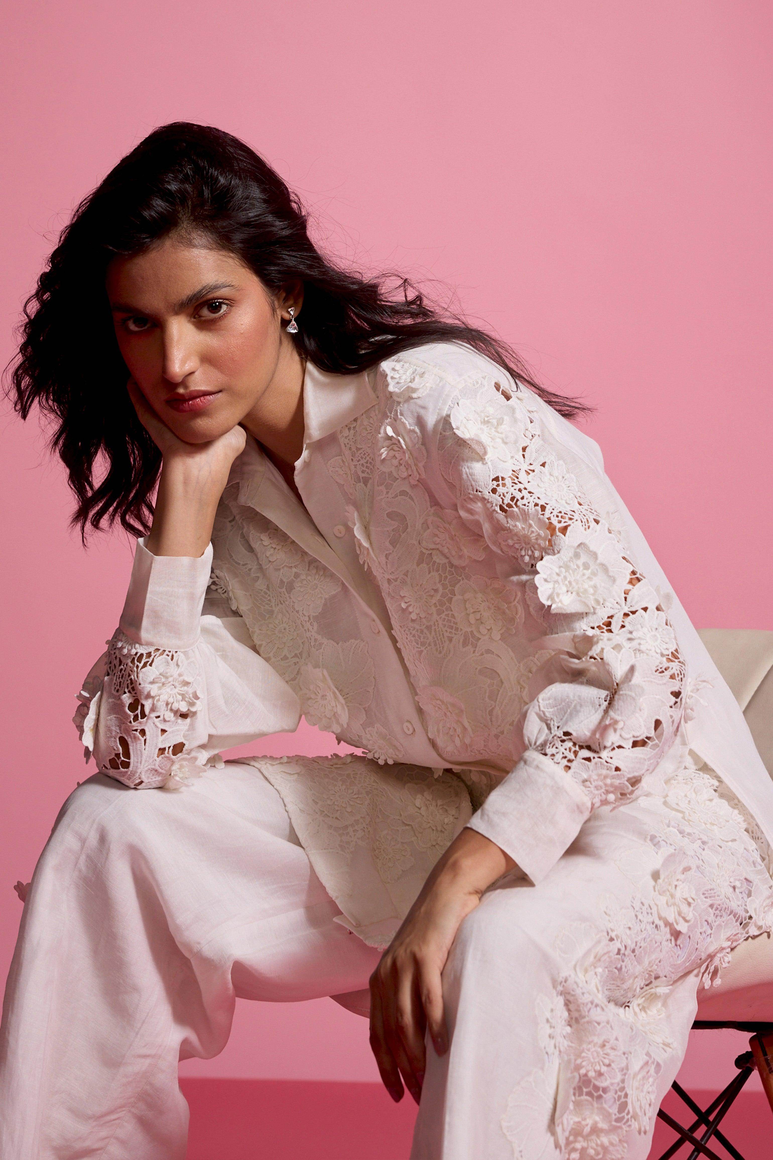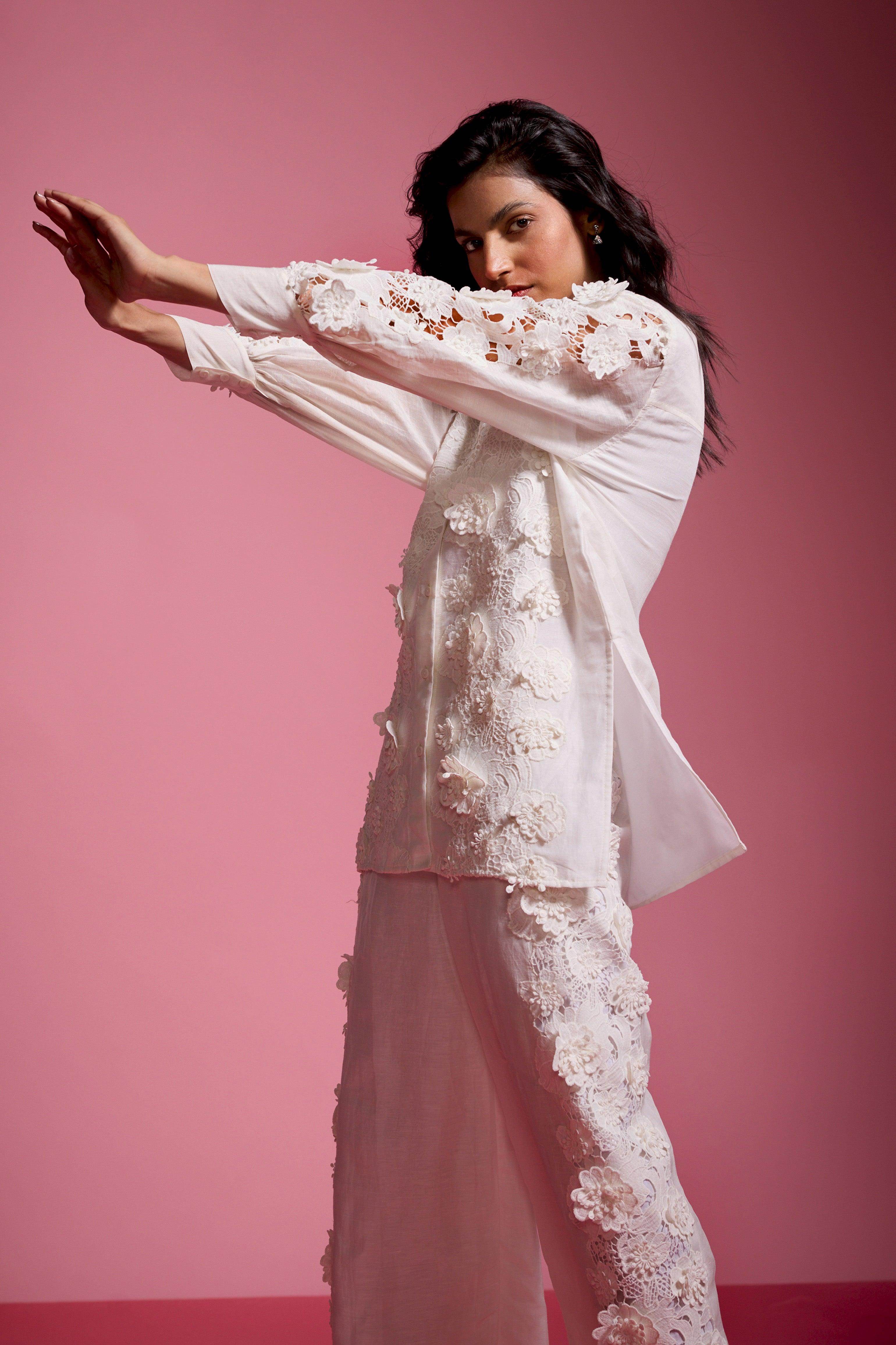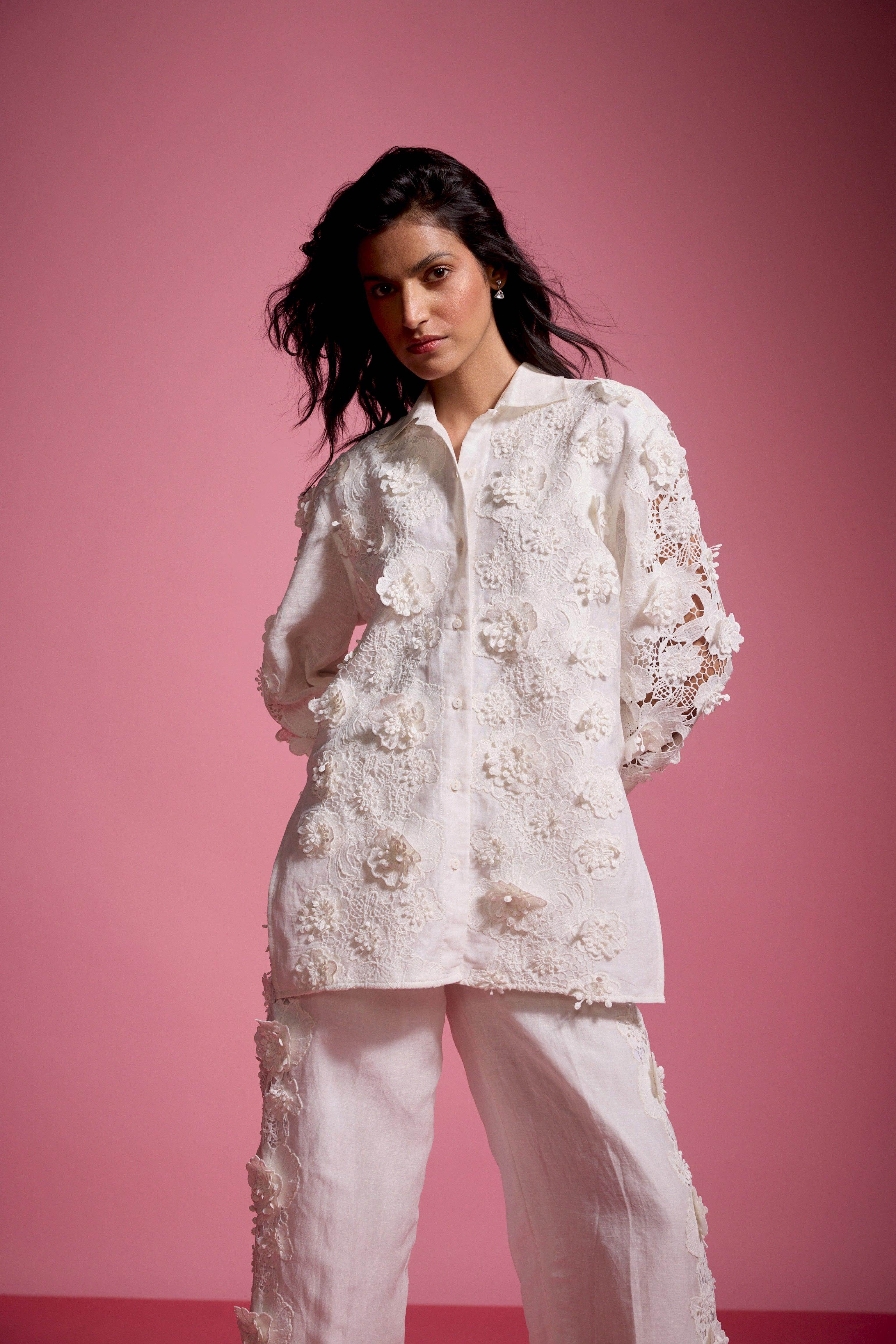 Off-white relaxed fit shirt in a luxurious linen and silk blend. Features 3D cotton floral lace appliqué on the front and sleeves. Lined front and back. Long bishop sleeves, shirt collar, button-down front, and side slits. Paired with Off-white relaxed fit pants in a luxurious linen and silk blend. Features 3D cotton floral lace appliqué on the side seams. Fully lined. Semi-elasticated waist with front hook-and-eye and zip closure.
