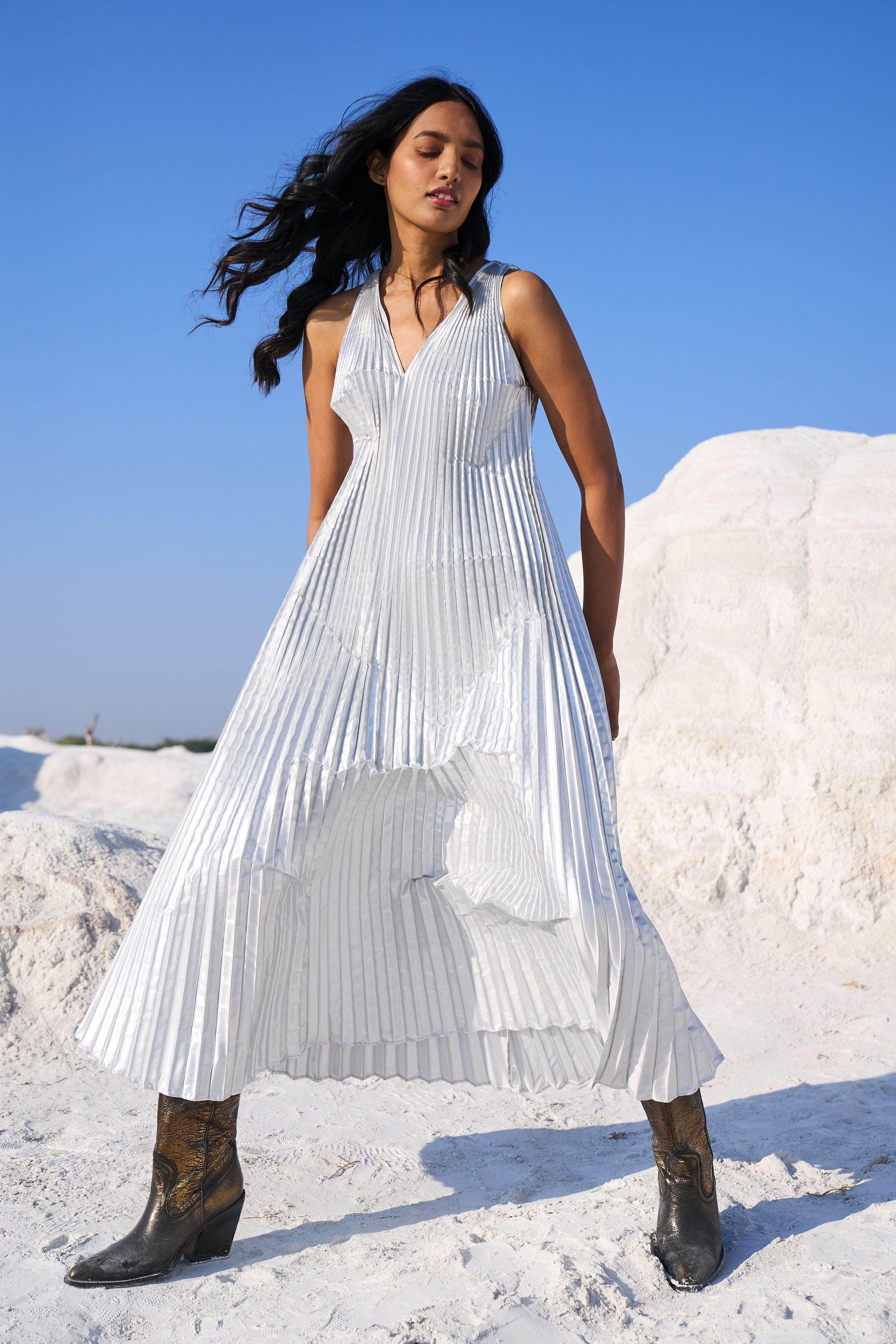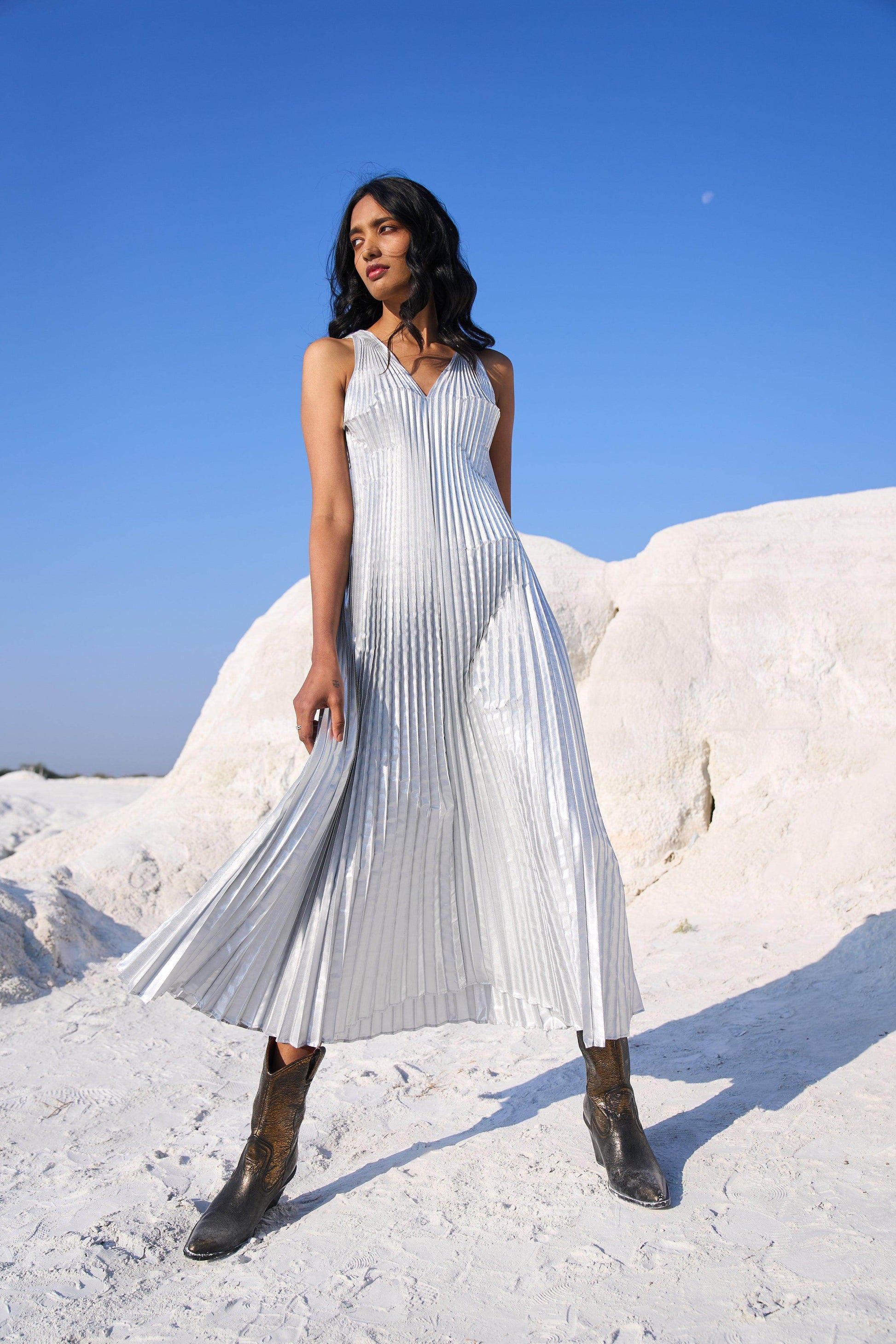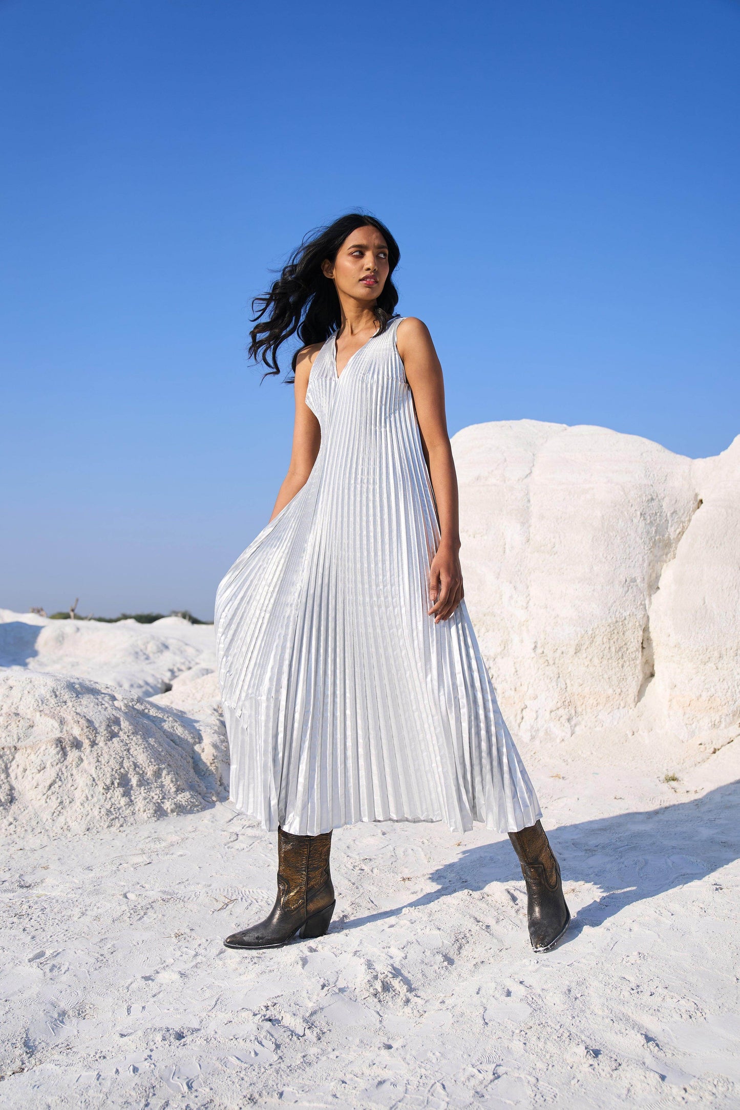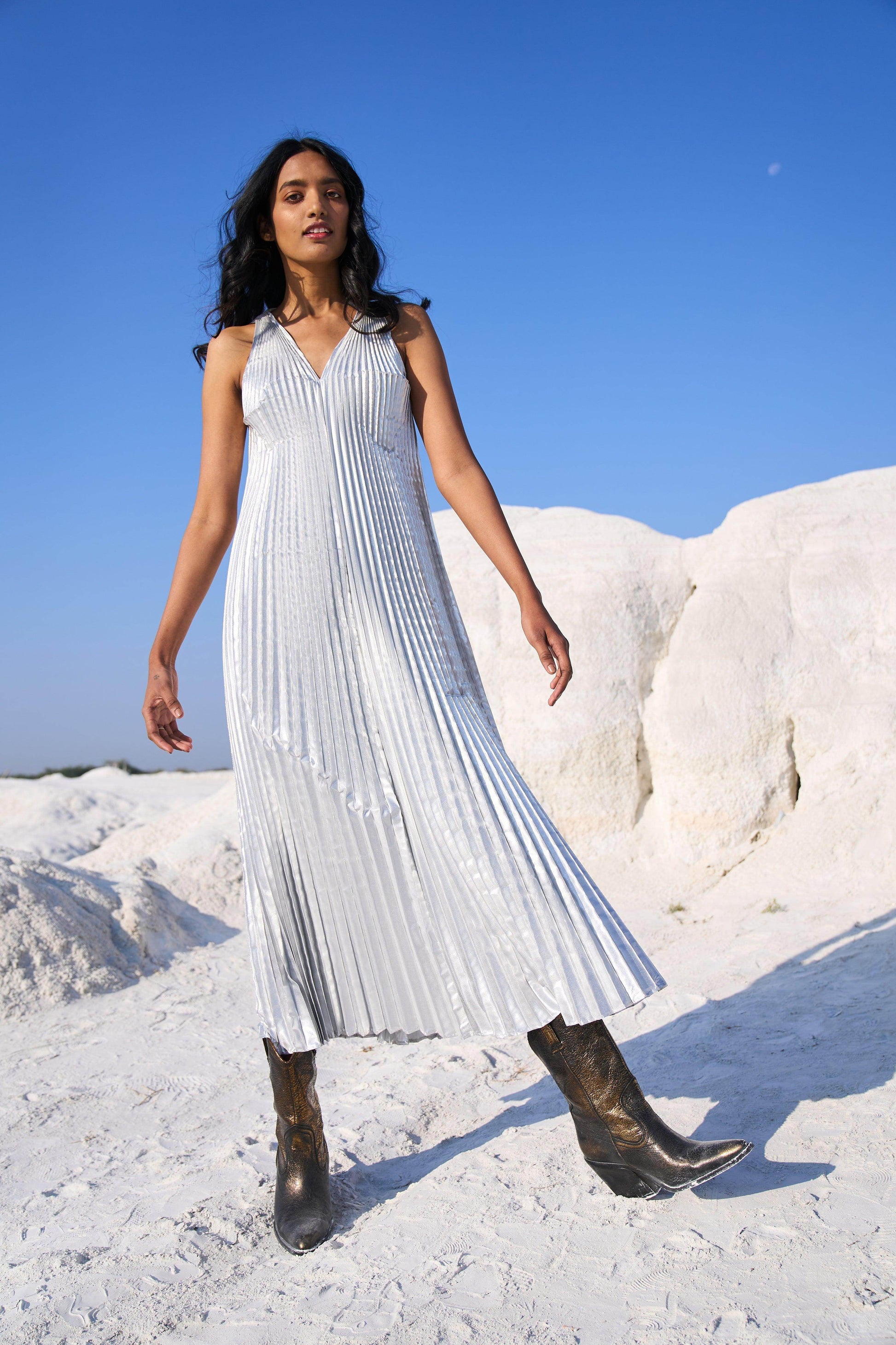 Silver sunray pleated maxi dress in a shimmering lamé fabric. Pleats open out to add volume at the hem. V-neck.