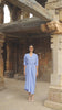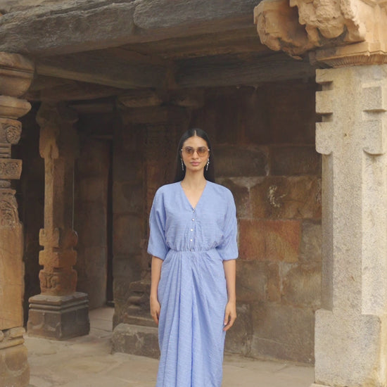 Textured and crinkled midi dress with 3/4th sleeves and V-neck with silver snap buttons for closure in the front. Dolman sleeves with an elasticated cuff. Draped and pleated with a high/low hem. Fully lined.