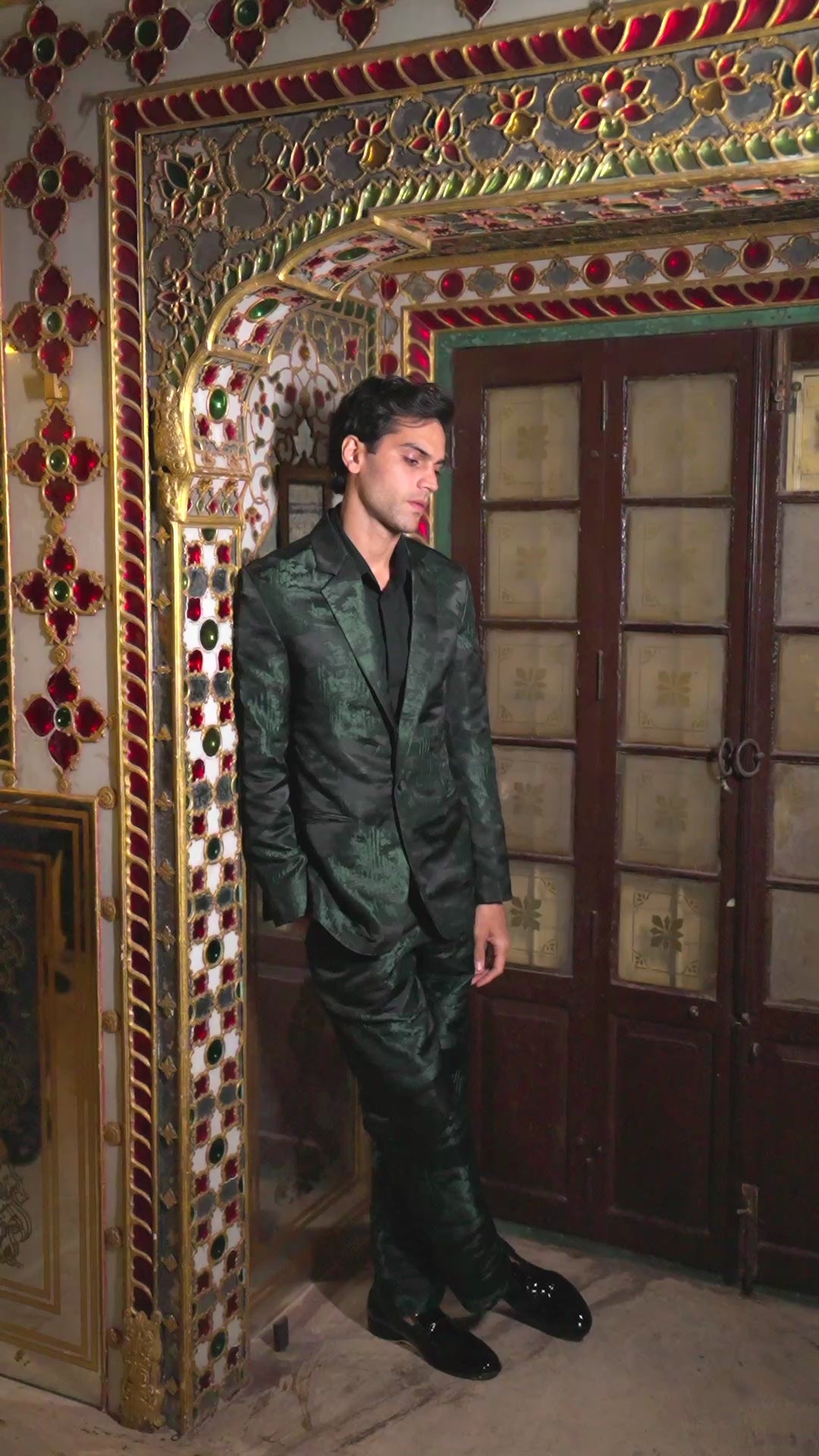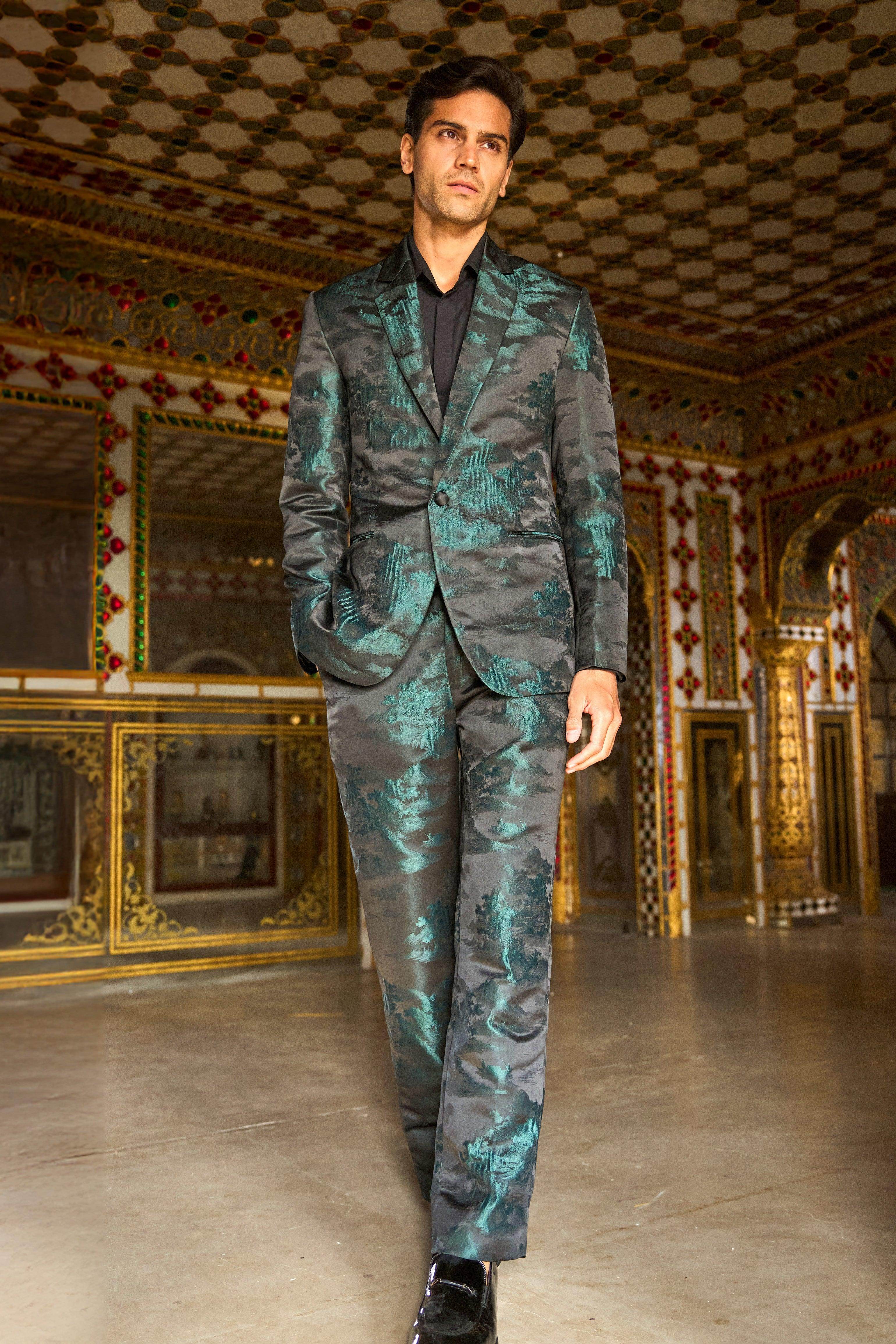 Straight cut pant in an abstract landscape toile de jouy pattern. Made in soft summer brocade with tones of green and black. Hook and zip closure at the front with belt loops at the waist. Pockets in the side and back.