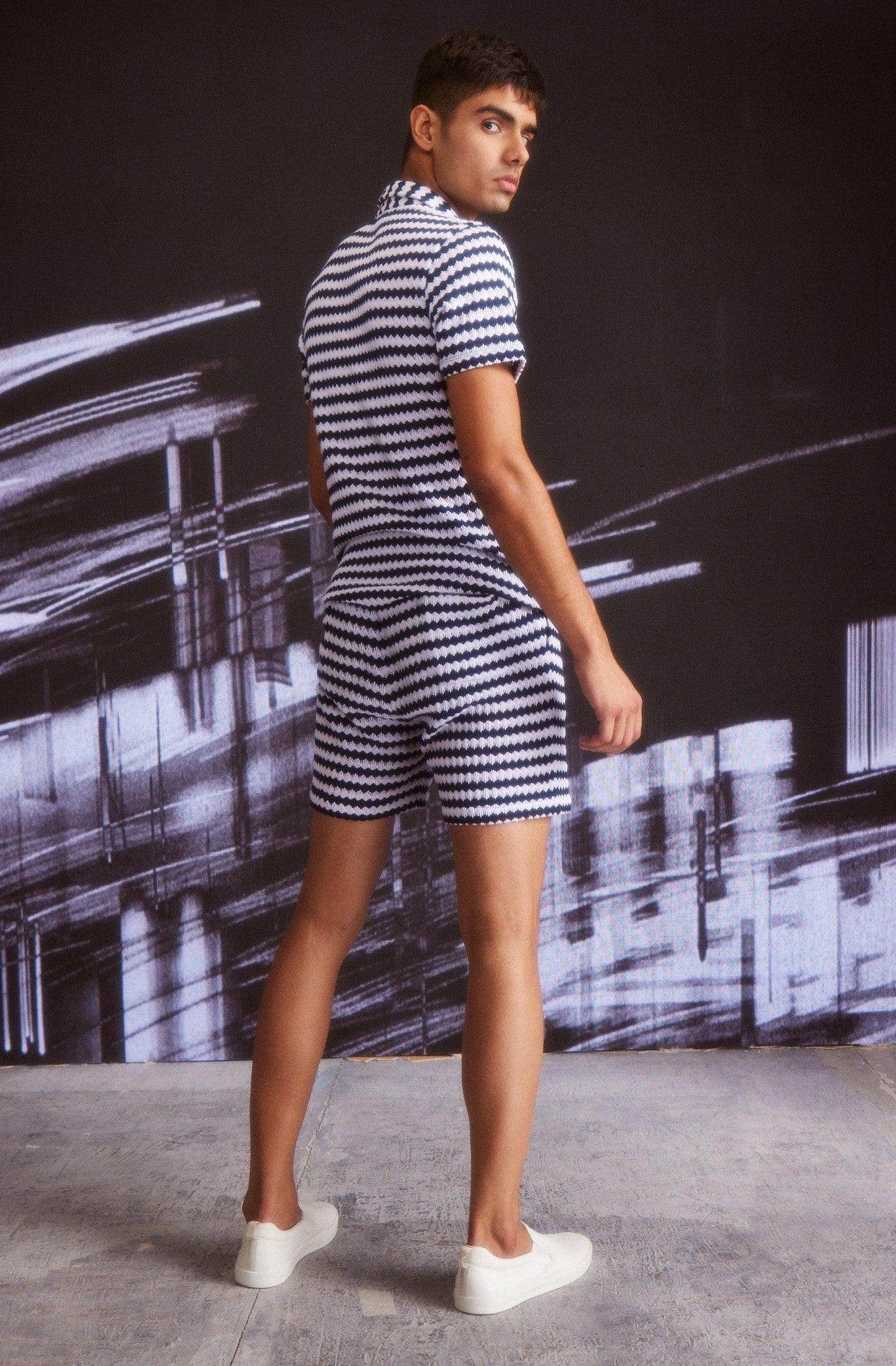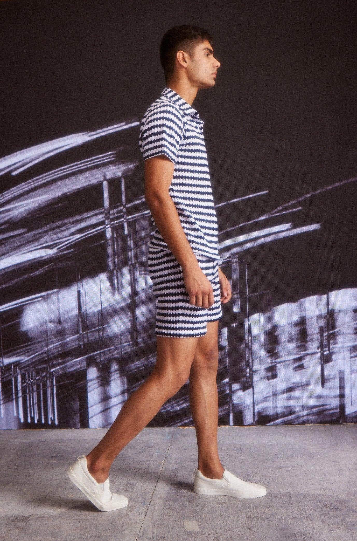 Organic cotton popover polo in textured knitted navy and white stripe fabric. Paired with matching shorts. Pockets on the side and back. Semi-elasticated at the waist. Hook and eye closure at the front. Zip fly.