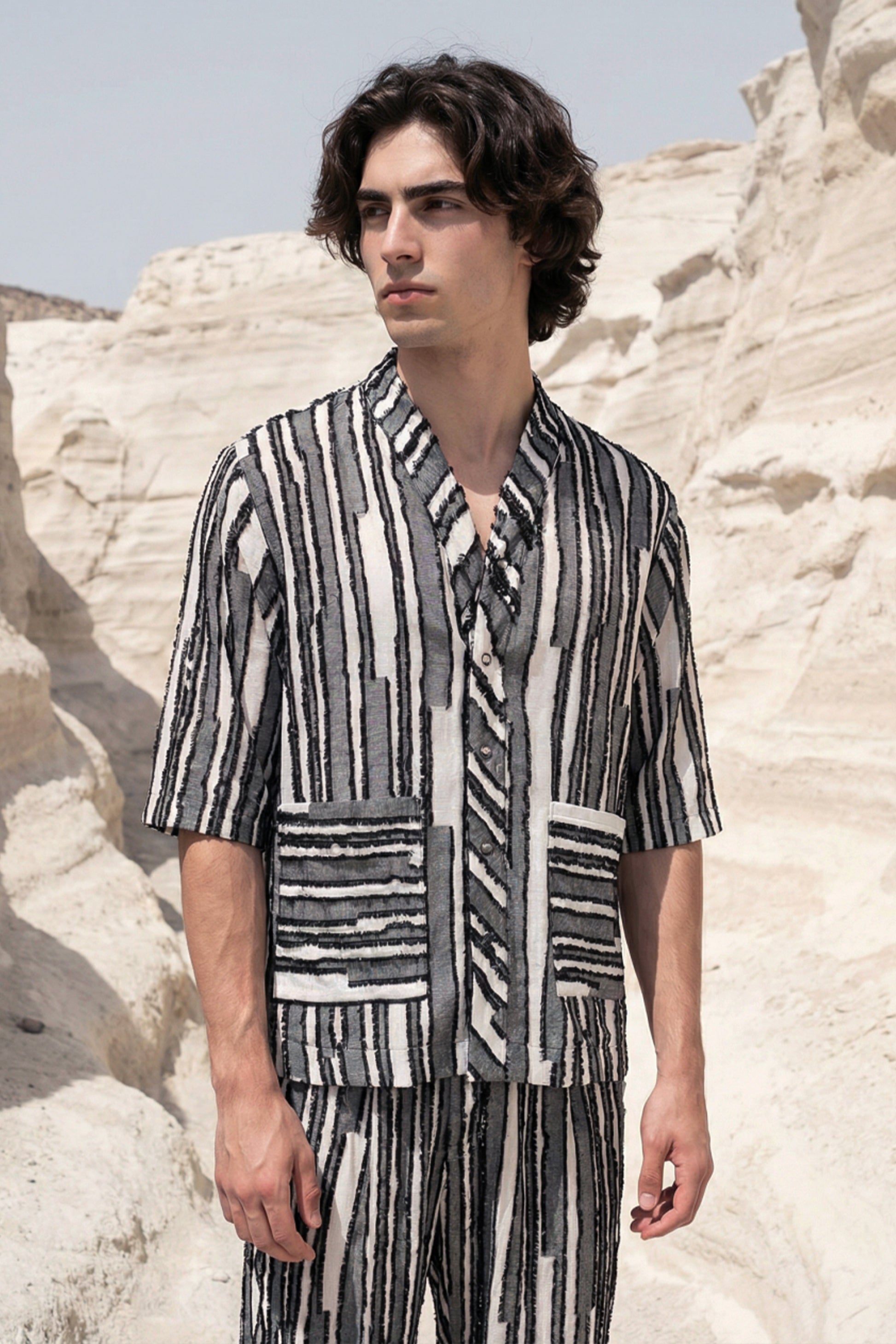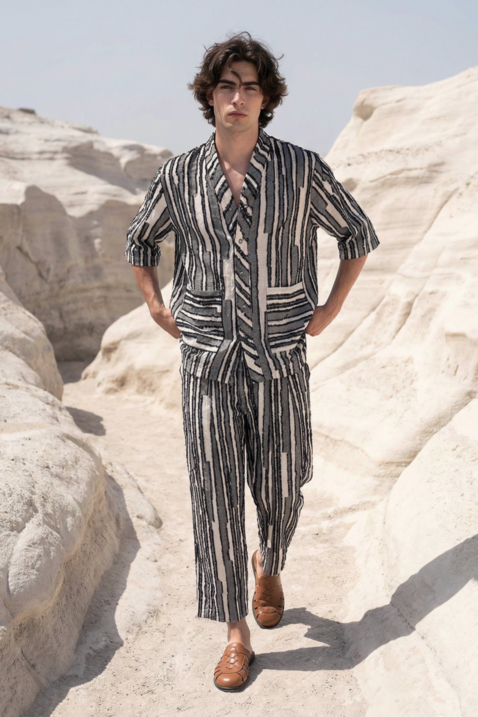 Monochrome black, grey and white irregular striped pant with frayed edges. Belt loops at the waist with concealed zip and hook closure at the waist. Pockets in the sides.