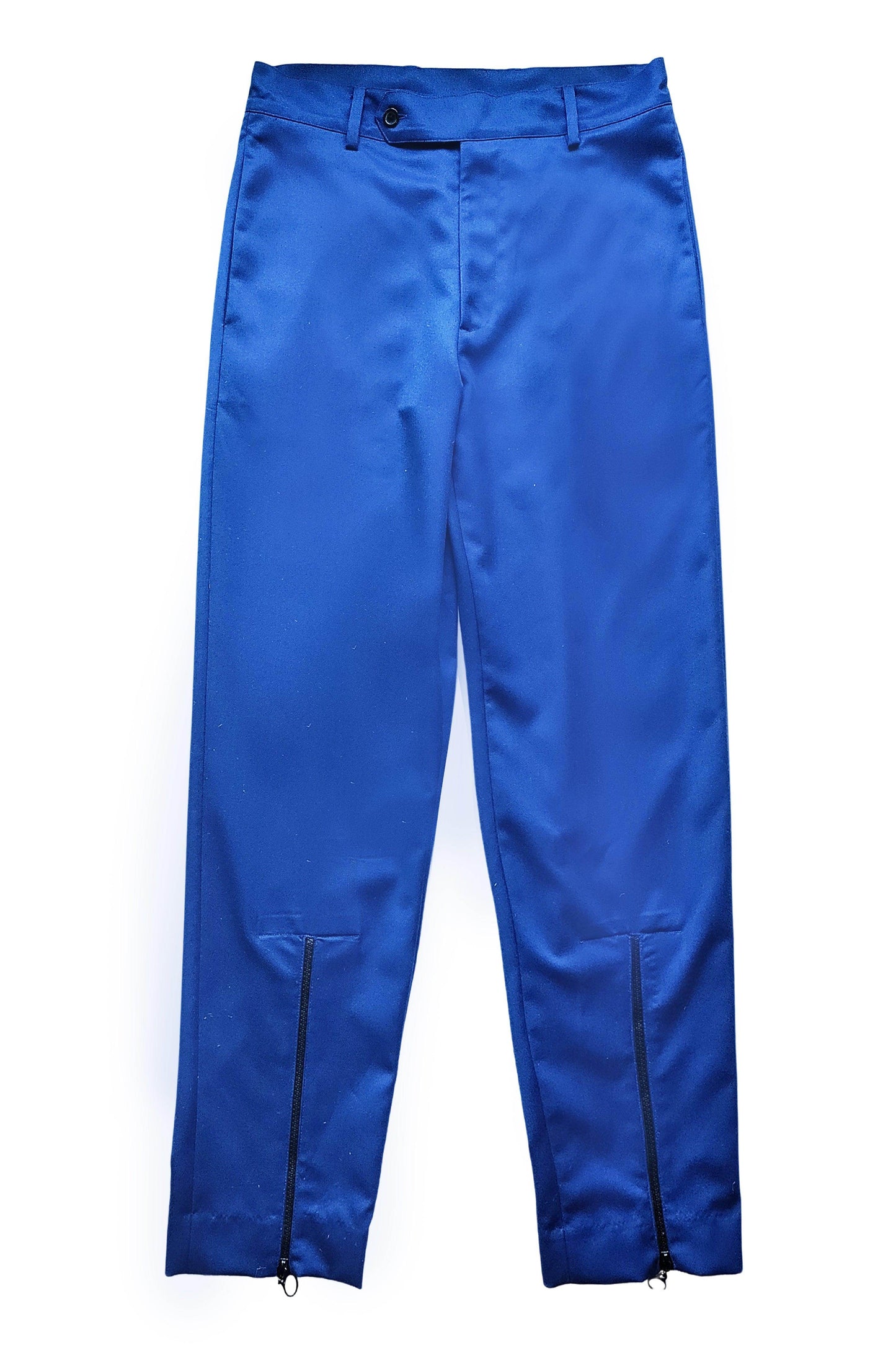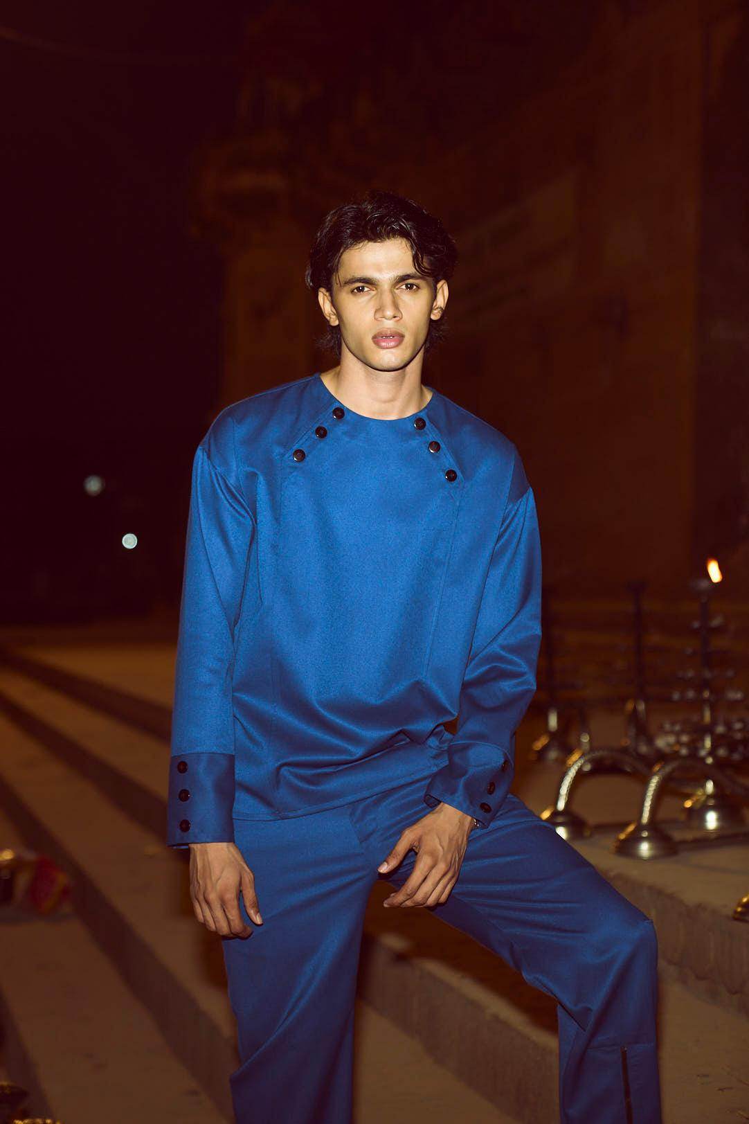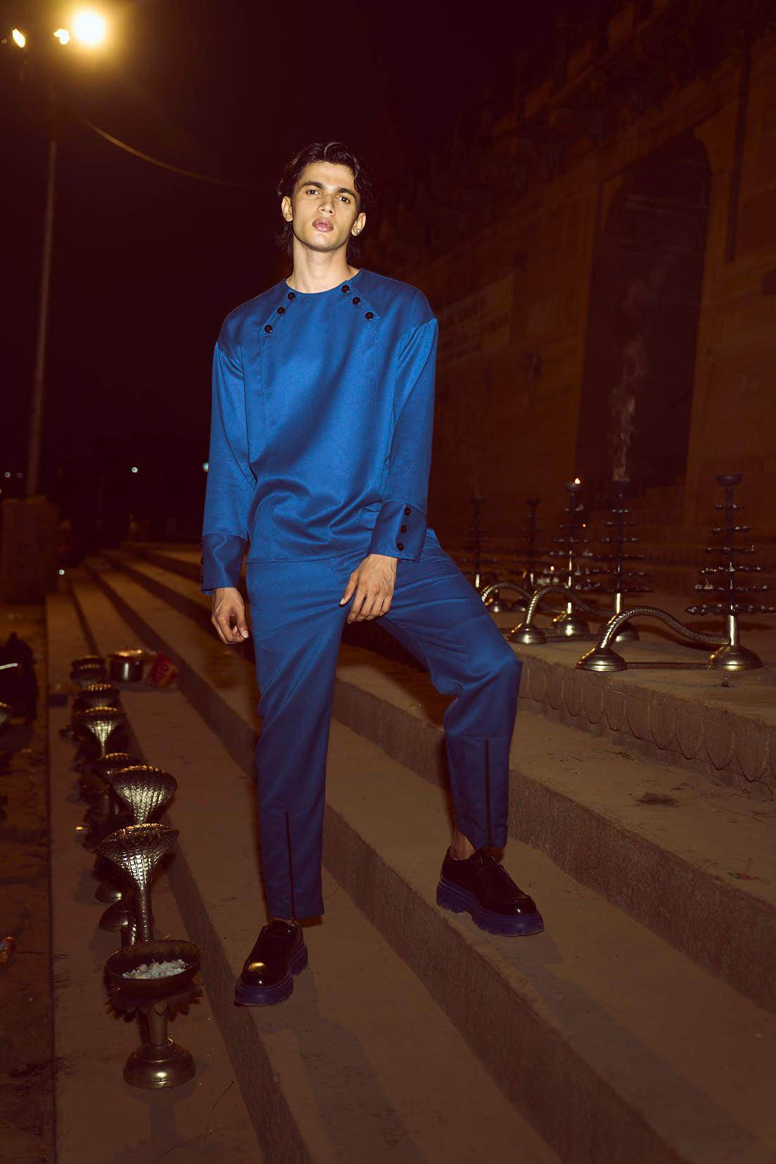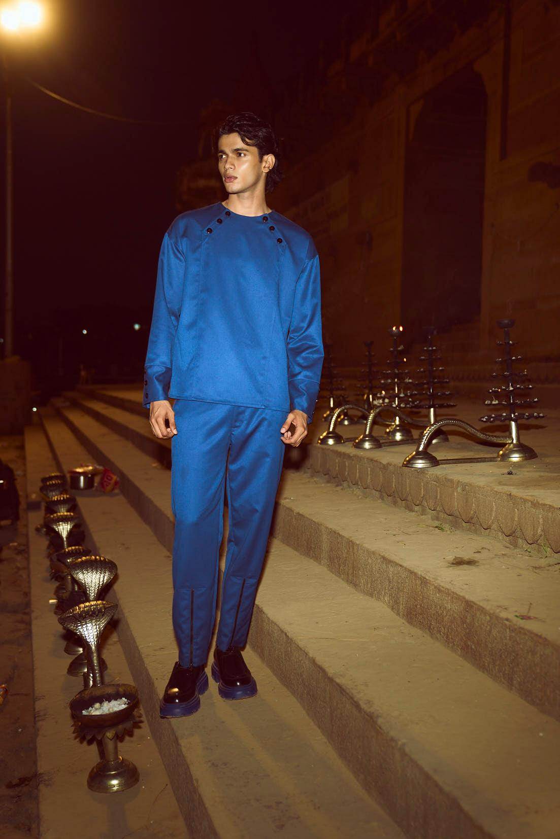 Blue pant set in all weather suiting material. Round neck with diagonally placed button placket on both sides of the neckline. Buttons can be worn all closed, partially open, or entirely open. Mock front attach panel. Long sleeves with three show buttons at the cuffs. Regular fit. Paired with matching zip at the cuffs. Wear it 2 ways, zipped up for a straight fit, or unzipped for wide-leg. Pockets on the side and back. Hook and zip closure at the front. Belt loops.