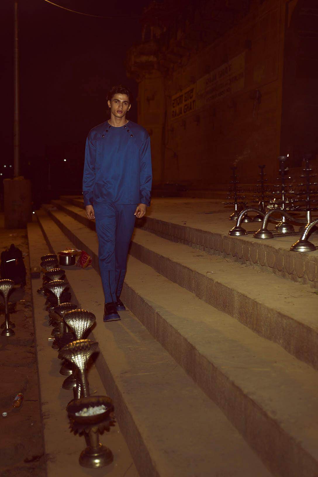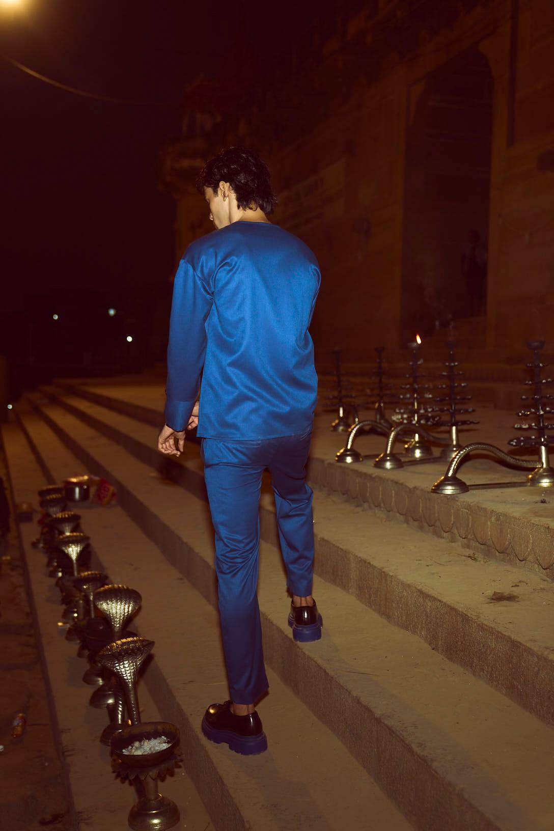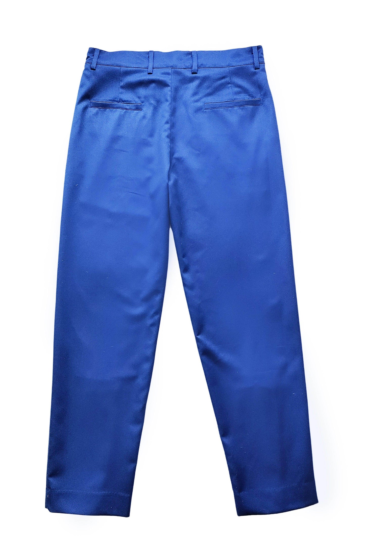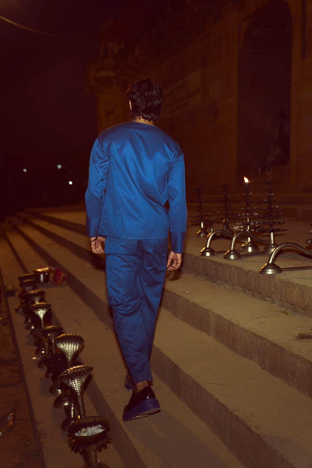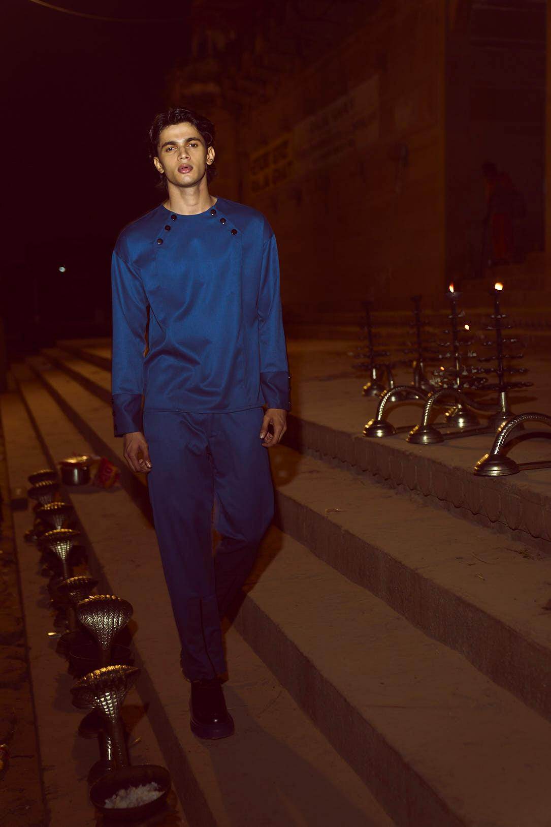 Blue pant set in all weather suiting material. Round neck with diagonally placed button placket on both sides of the neckline. Buttons can be worn all closed, partially open, or entirely open. Mock front attach panel. Long sleeves with three show buttons at the cuffs. Regular fit. Paired with matching zip at the cuffs. Wear it 2 ways, zipped up for a straight fit, or unzipped for wide-leg. Pockets on the side and back. Hook and zip closure at the front. Belt loops.