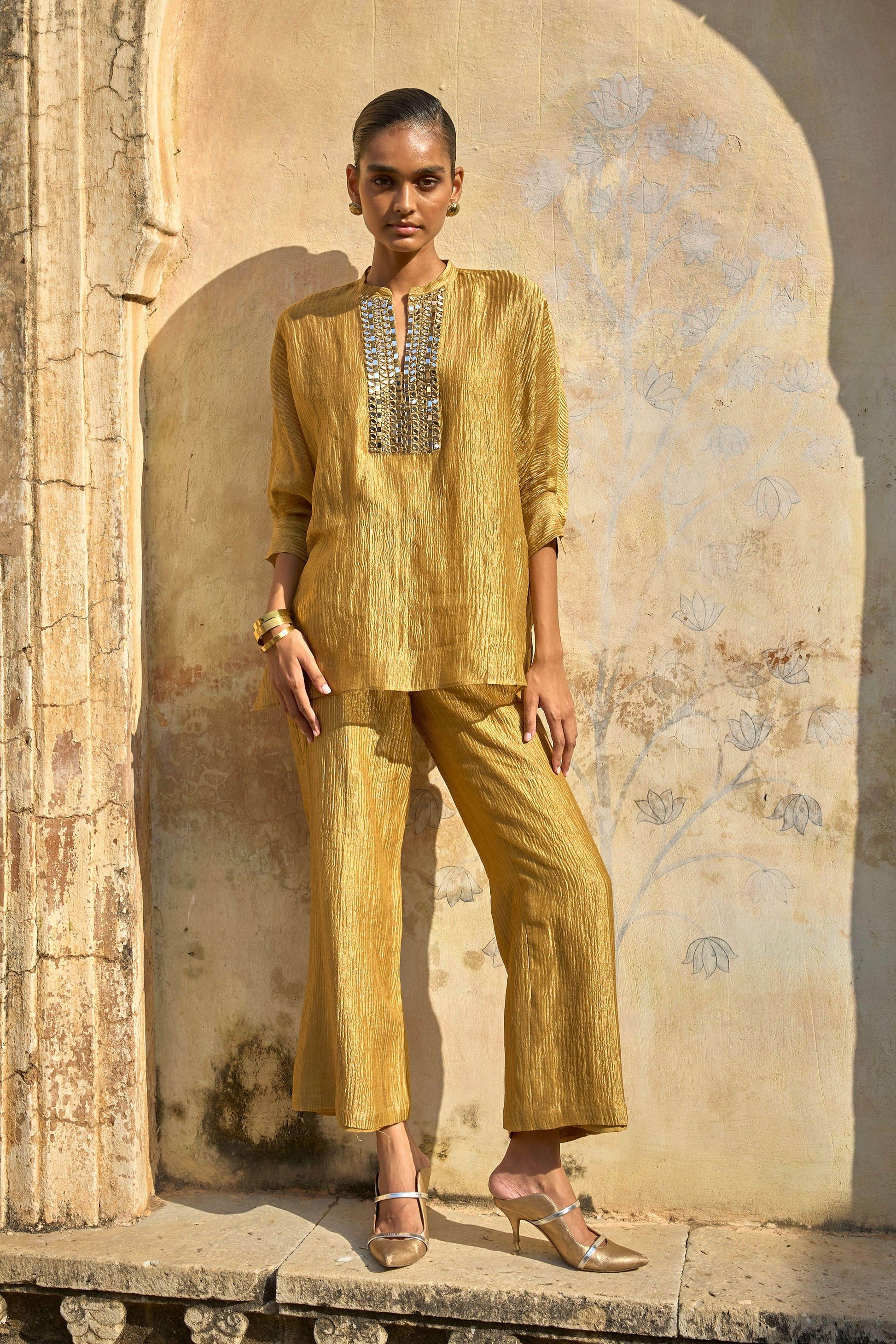 Straight cut pant in soft crinkled gold tissue/ Semi elasticated at the waist with hook/eye and zip closure on the side. Garment is fully lined.