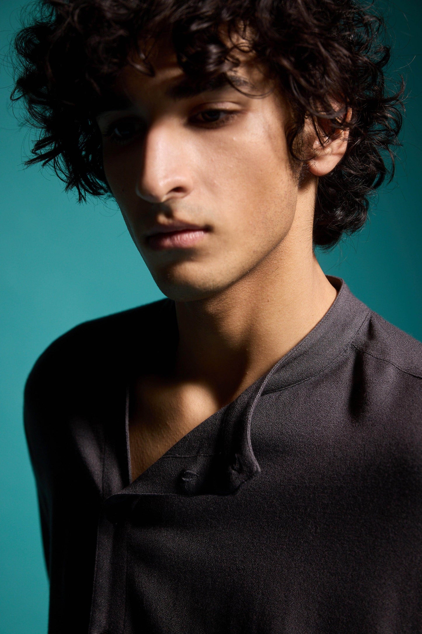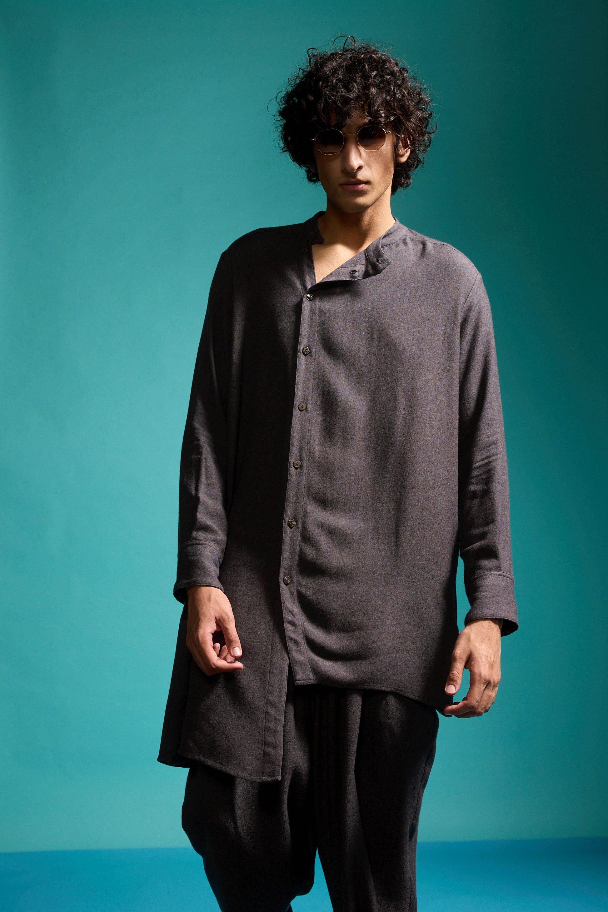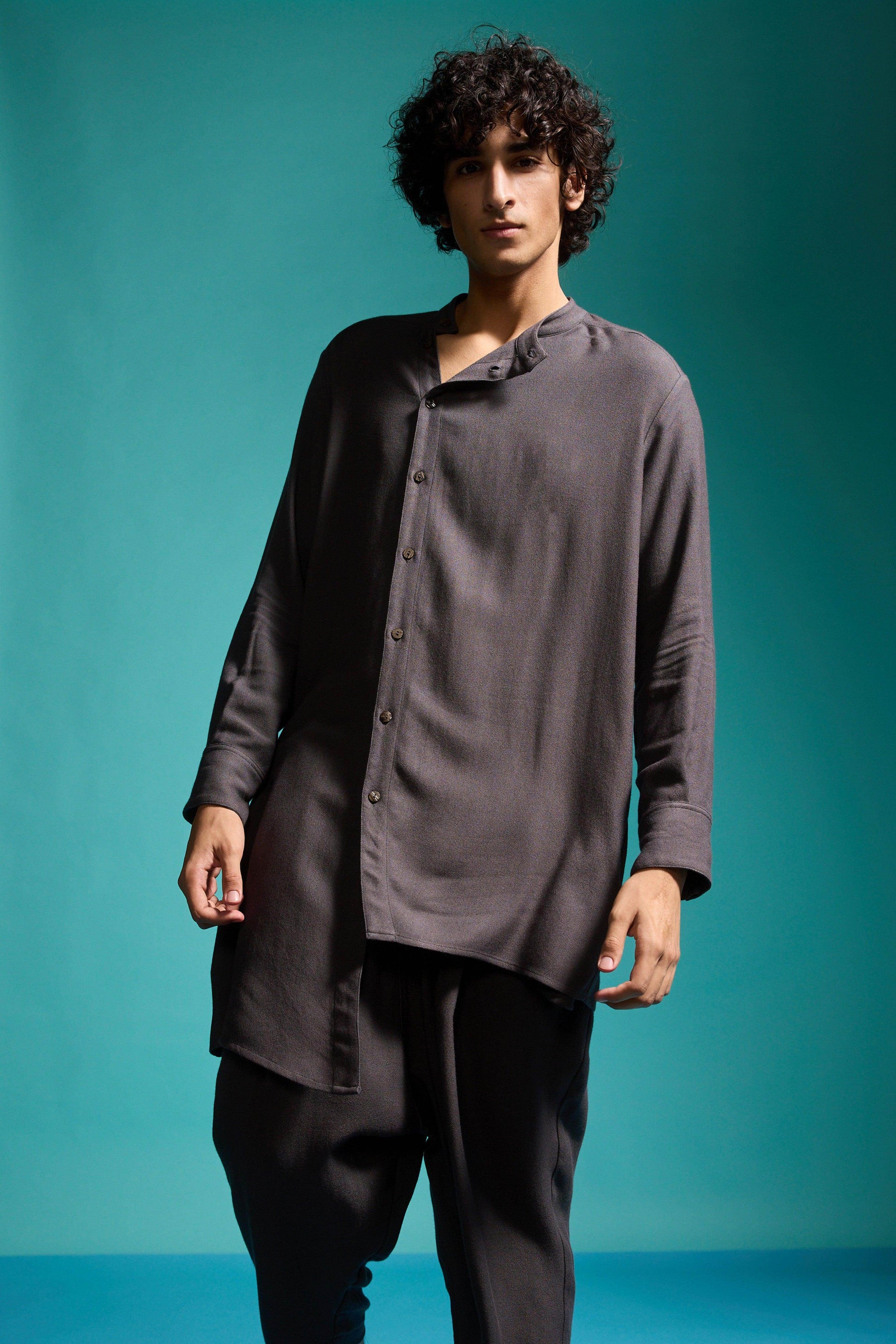 Grey longline shirt in textured, natural, breathable organic viscose. Features an off-center button-down placket, band collar, and full sleeves. Uneven hemlines in the front and back. Paired with Grey architectural pants in textured, natural, breathable organic viscose. Hand-sewn pleats in the front. Elasticated waistband with drawstrings and belt loops. Side and back pockets. Cropped length.