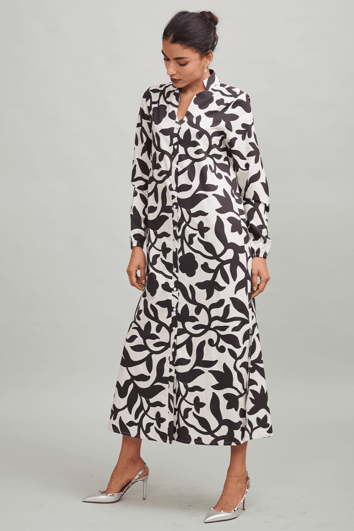 Black and white printed cotton poplin shirt dress. Band collar, Y-shaped neck, button-down front, full sleeves.