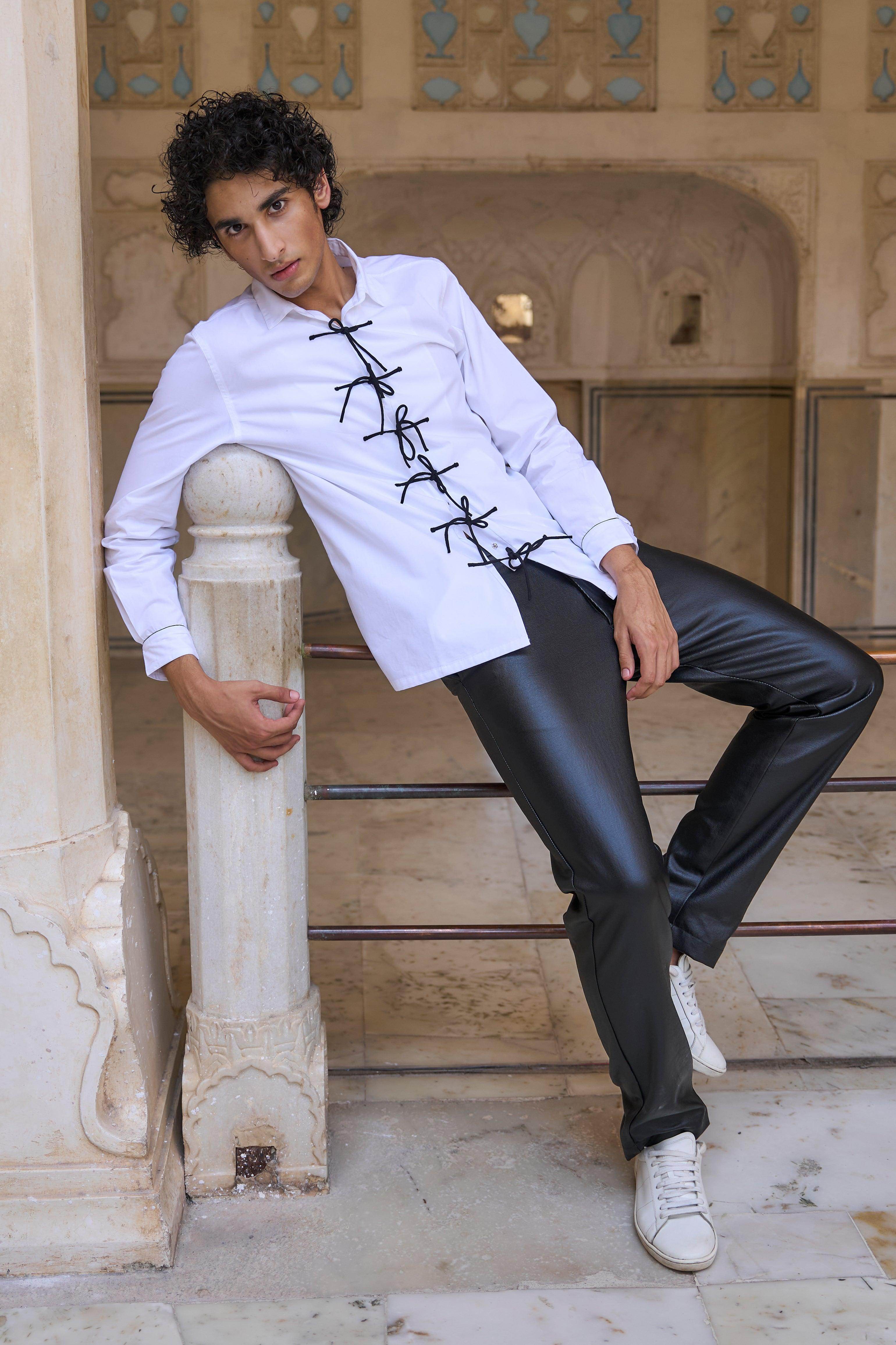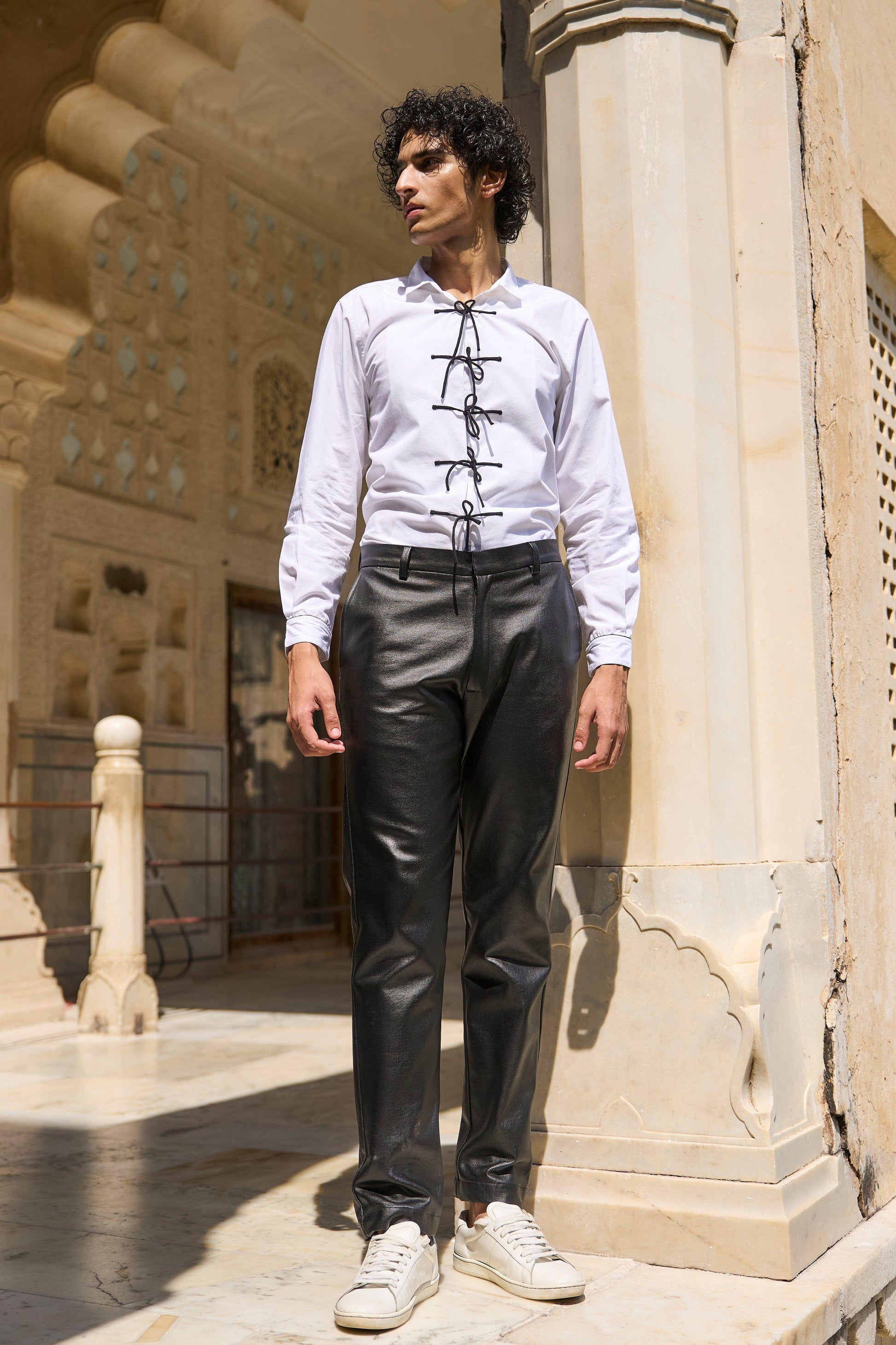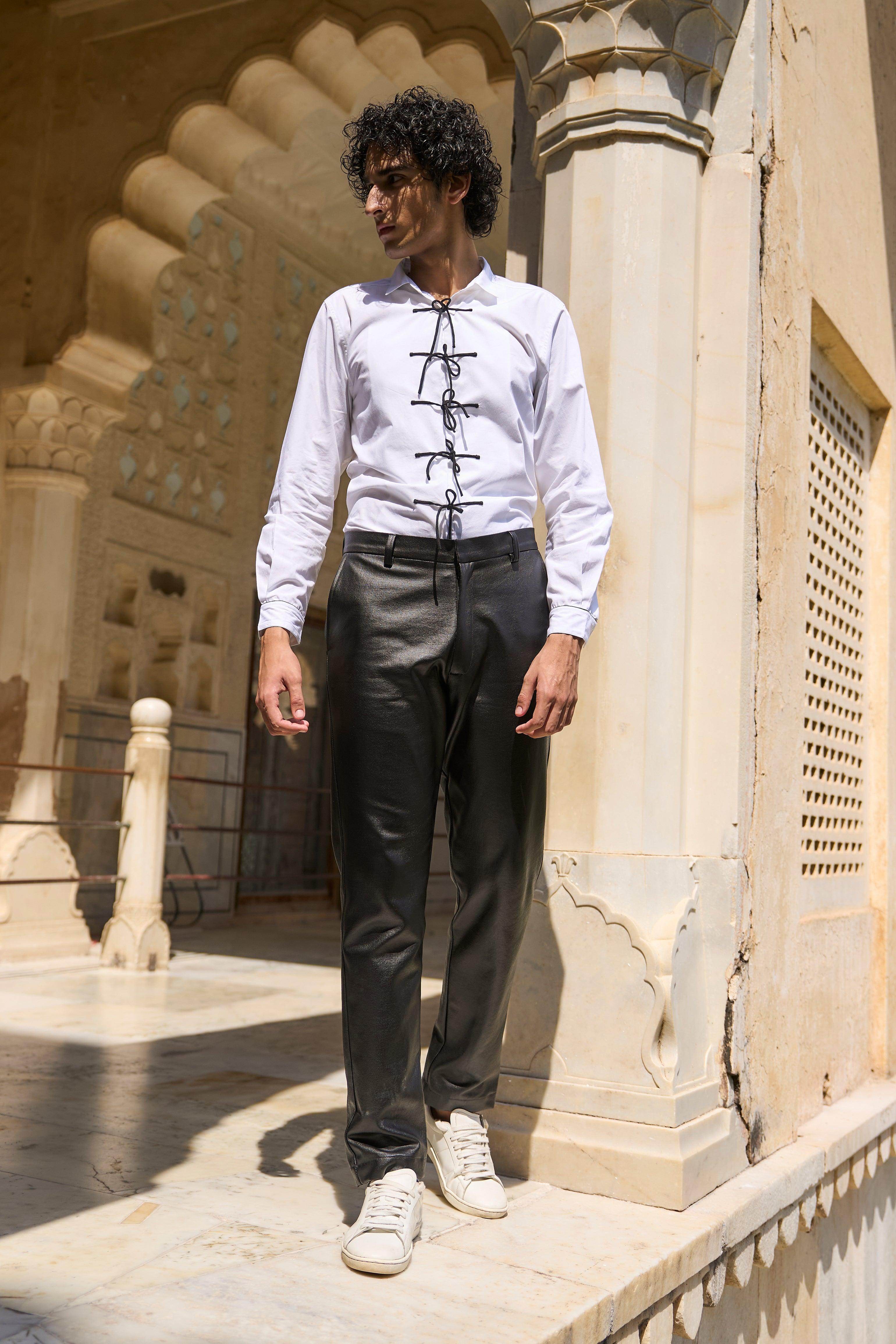 Waxed black denim jean. Pockets in the side and back. Belt loops, hook/eye and zip closure in the front. Regular fit.