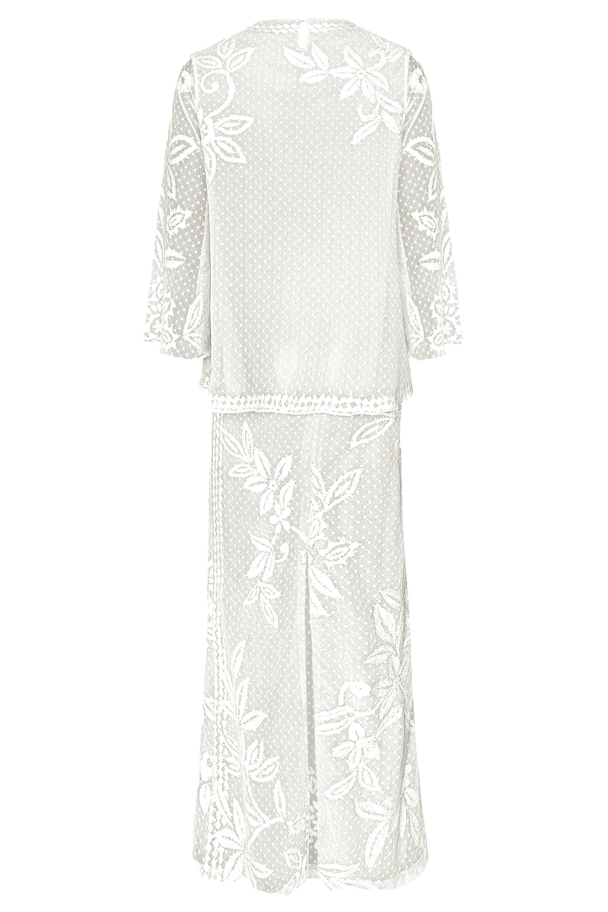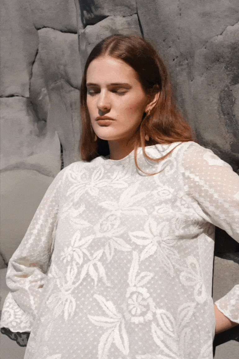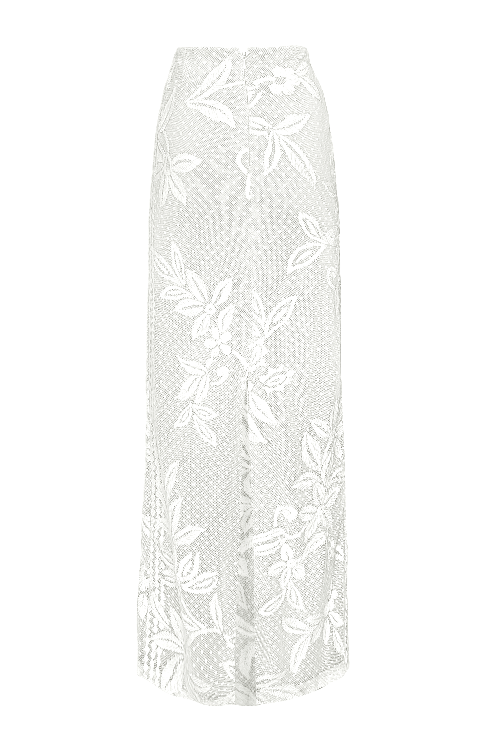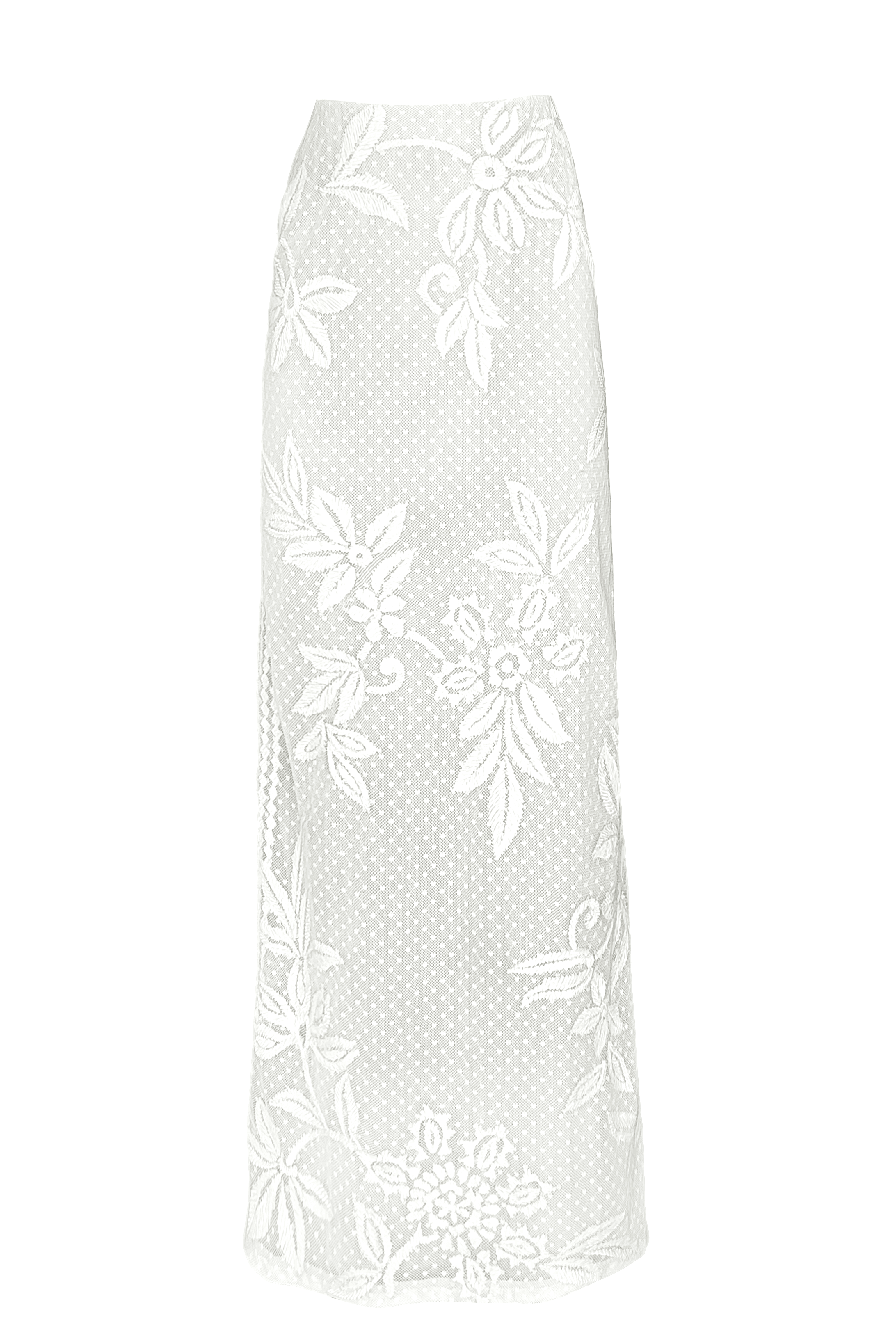 White top and skirt set in soft dotted cotton mesh. Gracefully placed floral ribbon embroidery on the front, back and sleeve of the top. Slight A-line silhouette on the body and bell shape on the sleeve, with a relaxed fit. The top is lined at the front and back in a nude/grey color. Keyhole at the back for closure. Paired with a matching skirt featuring placed floral ribbon embroidery on the front and back with a geometric border strategically framing the sides. Knee-high slit and zip and button closure at the back.