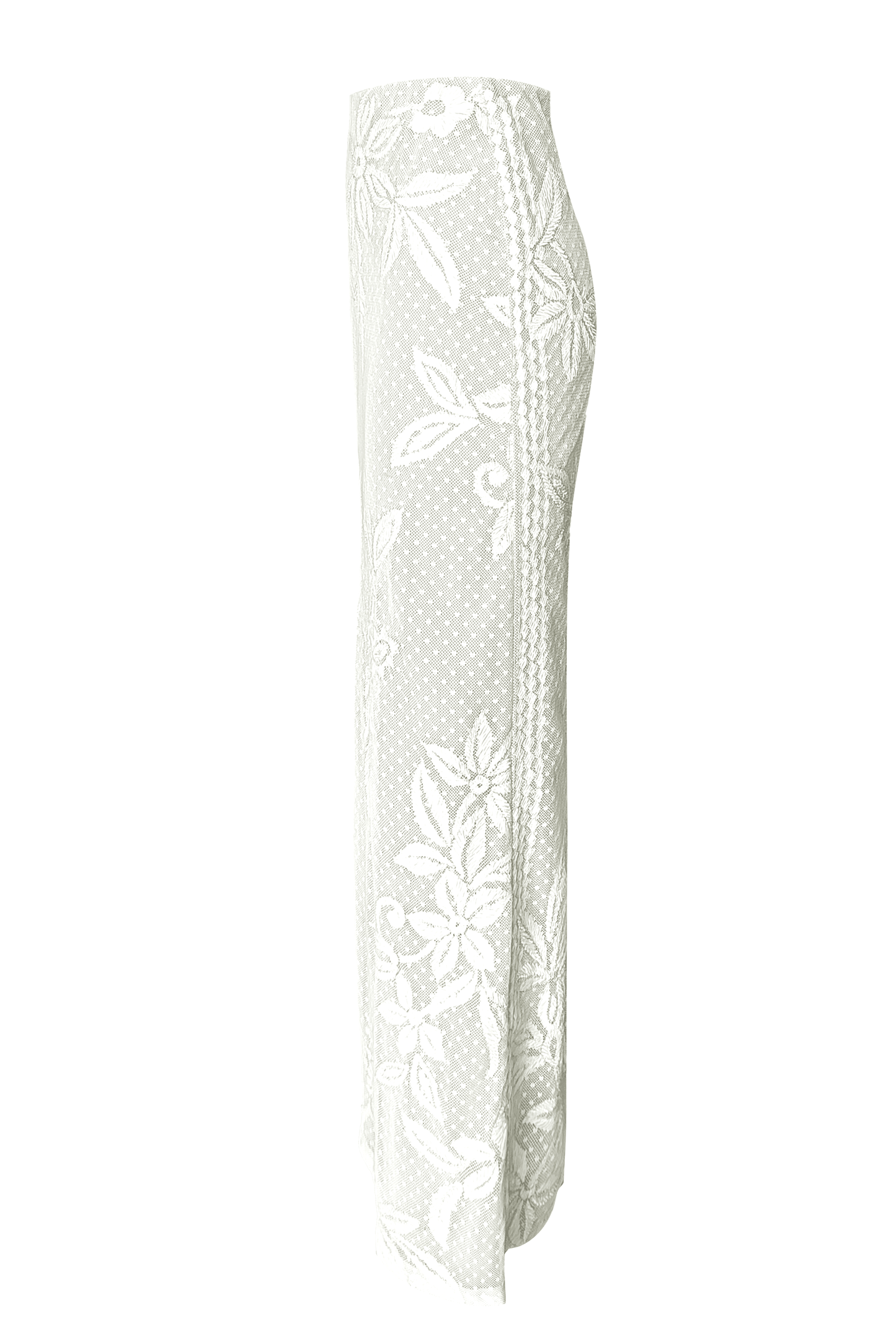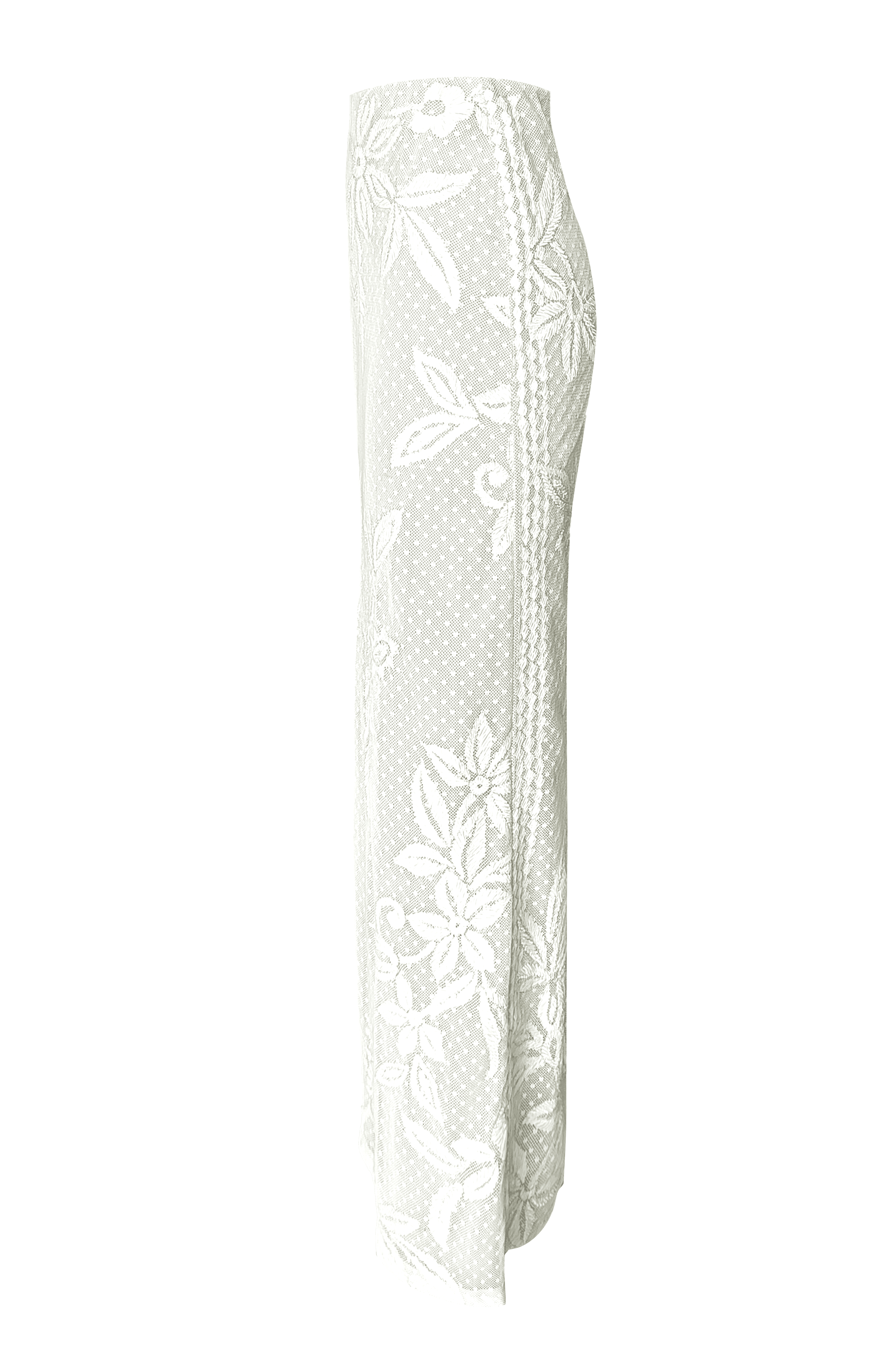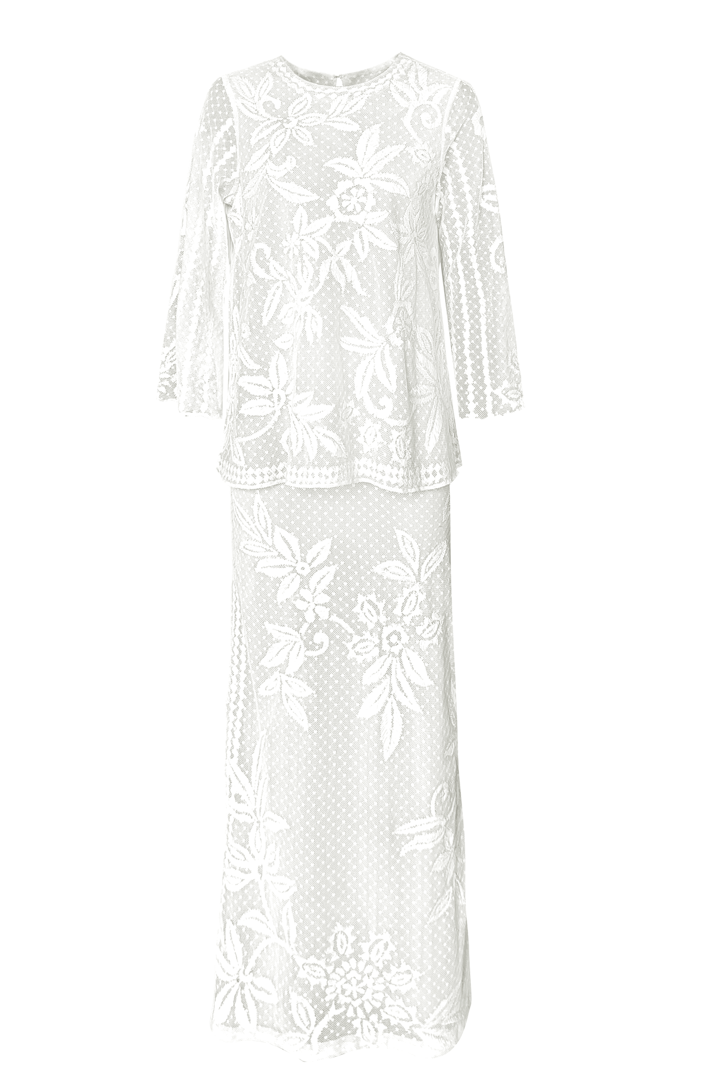 White top and skirt set in soft dotted cotton mesh. Gracefully placed floral ribbon embroidery on the front, back and sleeve of the top. Slight A-line silhouette on the body and bell shape on the sleeve, with a relaxed fit. The top is lined at the front and back in a nude/grey color. Keyhole at the back for closure. Paired with a matching skirt featuring placed floral ribbon embroidery on the front and back with a geometric border strategically framing the sides. Knee-high slit and zip and button closure at the back.